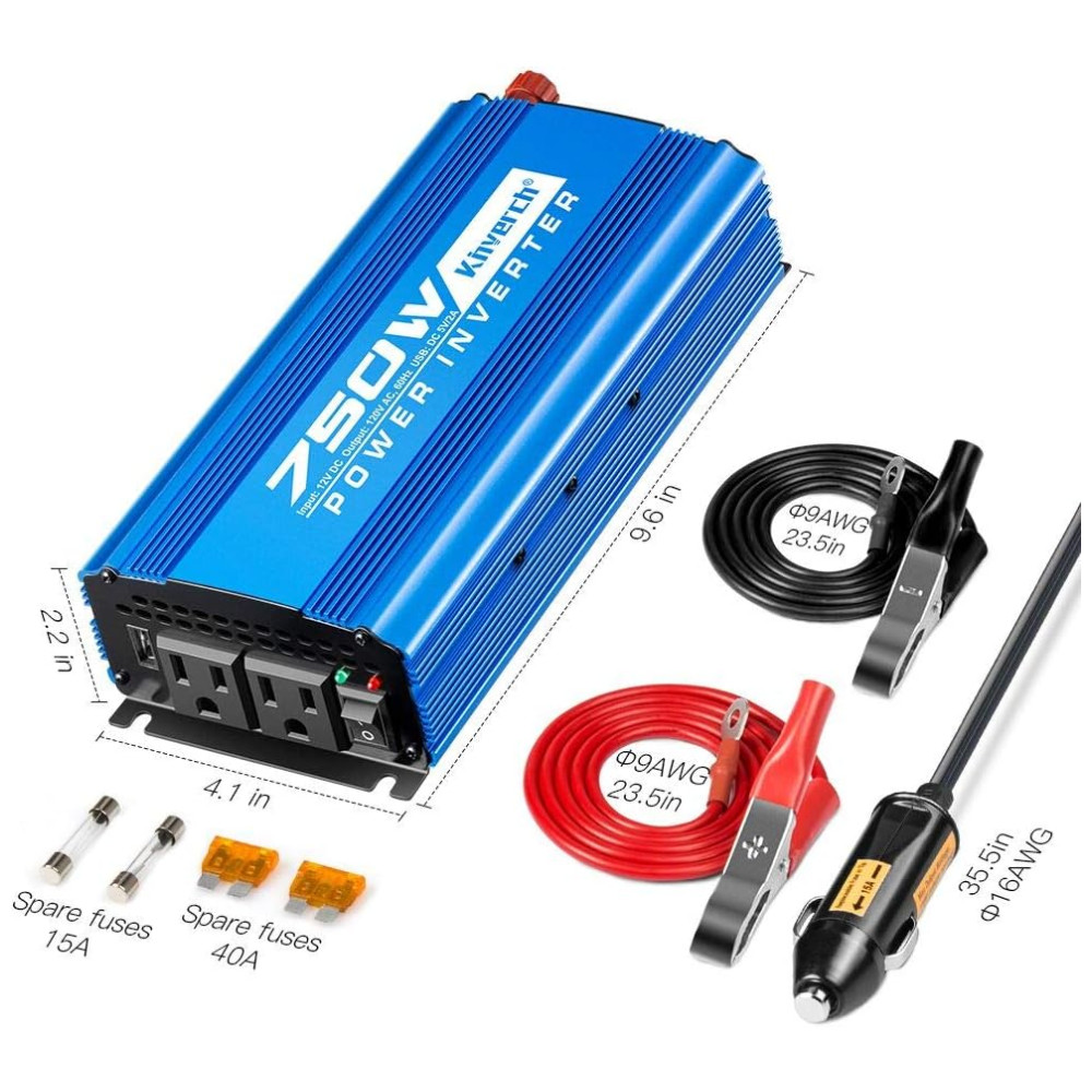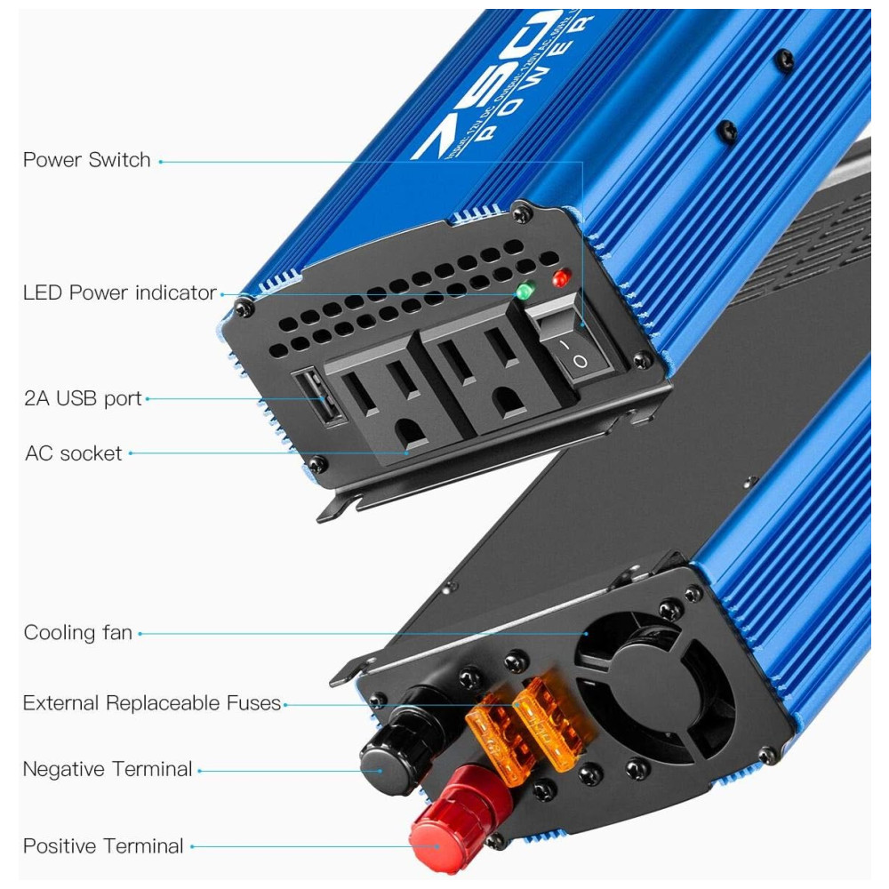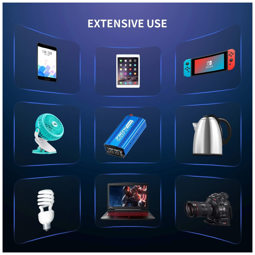 POTENTE E COMPACTO. Fornece potência de pico contínua de 750W e 1500W, reservatório de alumínio leve e extremamente portátil, perfeito para férias, viagens de trabalho e camping ou em qualquer lugar em que a energia seja necessária. APLICATIVO MÚLTIPLO. Projetado com 2 tomadas CA e uma 2A Porta de carregamento USB, ideal para carregar ventilador, videogame, Ipad, câmera digital, TV, furadeira, frigobar e assim por diante. PROTEÇÃO AVANÇADA. Equipado com fusíveis 2 extras de 40A e proteção automática de desligamento contra baixa tensão, sobretensão, sobrecarga, curto circuito e temperatura excessiva. Os ventiladores inteligentes só funcionam quando as cargas aumentam, o que também garante uma experiência de uso ultra silenciosa. O que esta incluso 1 inversor de energia de 750W, 1 plugue de isqueiro, 2 clipes de bateria, 2 fusíveis, 1 Manual do Usuário
