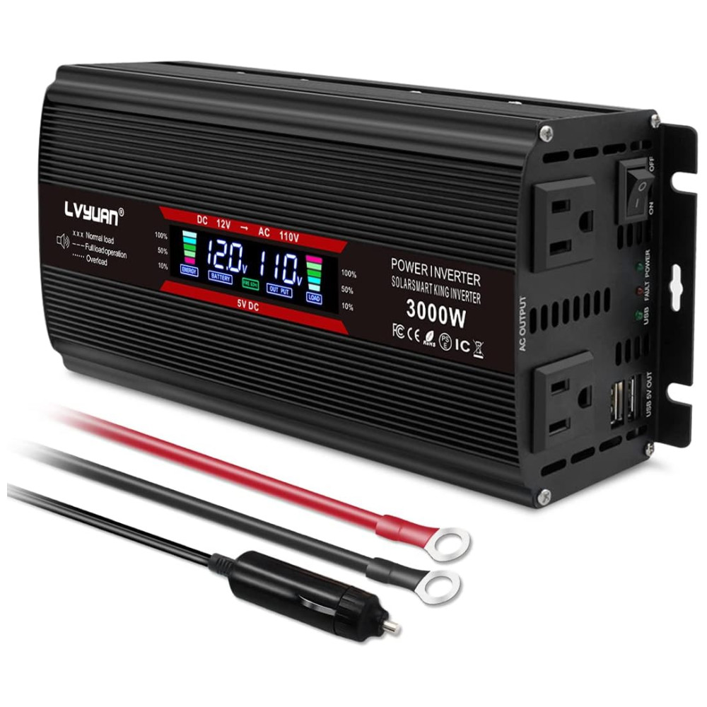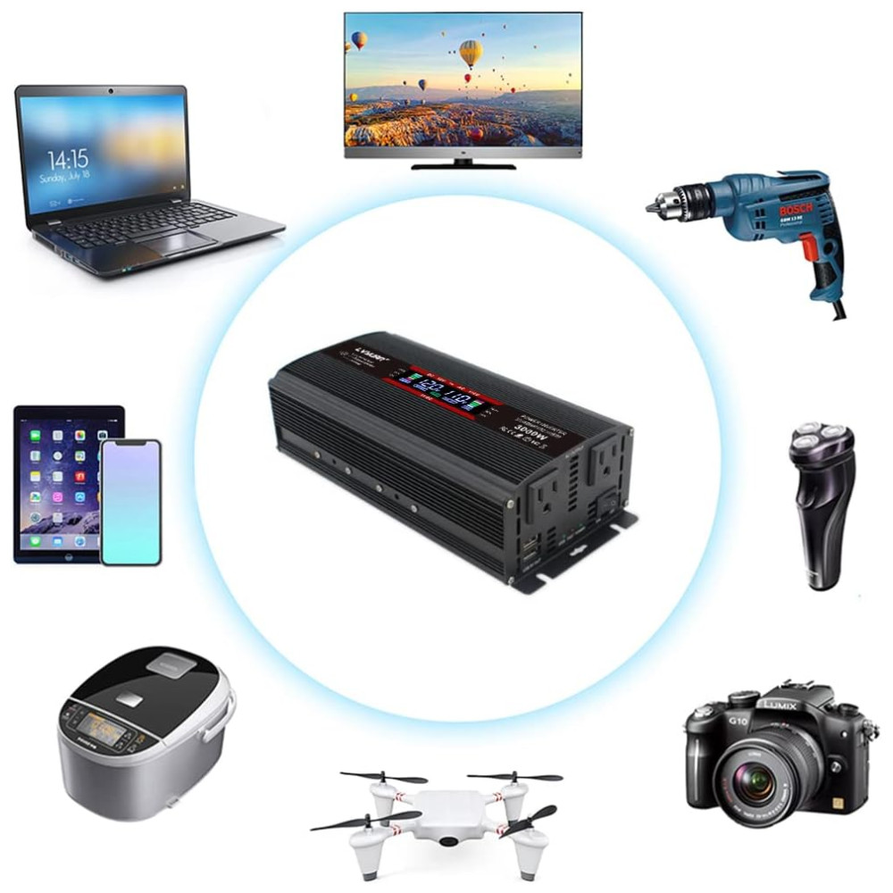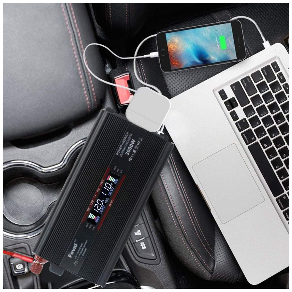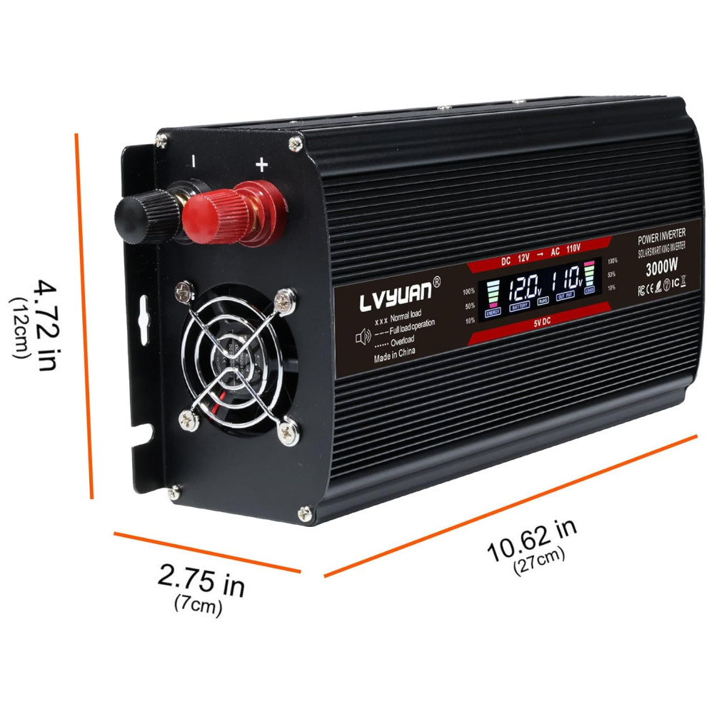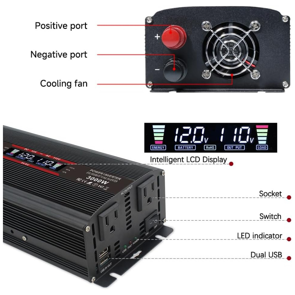 Inversor de Potência Automotivo 3000W Display LCD Inteligente Tomadas e USB Duplos YINLEADER Preto