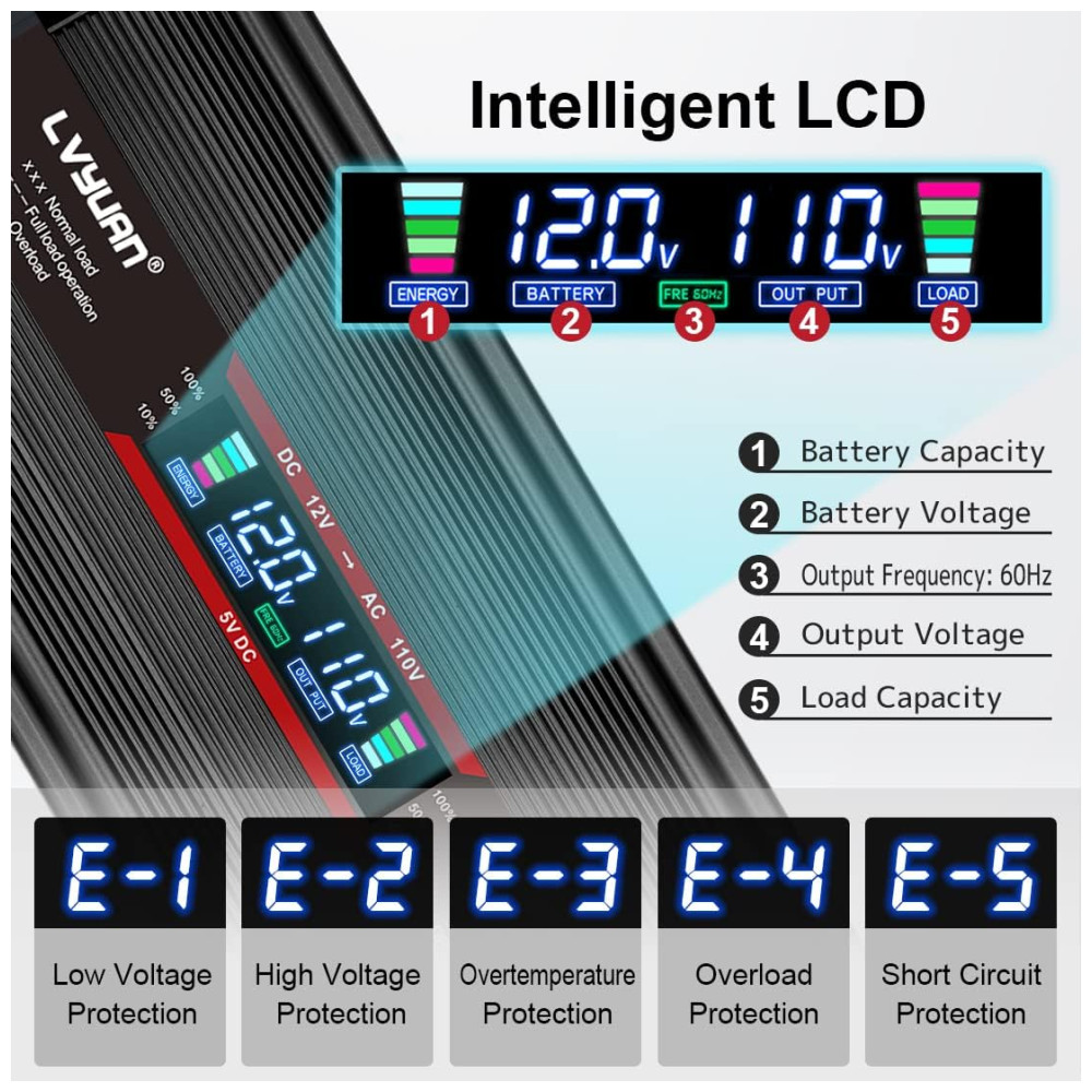DISPLAY LCD INTELIGENTE O display LCD mostra tensão de entrada , saída, capacidade da bateria, capacidade de carga. Fácil de saber o estado da bateria cheia, normal ou vazia. Fácil saber a capacidade de carga.