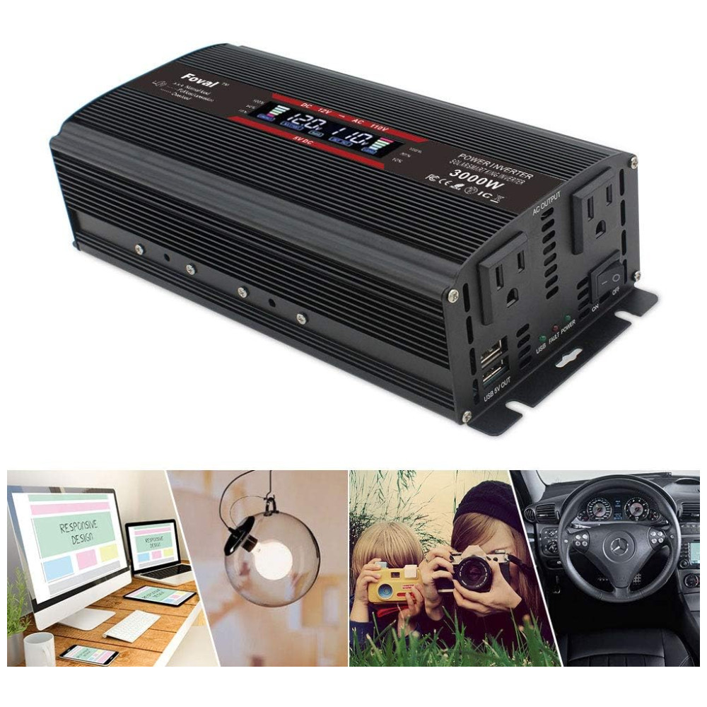 Converta DC 12V para AC 110V 60Hz. Fornece energia de onda senoidal modificada contínua de 1500 Watts. Apresentando 2 tomadas AC e 2 portas USB para carregamento multiuso. Grande Alta eficiência eficiência de conversão 85. A potência de saída nominal deste dispositivo é de 1500W, definitivamente poderia ser realizada na realidade.