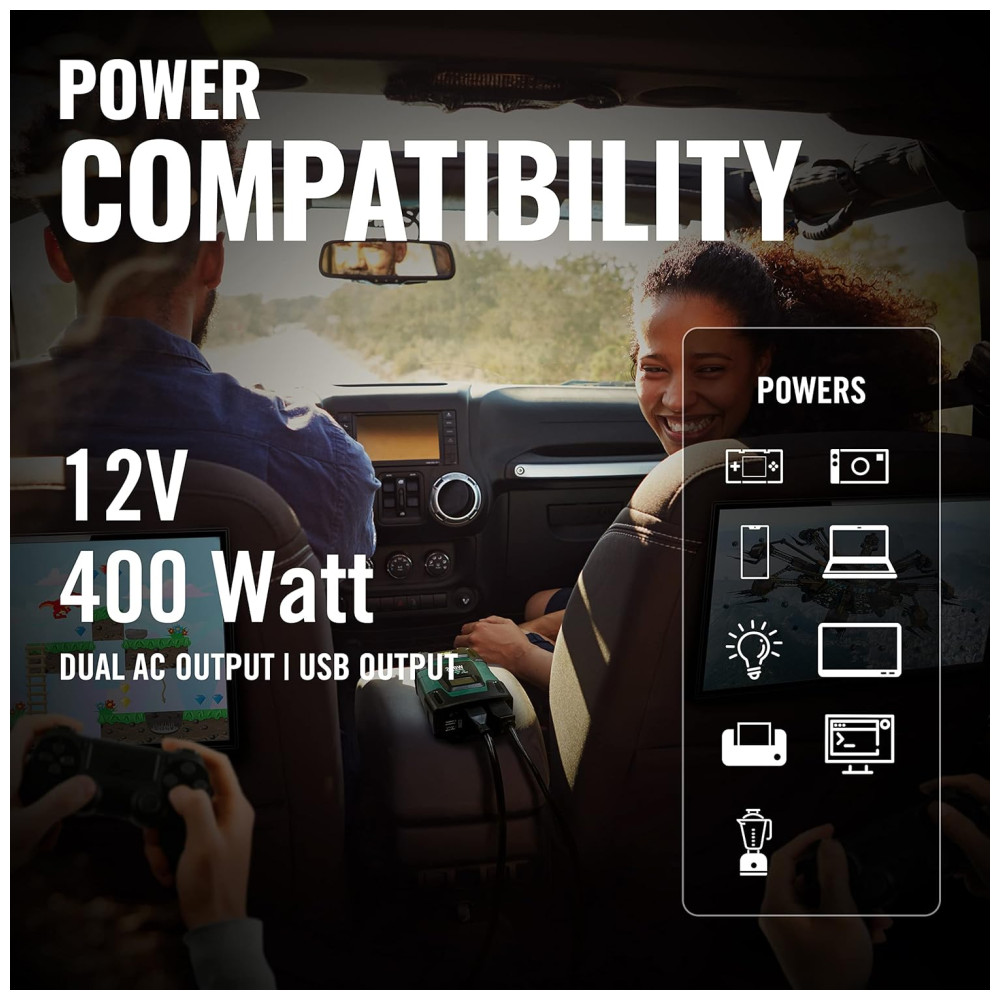 Duas portas de saída CA fornecem uma saída contínua total de 400 W se conectadas diretamente à bateria do carro de 12 V com as pinças de crocodilo incluídas, saída contínua de 120 W se conectadas com adaptador de cigarro