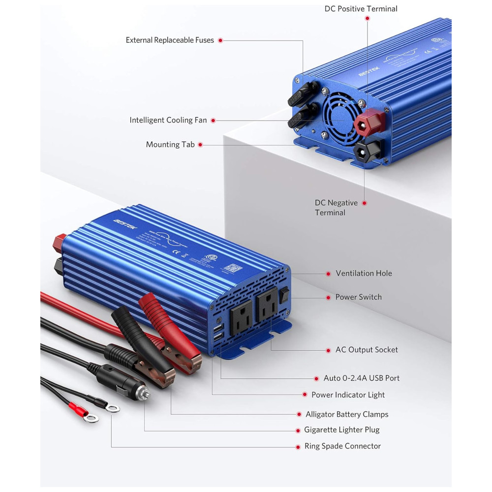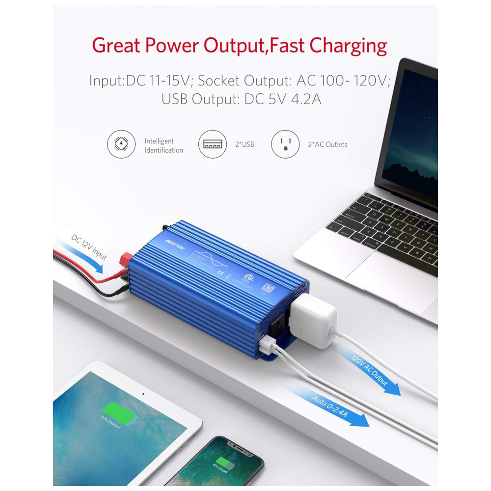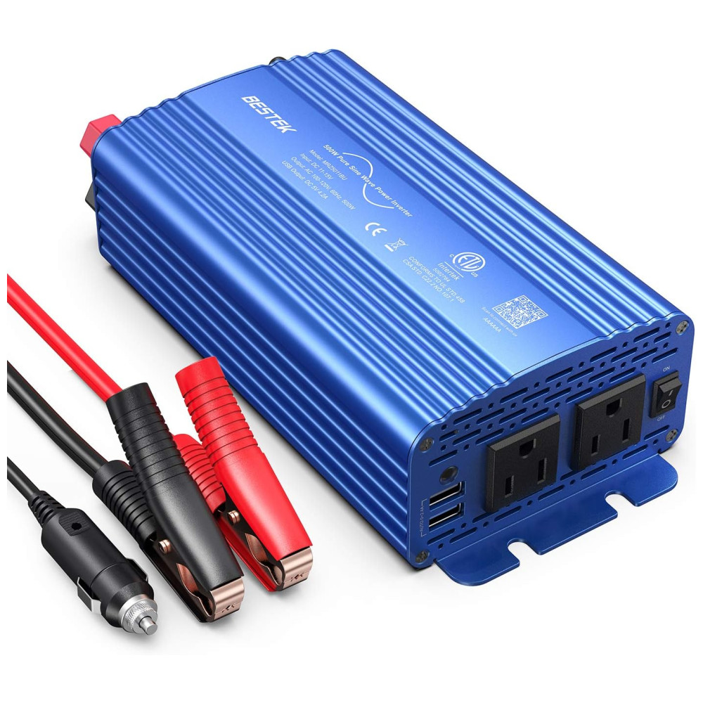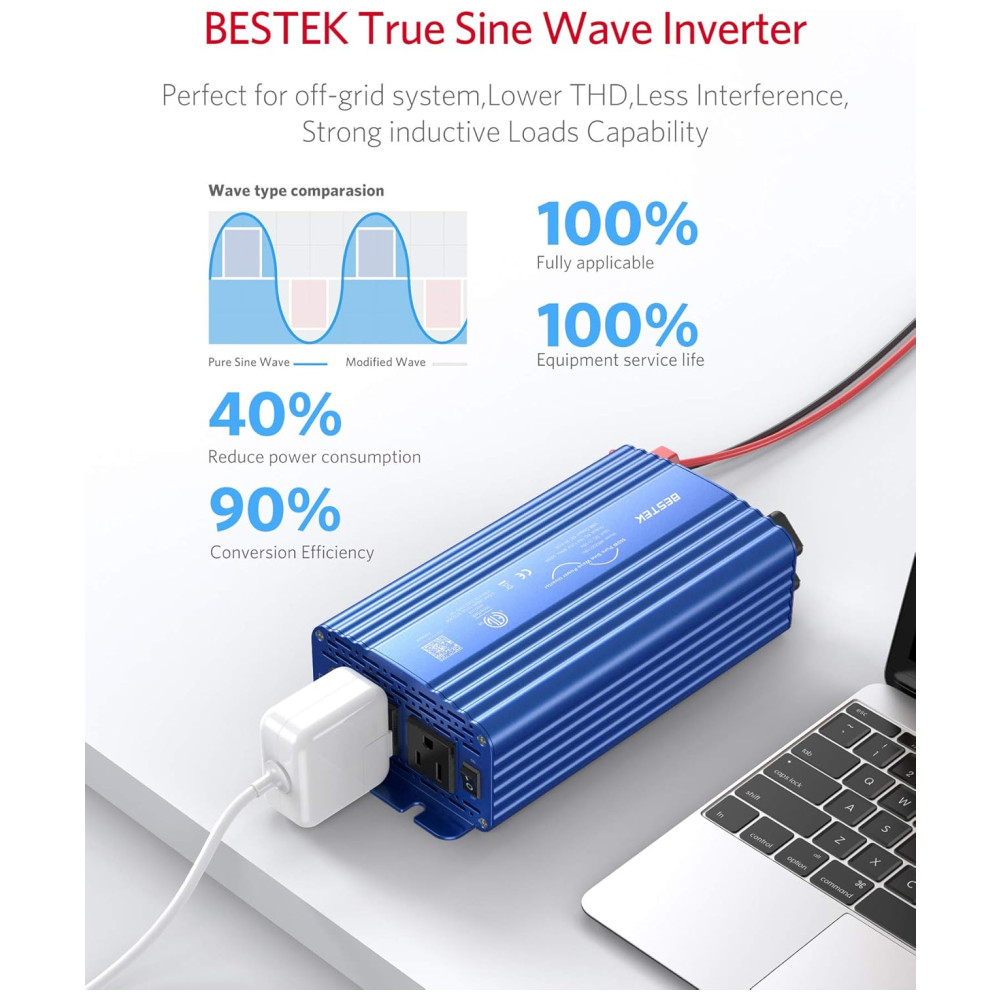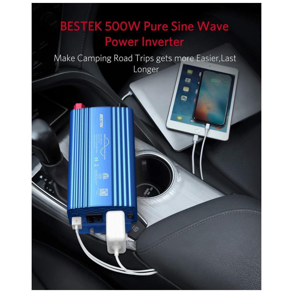 Inversor de carro de onda senoidal pura BESTEK 500W sua forma de onda de saída é igual à forma de onda de energia CA da rede elétrica, que fornece uma onda senoidal de variação suave para componentes eletrônicos sensíveis fornecidos pela concessionária de energia elétrica. desgaste, capacidade de cargas indutivas fortes. Tem pouca interferência com rádios, comunicação e equipamentos de precisão. Também é recomendado pela maioria dos fabricantes de ferramentas sem fio que um inversor de onda senoidal pura seja para garantir uma longa vida da bateria