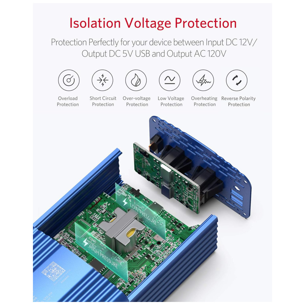 O inversor sinusoidal tem sensores de proteção térmica bem posicionados, o invólucro de liga de alumínio com algumas ondulações, aberturas exclusivas e também um VENTILADOR embutido que liga sob nenhuma carga ou quando o inversor fica quente depois de ligado. Possui fusível externo substituível de 2 x 40 A , 32 V para proteção quando conectado à bateria, facilmente acessível , substituível na parte de trás do Inversor quando conectado ao acendedor de cigarros, usa fusível de 15 A designado para o seu carro.