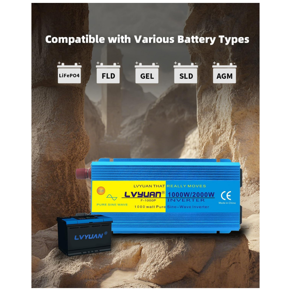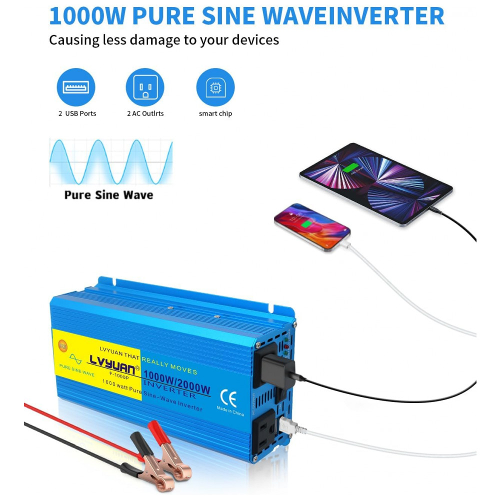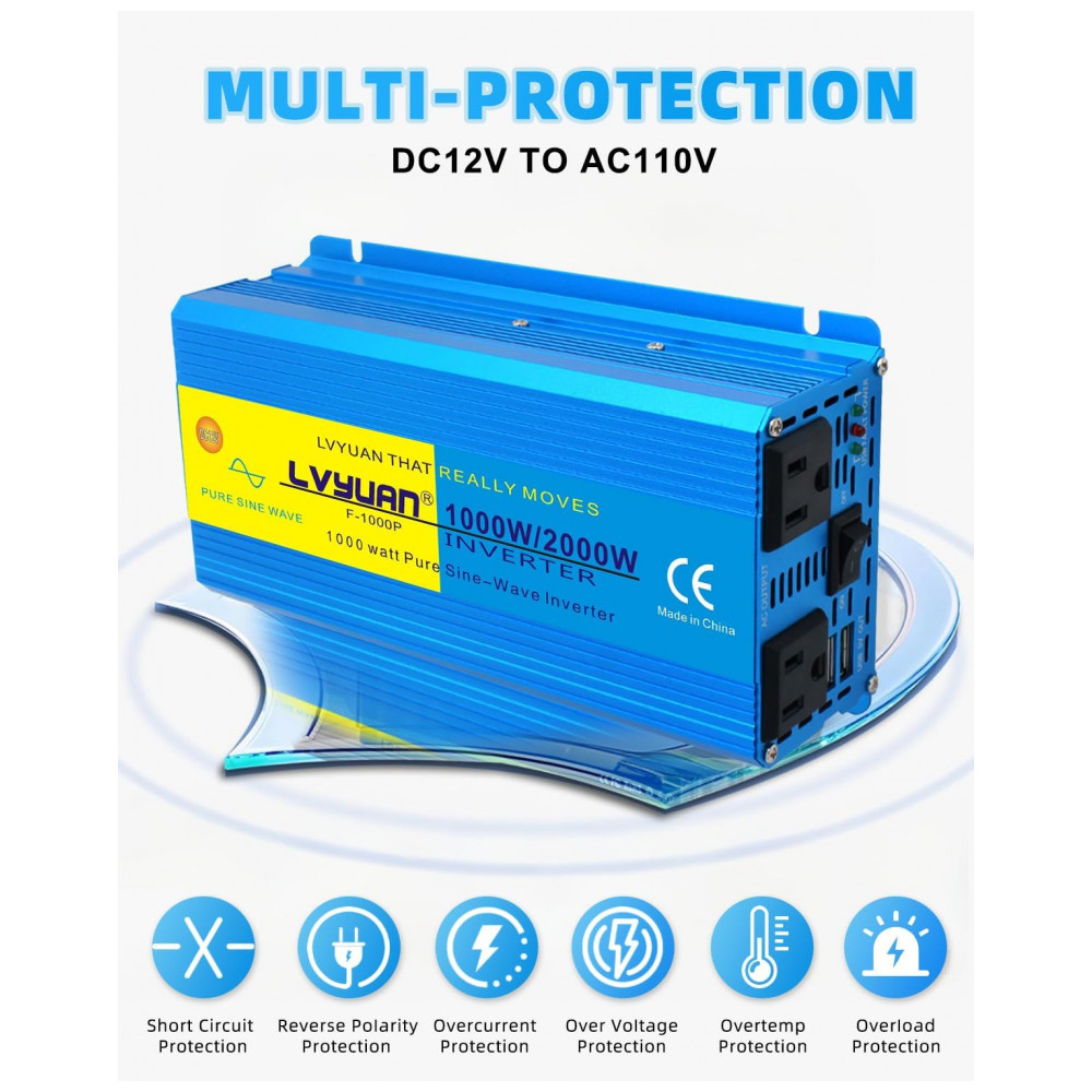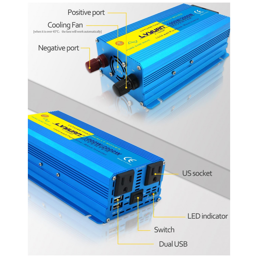 Inversor de Potência Automotivo com Portas USB e Tomadas Duplas LVYUAN 1000W Azul