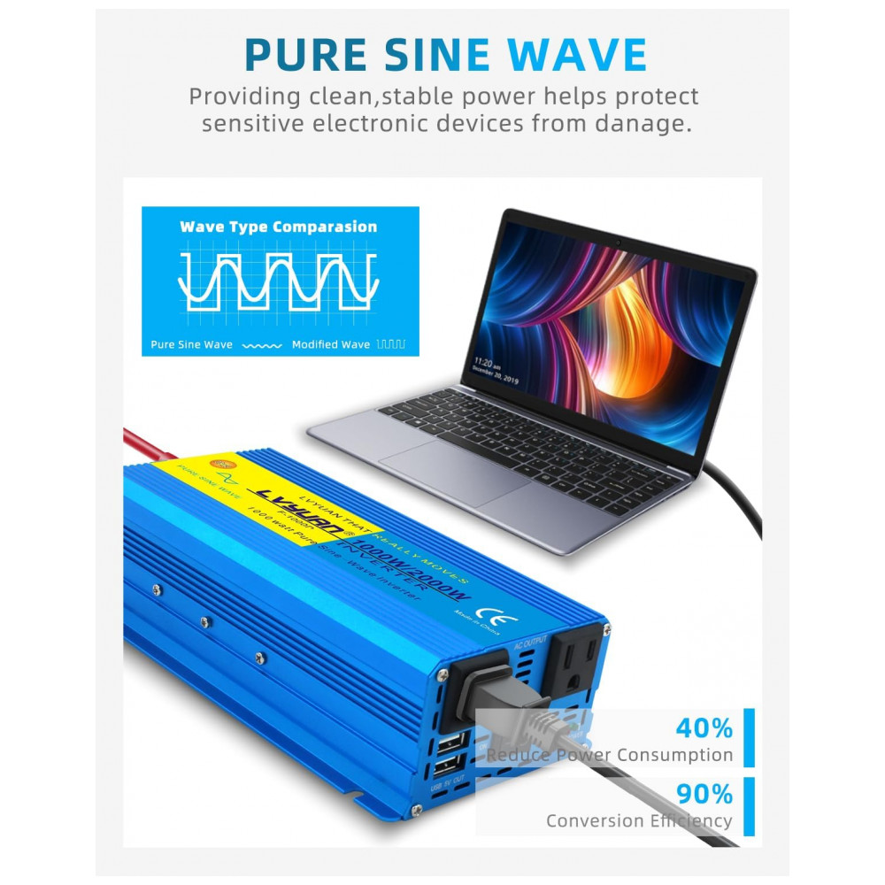 SAÍDA PODEROSA potência de onda senoidal pura contínua de 1000 Watts e potência de pico de 2000 Watts. Limpe a energia da onda senoidal pura. Converta a potência de DC 12V em AC 110V 60Hz. Design compacto e leve.