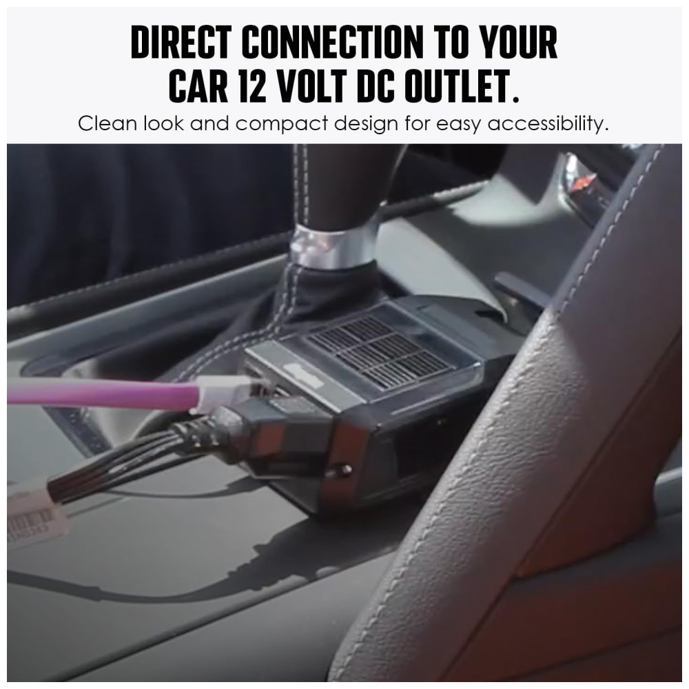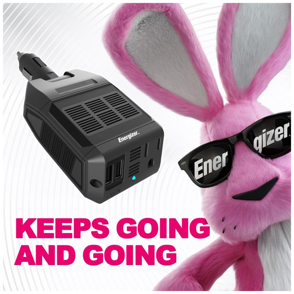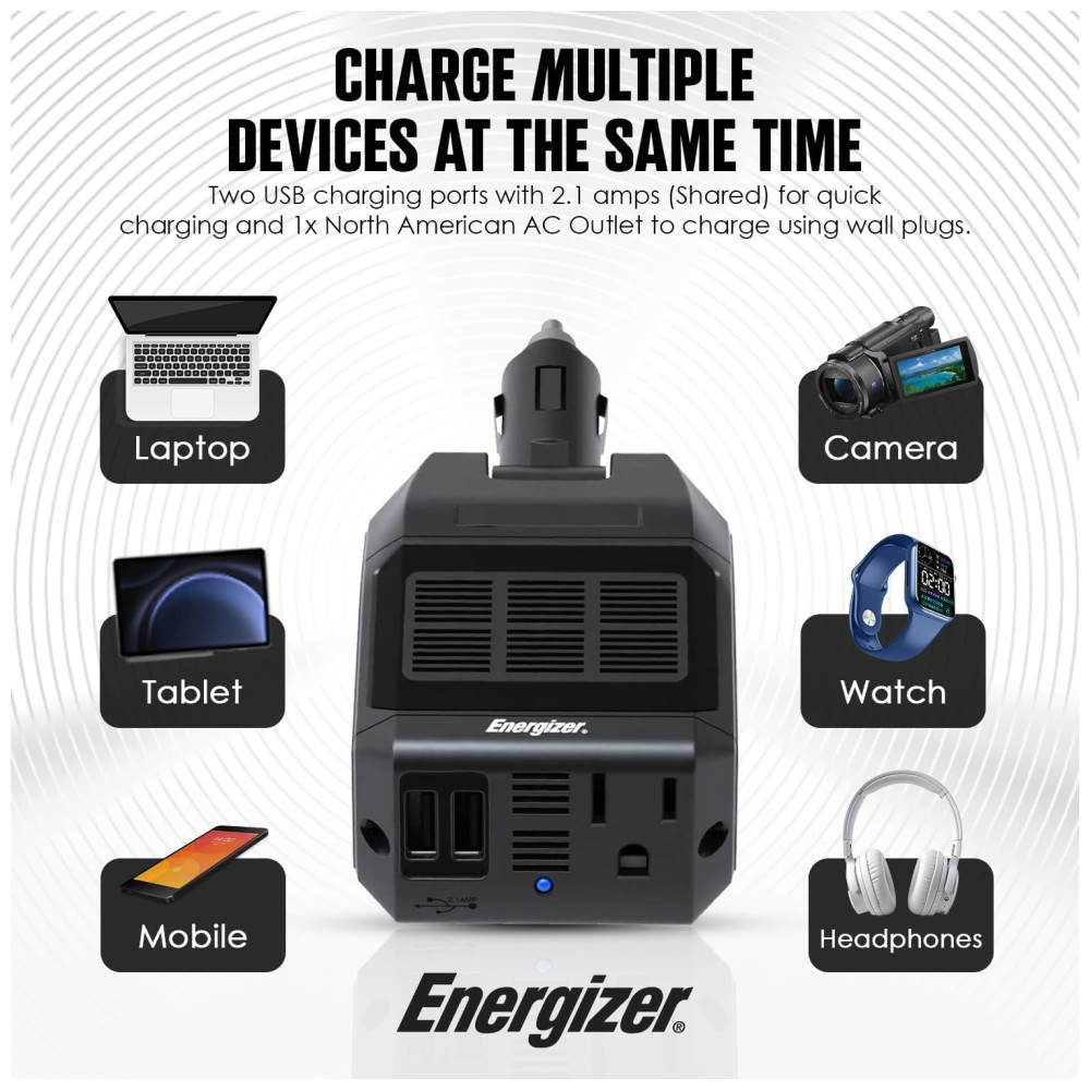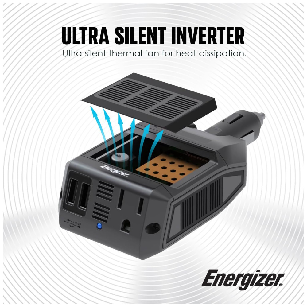 INVERSOR ENERGIZER 100W Inversor contínuo de 100 W CC , CA, com quatro portas de carregamento multiuso Dissipador de calor de cobre nos permite construir um inversor sem ventilador de 100 watts com alto pico de 200 Watts Sem fios, sem cabos, sem problemas Cabeça rotativa de 12 volts para girar e manter em qualquer direção. QUATRO PORTAS DE CARREGAMENTO Porta de carregamento USB dupla 2.1A compartilhada e tomadas de CA dupla para carregar dispositivos maiores ENERGIZER MANTÊ LO INDO testado, validado e aprovado pelo ETL por sua segurança e desempenho. ETL aprovado sob UL STD 458 e CSA std C22.2