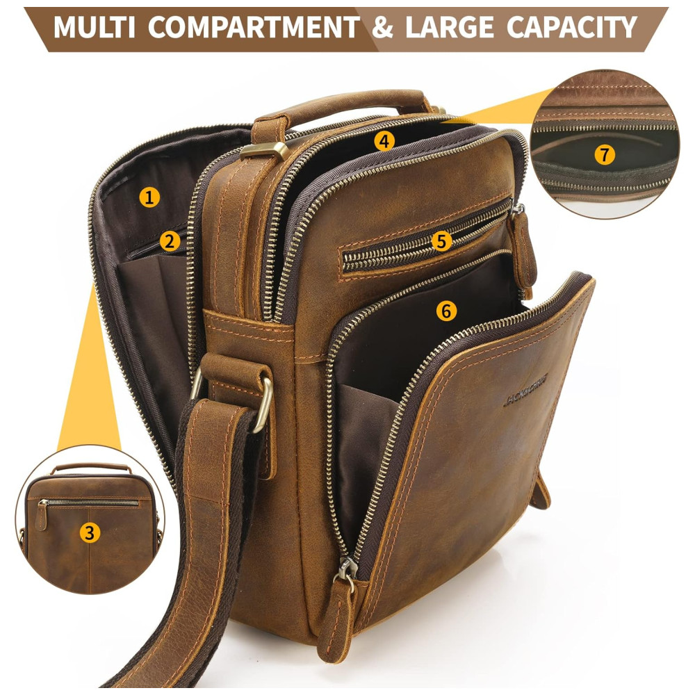 Um presente especial bolsa masculina de couro retrô artística e bolsa masculina de couro estilo selvagem clássico fornecem uma atualização refrescante para silhuetas atemporais. Cada bolsa crossbody em aparência é tão única quanto sua amada. A bolsa mensageiro masculina perfeita para aniversários, datas comemorativas, dia dos pais e Natal