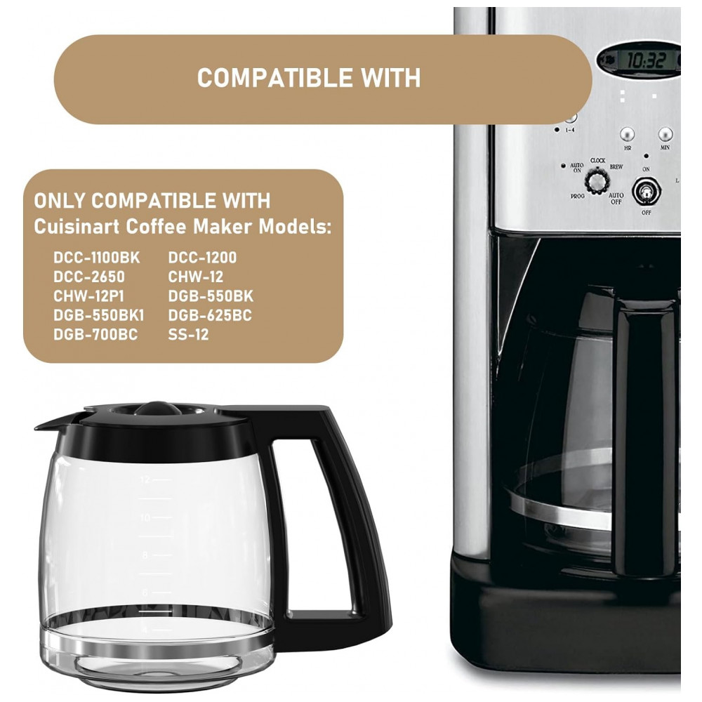 Modelos Compatíveis: Jarra de café térmica DCC 1200 SOMENTE COMPATÍVEL COM Modelos de cafeteira Cuisinart: DCC 1100BK, DCC 1200, DCC 2650 , CHW 12, CHW 12P1, DGB 550BK, DGB 550BK1, DGB 625BC, DGB 700BC, Ss 12.