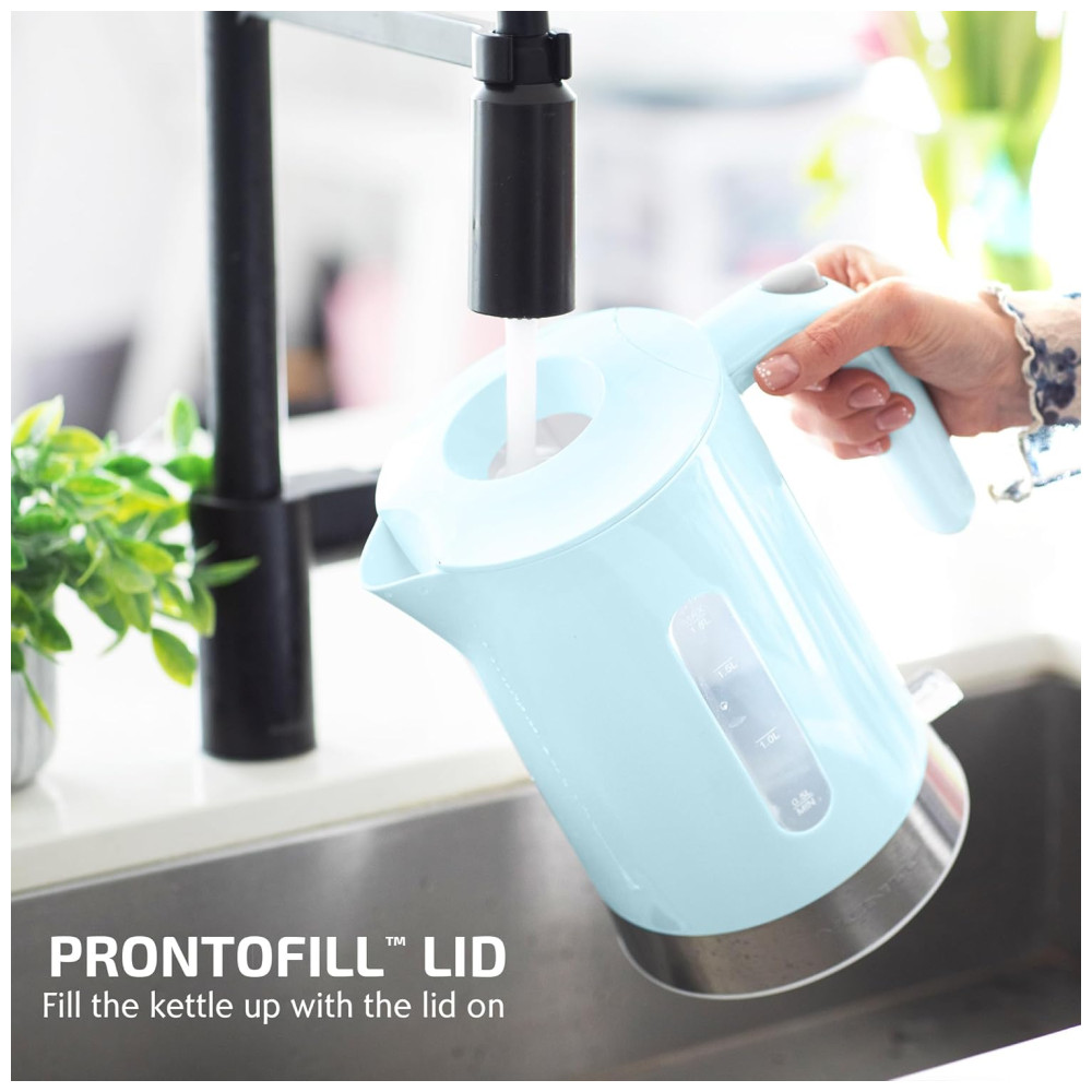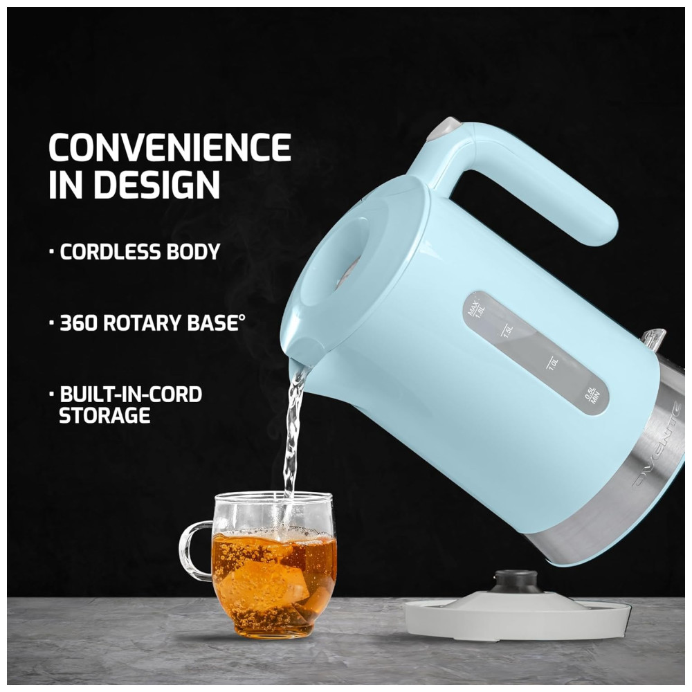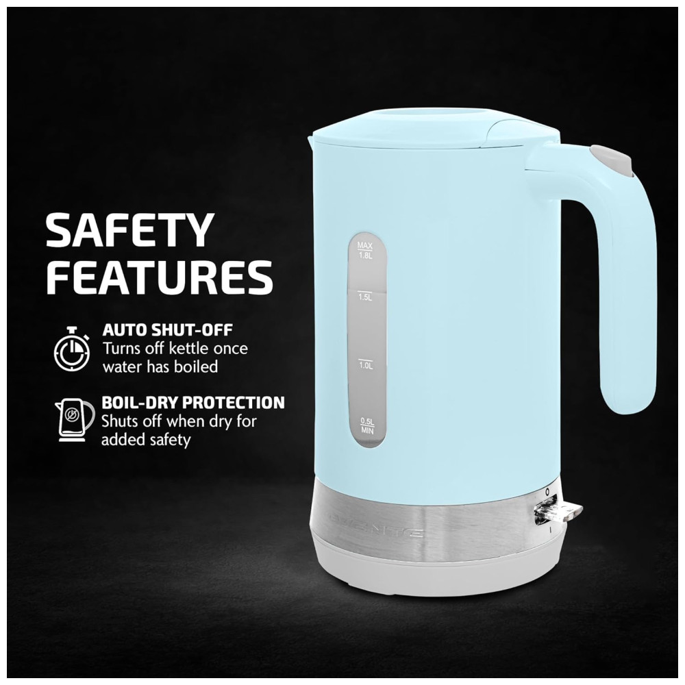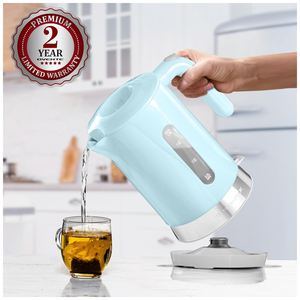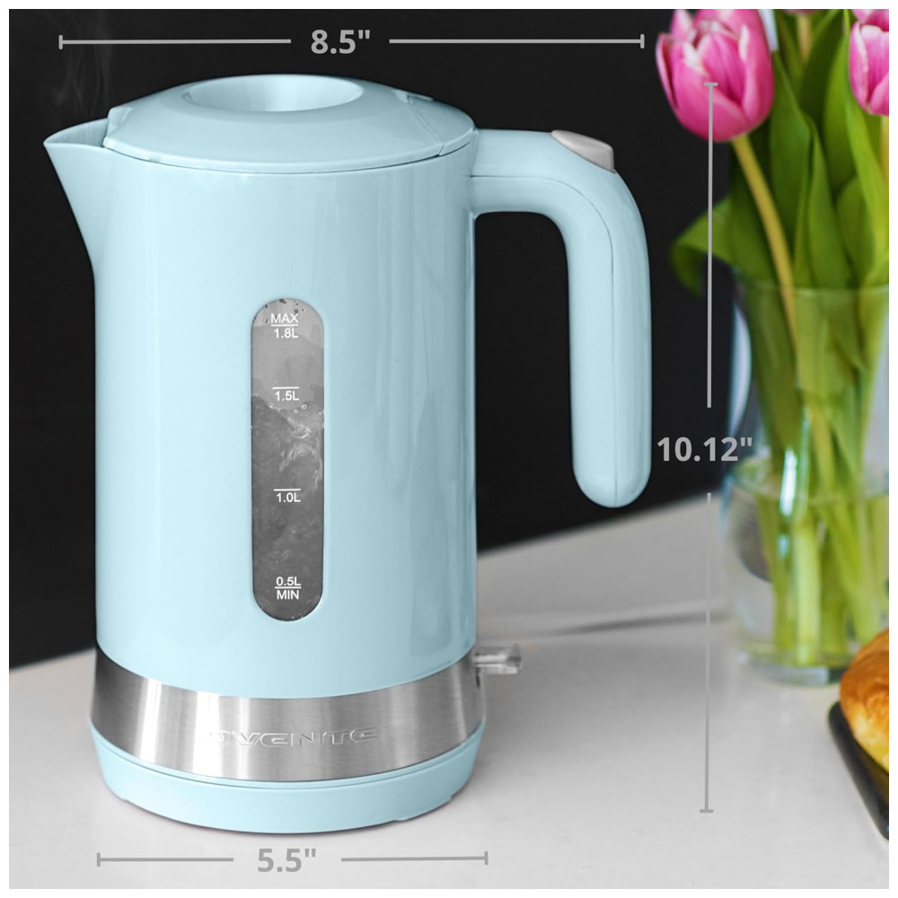 Descubra a mais recente adição à linha de chaleiras ProntoFill da OVENTE, disponível em cinco elegantes variações de cores – preto, verde, azul claro, rosa, vermelho e branco. Esta chaleira elétrica de 1,8L apresenta um elegante detalhe em aço inoxidável que realça sua aparência, enquanto a janela de visualização oferece uma indicação clara do nível de água. Com um recurso de desligamento automático, a chaleira se desliga automaticamente assim que a água ferve. Além disso, inclui a tecnologia de proteção contra ebulição a seco, evitando que a chaleira aqueça se ligada vazia. Graças à inovadora tampa ProntoFill, não é preciso abri-la para reabastecer a chaleira. Basta despejar água pela tampa para recargas fáceis e com uma mão. Adicionalmente, a chaleira possui uma tampa de abertura fácil para limpeza, um filtro de bico removível que garante água livre de detritos e um elemento de aquecimento em aço inoxidável que reduz o acúmulo de minerais, fazendo com que você precise descalcificar sua chaleira com menos frequência. Para maior conveniência, o interruptor na base da chaleira fica vermelho durante o aquecimento e, uma vez que a água ferve, o interruptor se eleva e a luz vermelha se apaga. A base também inclui ranhuras de armazenamento embutidas para o cabo, ajudando a manter sua cozinha organizada e arrumada. ATENÇÃO: as chaleiras elétricas podem ferver mais rapidamente em altitudes mais elevadas devido à variação dos pontos de ebulição. ATENÇÃO: O CORPO DA CHALEIRA PODE FICAR EXTREMAMENTE QUENTE DURANTE A OPERAÇÃO. POR FAVOR, TENHA MUITO CUIDADO E USE A ALÇA ANTITÉRMICA PARA EVITAR QUEIMADURAS. MAIOR CAPACIDADE: Ferva água mais de 2x mais rápido do que no fogão com o potente elemento de aquecimento de 1500W, permitindo que você aqueça rapidamente até 1,7 litros de água, economizando tempo e energia. A tampa articulada abre com o toque de um botão para uso e limpeza fáceis. O bico é equipado com um filtro removível, garantindo água sem detritos todas as vezes. Basta deslizar o filtro para fora para limpeza fácil, e em seguida, recolocá-lo para uso. TECNOLOGIA PRONTOFILL: Equipada com nossa patenteada Tecnologia ProntoFill, uma inovação revolucionária no design de chaleiras. Apresentando a exclusiva tampa ProntoFill, você pode reabastecer a chaleira facilmente sem precisar abri-la! Basta despejar água diretamente pela tampa para recargas rápidas e fáceis, perfeito para multitarefas enquanto você está em movimento. FERVURA SEGURA E SEM PREOCUPAÇÕES: Esta chaleira de aquecimento rápido e livre de BPA foi projetada com segurança em mente. Possui uma função de desligamento automático que desliga a chaleira automaticamente quando a água ferve. Também inclui tecnologia de proteção contra ebulição a seco, impedindo que a chaleira aqueça se ligada vazia, proporcionando tranquilidade durante o uso. CONVENIÊNCIA NO SEU MELHOR: Projetada para máxima facilidade de uso. Possui um medidor de nível de água e uma luz indicadora que mostra quando a chaleira está aquecendo. Basta pressionar o interruptor, e ele irá se iluminar em vermelho. Uma vez que a água ferveu, o interruptor se eleva, e a luz vermelha se apaga. Além disso, a base inclui ranhuras de armazenamento embutidas para o cabo, ajudando a manter sua cozinha organizada e arrumada.
