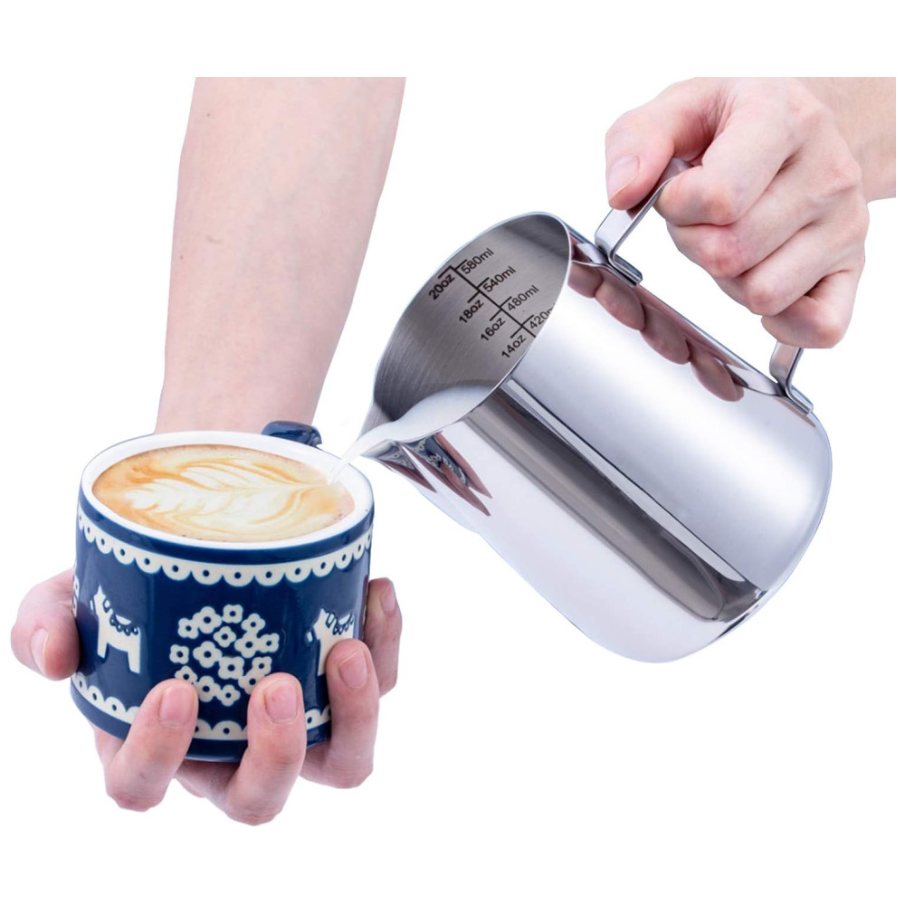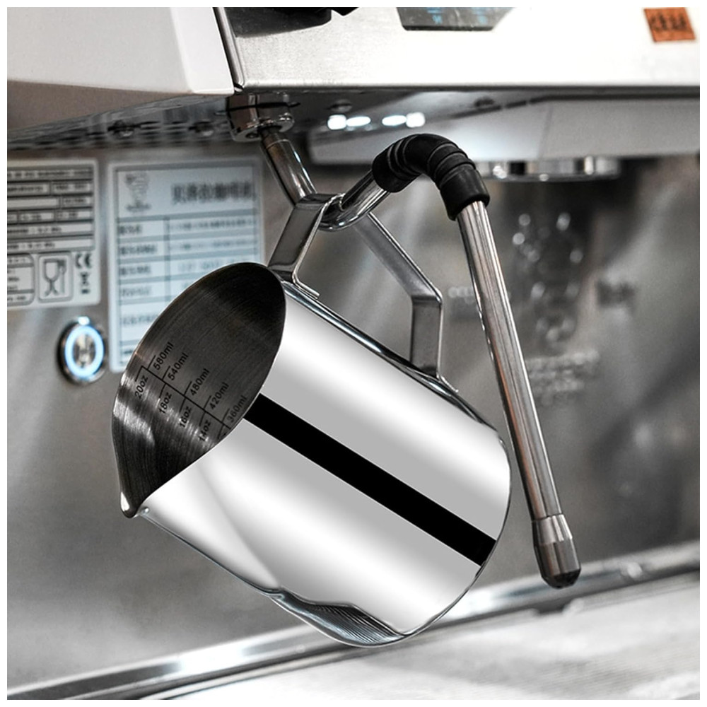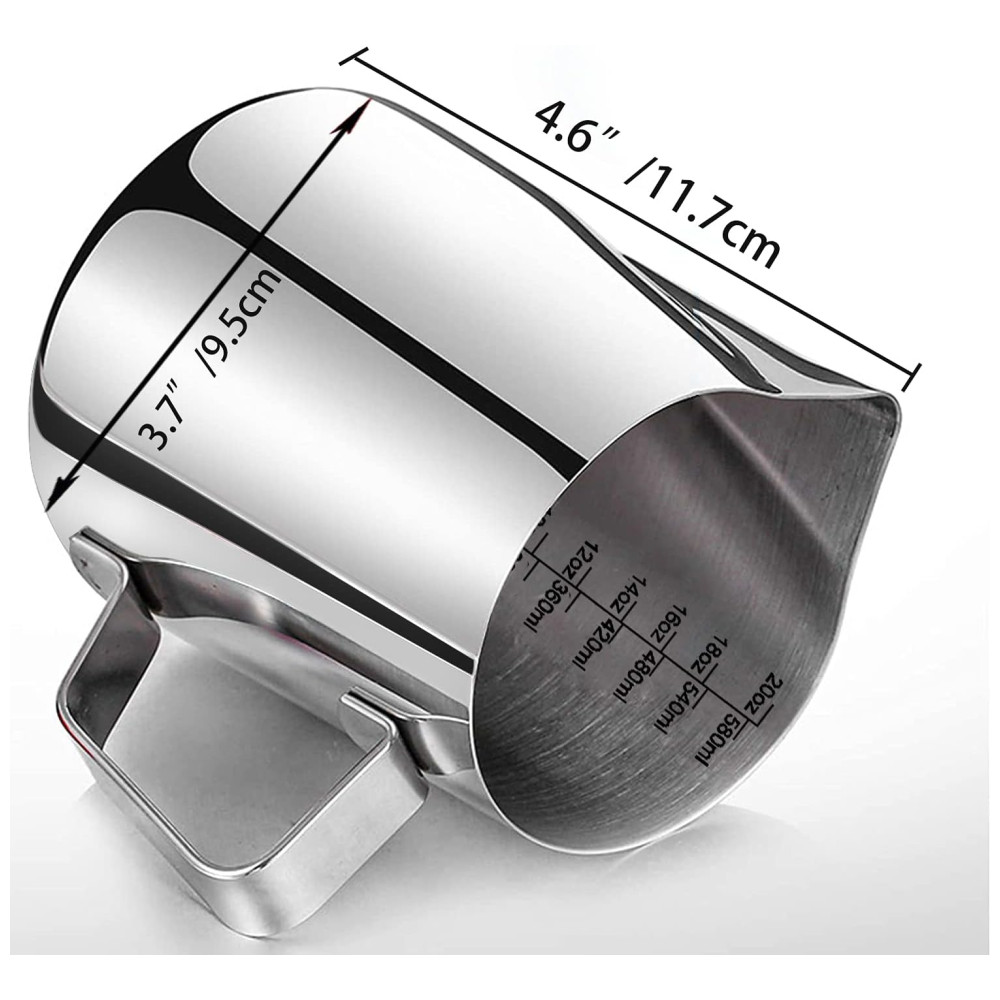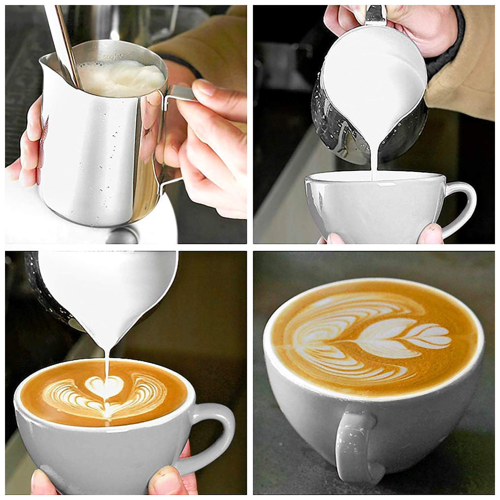 Alta qualidade O jarro de espuma é feito de aço inoxidável 18, 8, sem revestimento de pintura, sem corrosão ou ferrugem e com status de tanque inquebrável., Resistente e não é fácil de dobrar e deformar. Próprio para máquina de lavar louça e fácil de limpar com água e sabão.