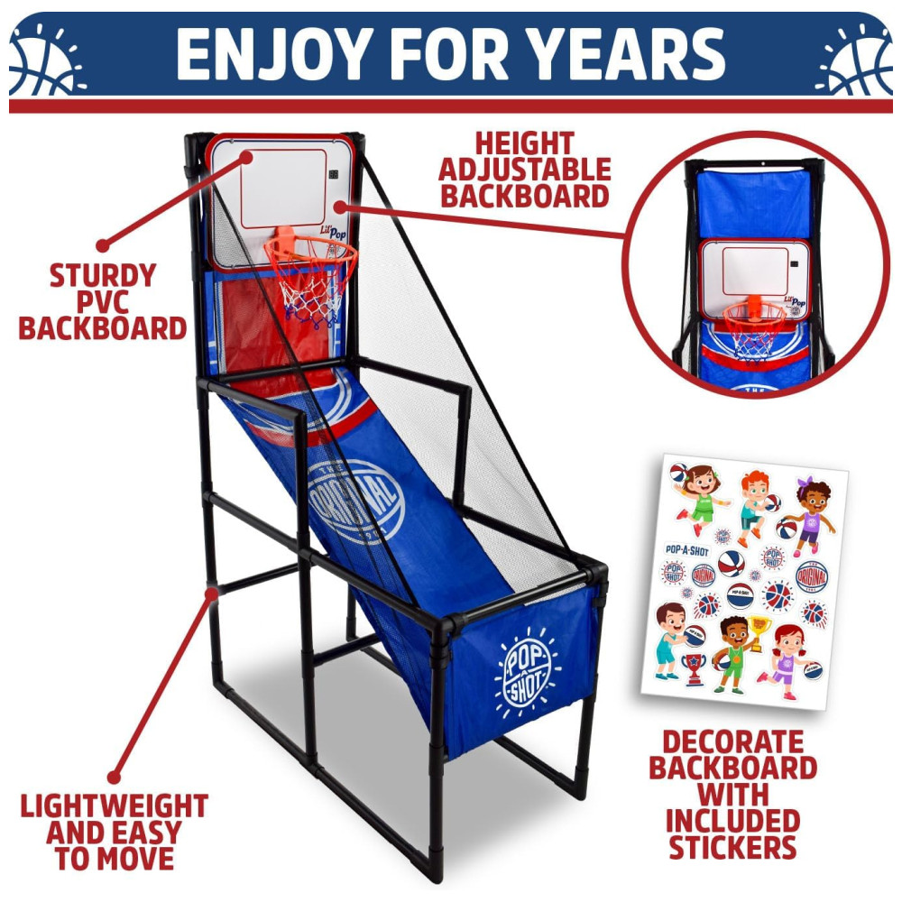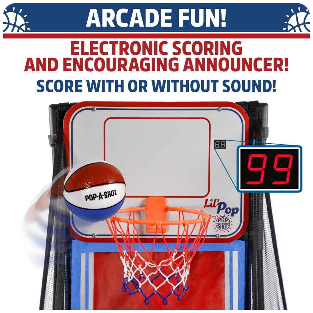 Pop-A-Shot, os criadores da experiência original de basquete arcade, apresentam com entusiasmo o Pop-A-Shot Lil’ Pop! Perfeito para jogadores de 3 a 6 anos, o Lil’ Pop foi projetado pensando nos pequenos astros do basquete, trazendo uma experiência divertida e educativa. Este jogo ajuda as crianças a desenvolverem coordenação motora grossa, habilidades motoras finas e a aprenderem a melhorar suas pontuações, enquanto se divertem com um clássico do basquete arcade.