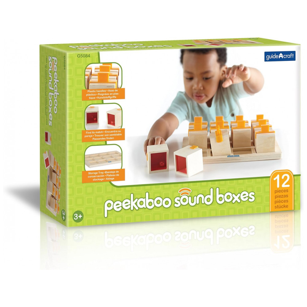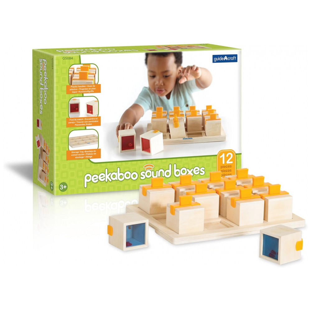 Jogo de caixas sonoras Guidecraft em madeira natural com bandeja de armazenamento e 12 peças para pareamento auditivo