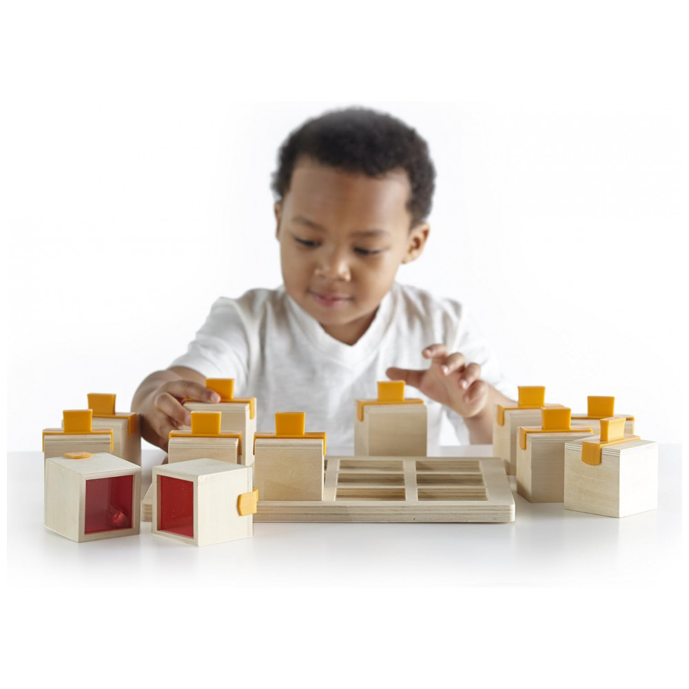 Cada caixa sonora possui janelas em acrílico translúcido e alças plásticas macias, permitindo que a criança visualize parcialmente o interior e manuseie os cubos com segurança. Ao agitar cada cubo, a criança escuta um de seis sons distintos e precisa encontrar o par correspondente, reforçando habilidades de atenção, memória e discriminação auditiva.