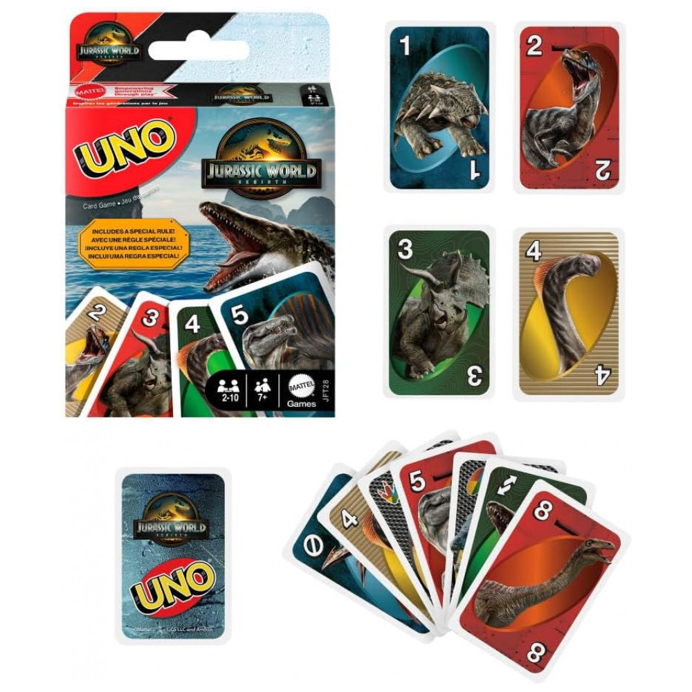 O jogo de cartas UNO Jurassic World Rebirth da Mattel possui deck com artes inspiradas em personagens e cenas do filme, para 2 a 10 jogadores a partir de 7 anos. A mecânica clássica combina números e cores, com regra especial “Ataque do T-Rex” que obriga o jogador a descartar 5 cartas se não combinar a cor escolhida.