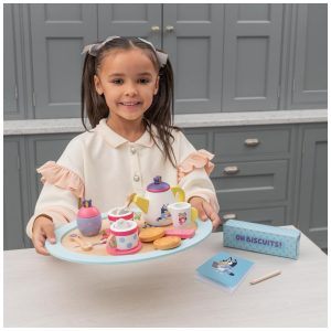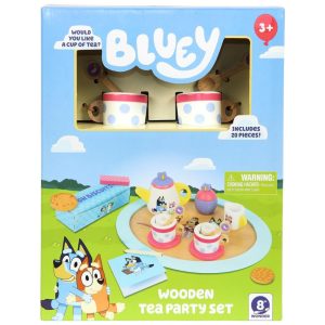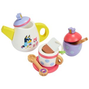 Jogo De Chá Bluey Em Madeira – 18 Peças Com Bandeja Bule Xícaras Biscoitos Açucareiro E Bloco Notas (Certificado FSC).