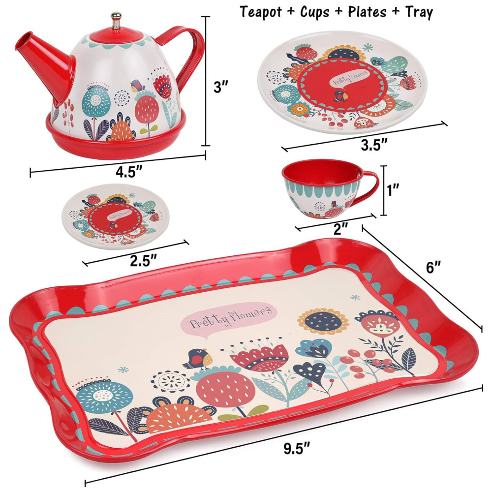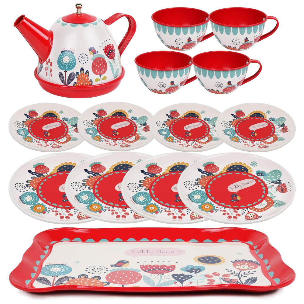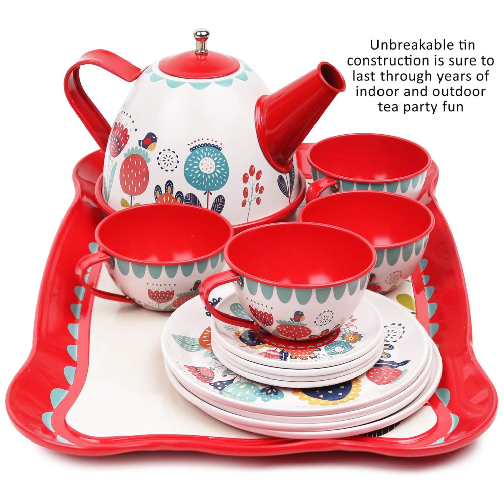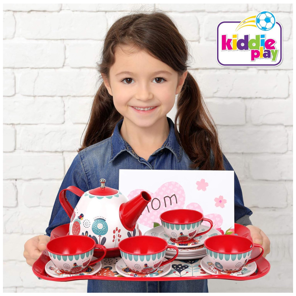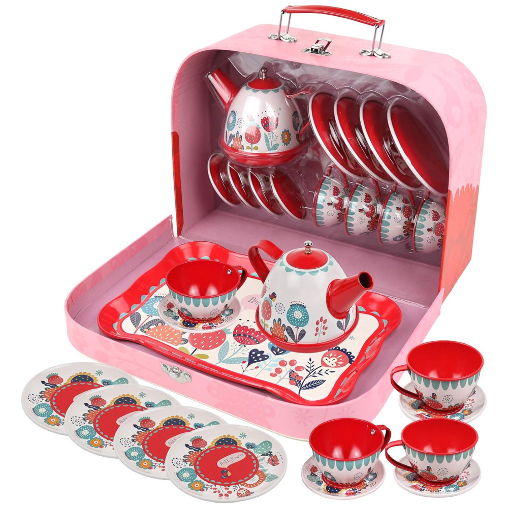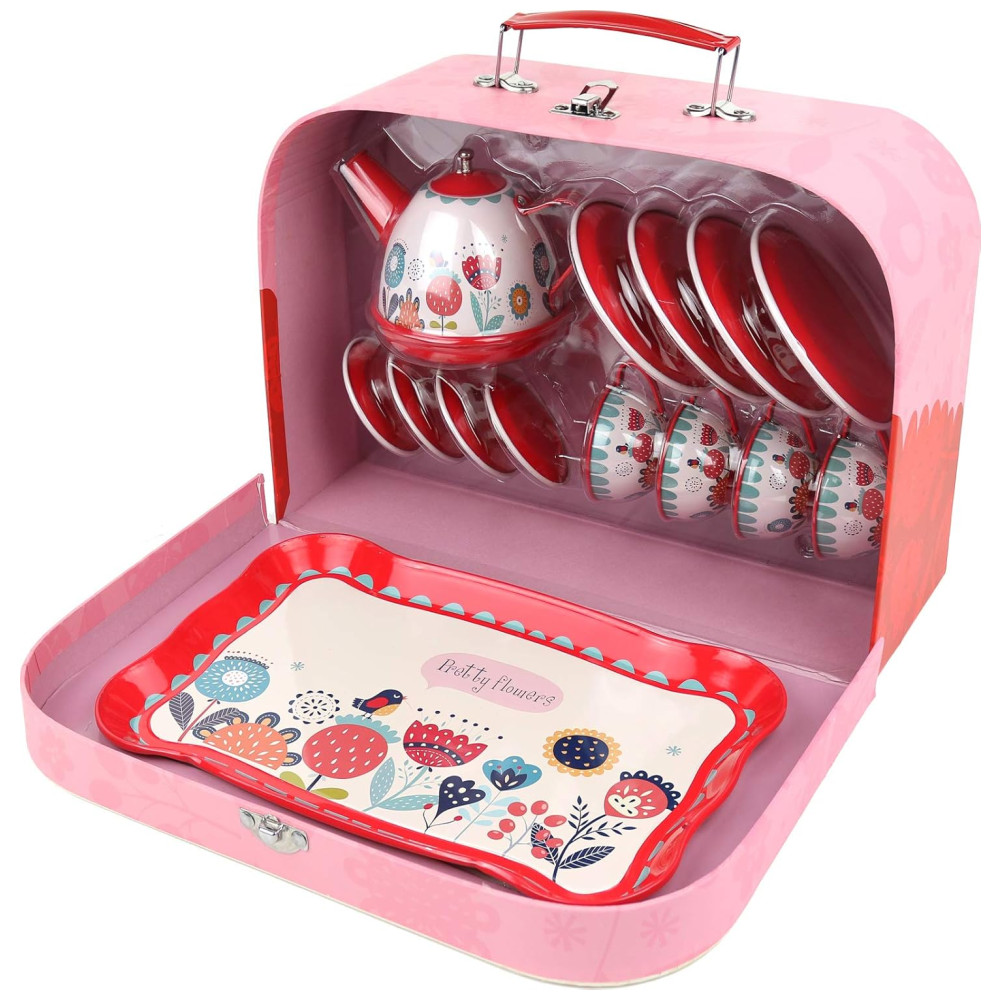 Jogo de Chá Infantil 15 Peças com Tema Floral e Estojo de Transporte para Crianças Acima de 3 Anos KIDDIE PLAY Vermelho e Rosa