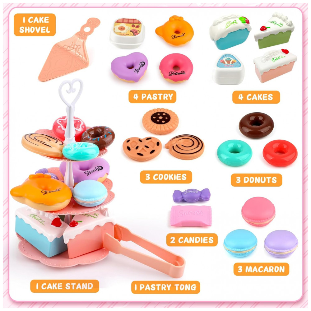 Este pacote Super Valor é ideal para crianças que adoram brincar de festa de chá da tarde. O conjunto inclui 1 bule com tampa, 1 bandeja, 4 xícaras de chá, 4 pratos e 4 pires, além de 18 deliciosos donuts, bolos, macaroons, biscoitos, entre outros itens. Também está incluso um suporte para bolo e 1 servidor de pastelaria.