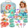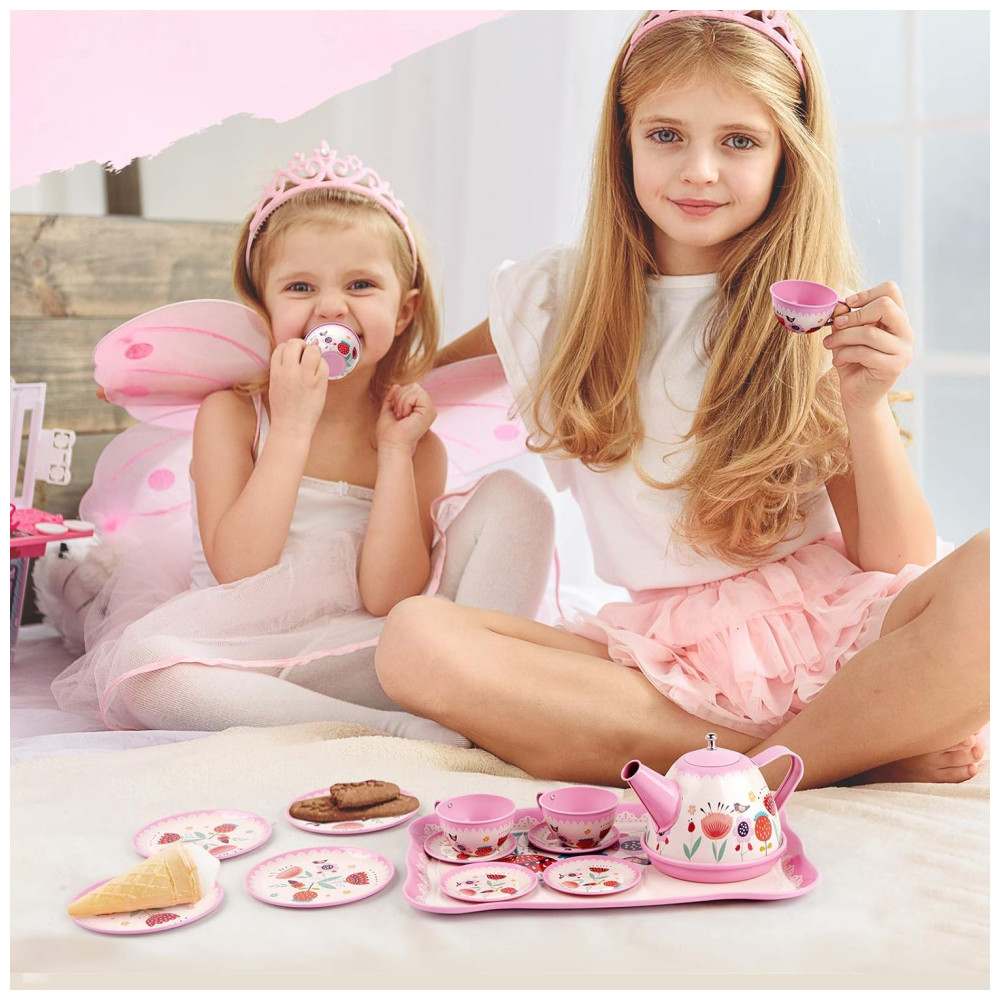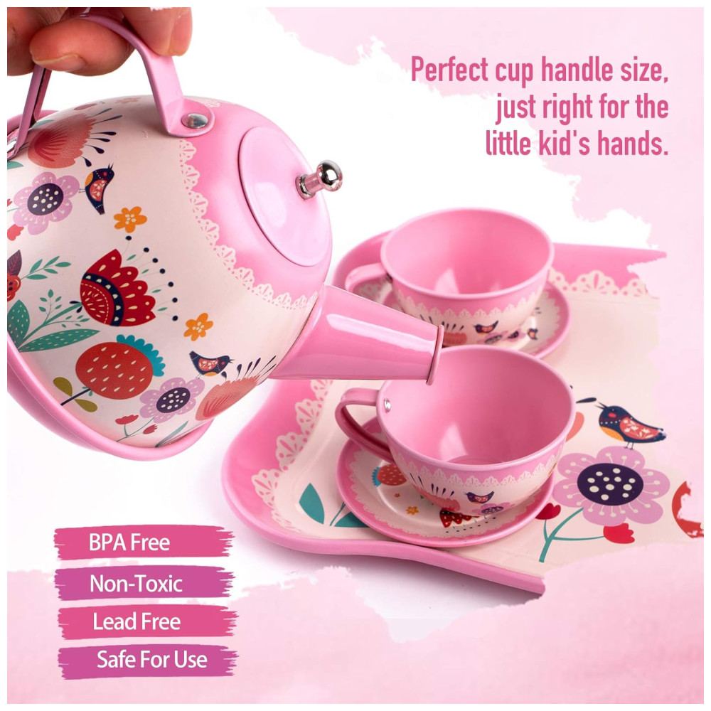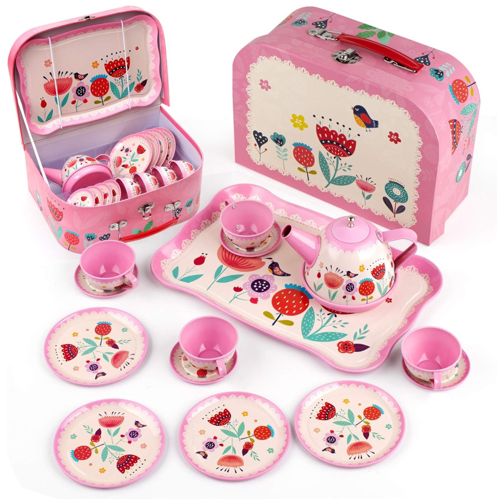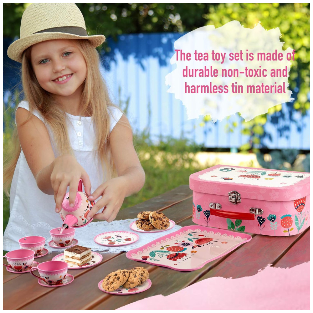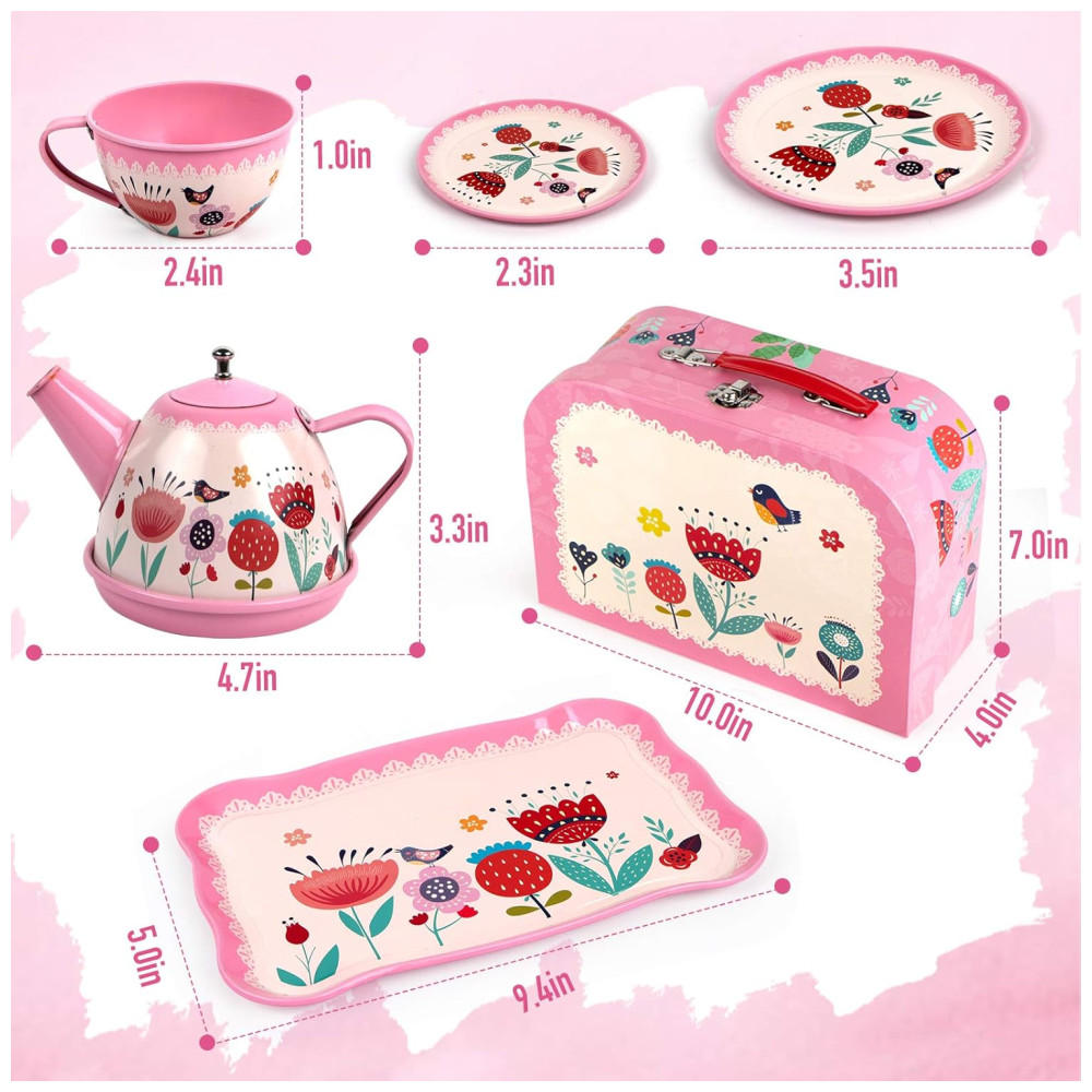 Este adorável conjunto de chá para crianças é composto por 15 peças, incluindo um bule, uma bandeja, quatro pires, quatro xícaras de chá e quatro pratos. As crianças podem brincar de faz de conta por horas e guardar cuidadosamente o conjunto em sua mala de papelão após a festa do chá. Feito de material de ferro revestido de estanho seguro, este conjunto de chá de lata para crianças de 3 a 5 anos é durável e resistente a quebras.