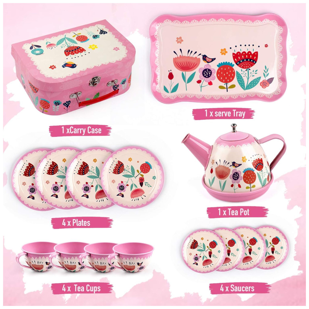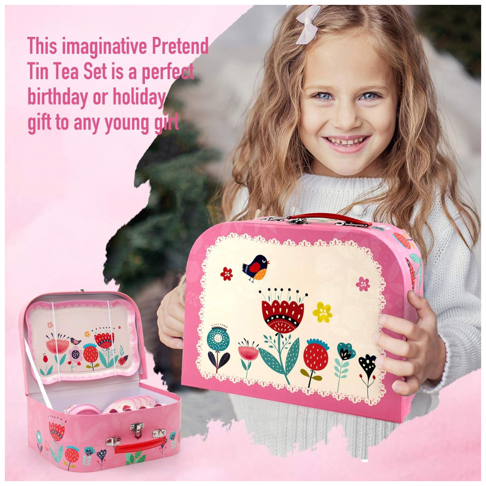Jogo de Chá Infantil em Lata 15 Peças com Maleta de Transporte para Crianças Acima de 3 Anos D-FantiX Rosa