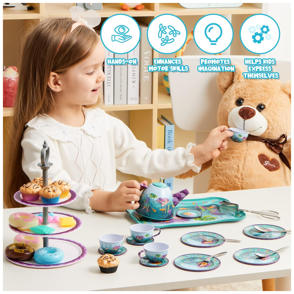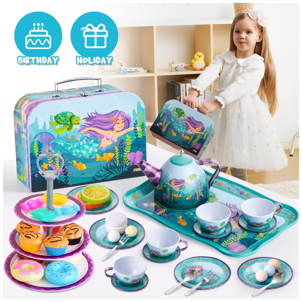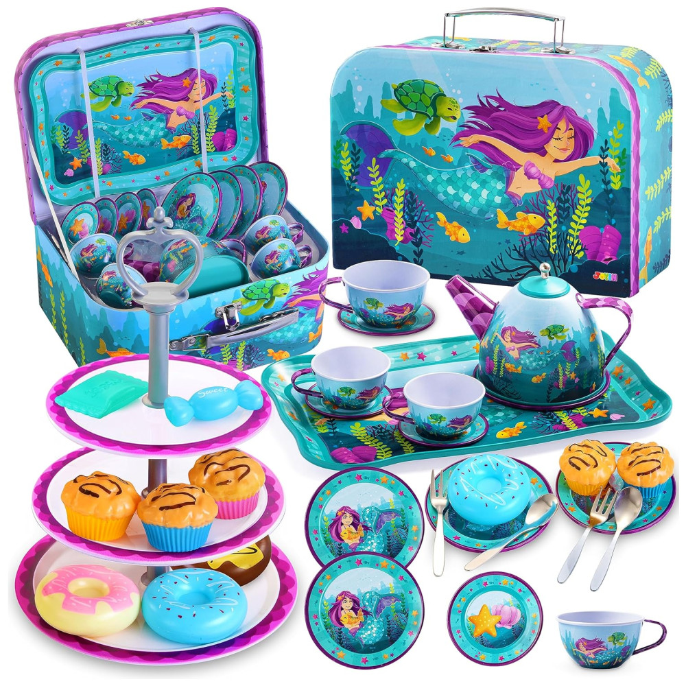 Jogo de Chá Infantil em Lata 35 Peças com Tema de Sereia e Maleta de Transporte para Crianças Acima de 3 Anos JOYIN Azul