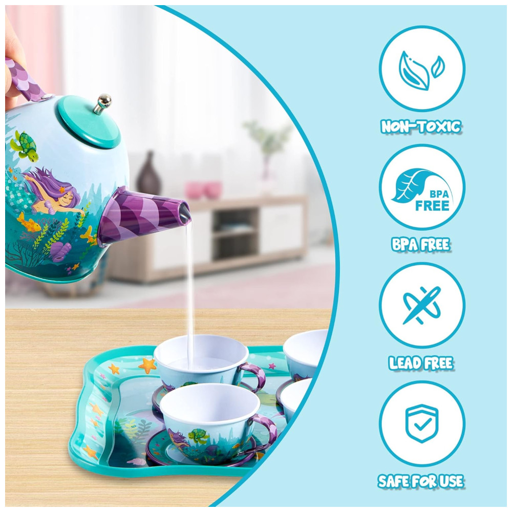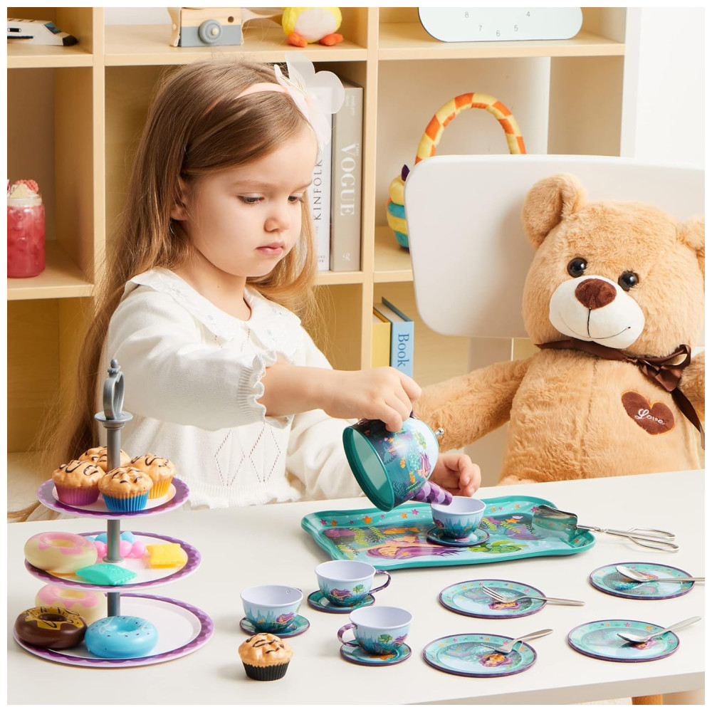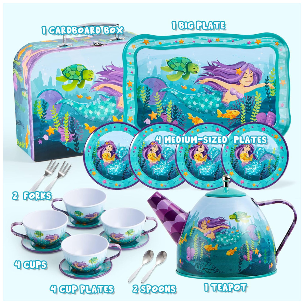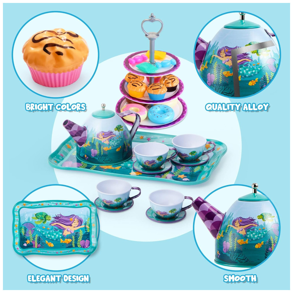 Jogo de Chá Infantil em Lata 35 Peças com Tema de Sereia e Maleta de Transporte para Crianças Acima de 3 Anos JOYIN Azul