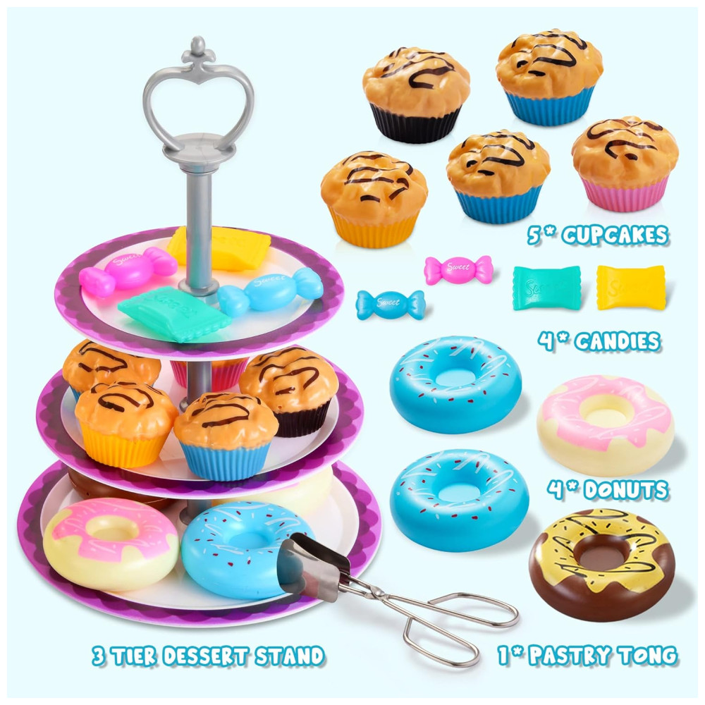 Este pacote de super valor inclui um encantador conjunto de chá de sereia, composto por 1 bule, 4 xícaras, 4 pratos de tamanho médio, 4 pratos de tamanho pequeno, 1 prato grande, uma caixa de papelão de sereia, 2 colheres, 2 garfos, um suporte para bolo de 3 camadas, 1 servidor de pastelaria, 5 cupcakes, 4 doces pães e 4 doces.