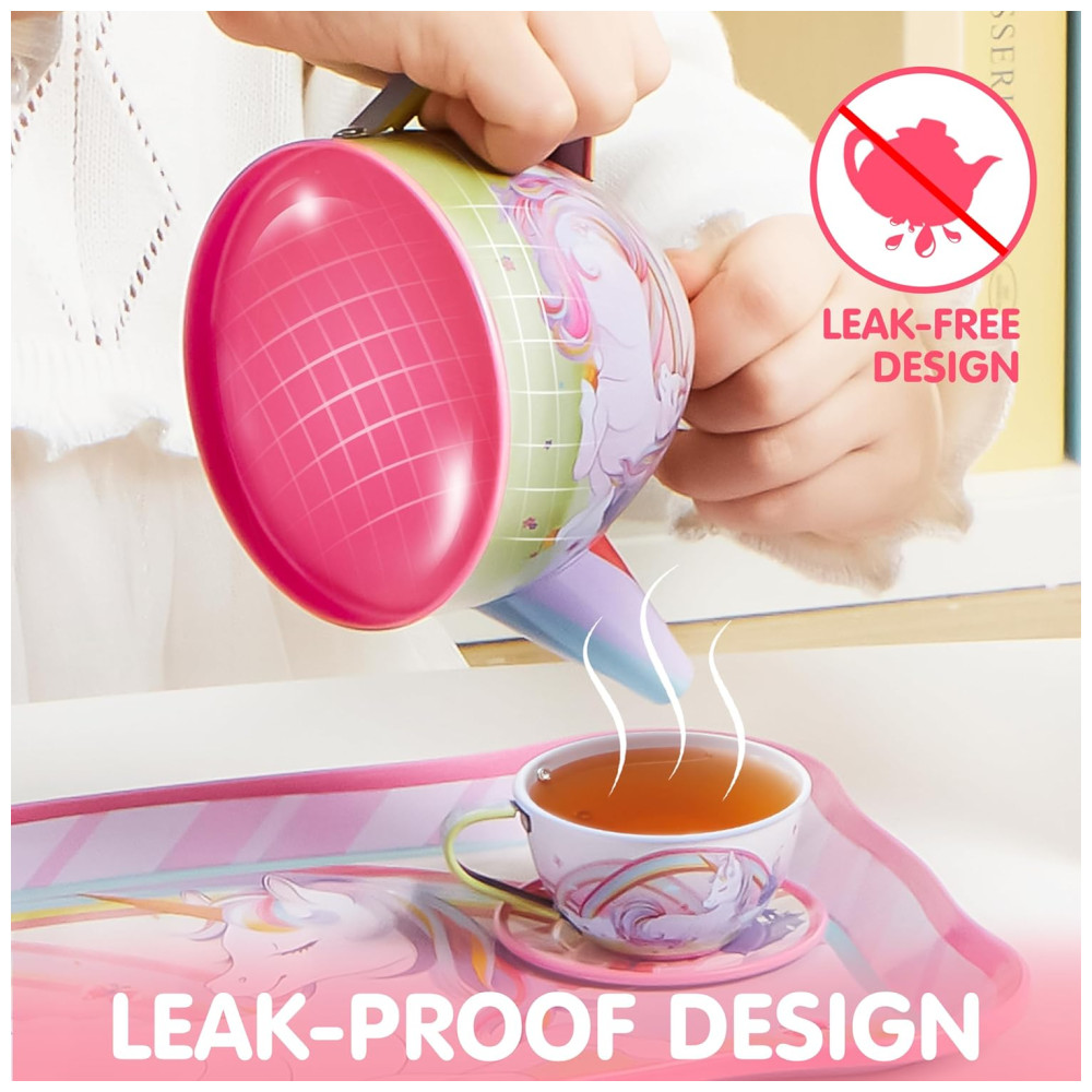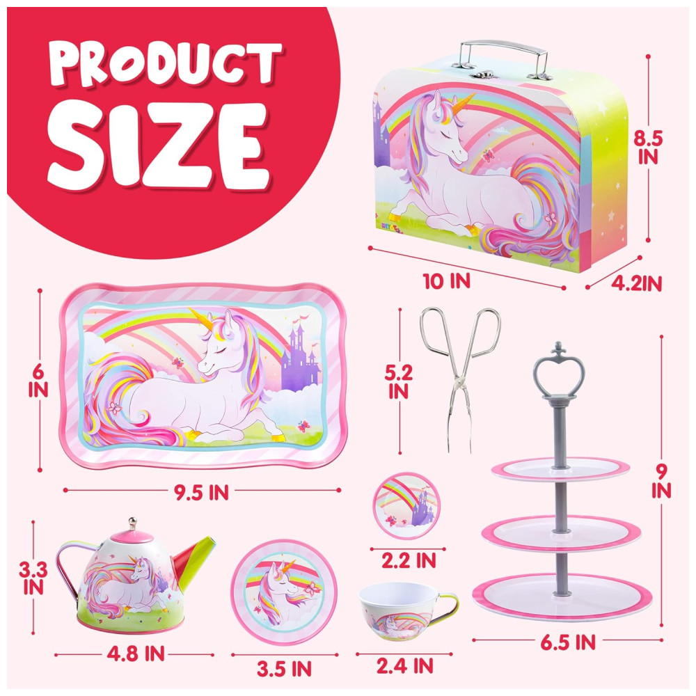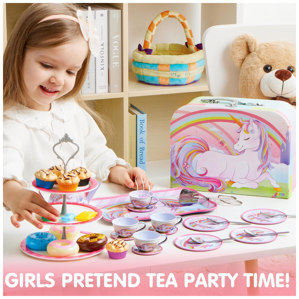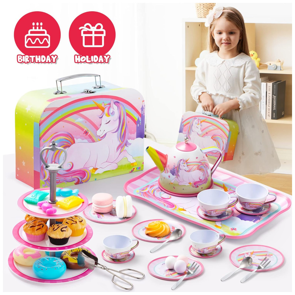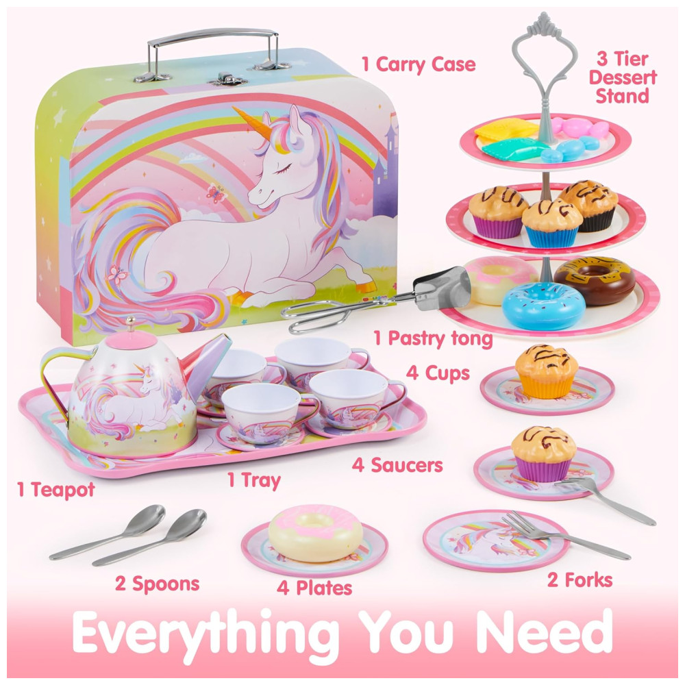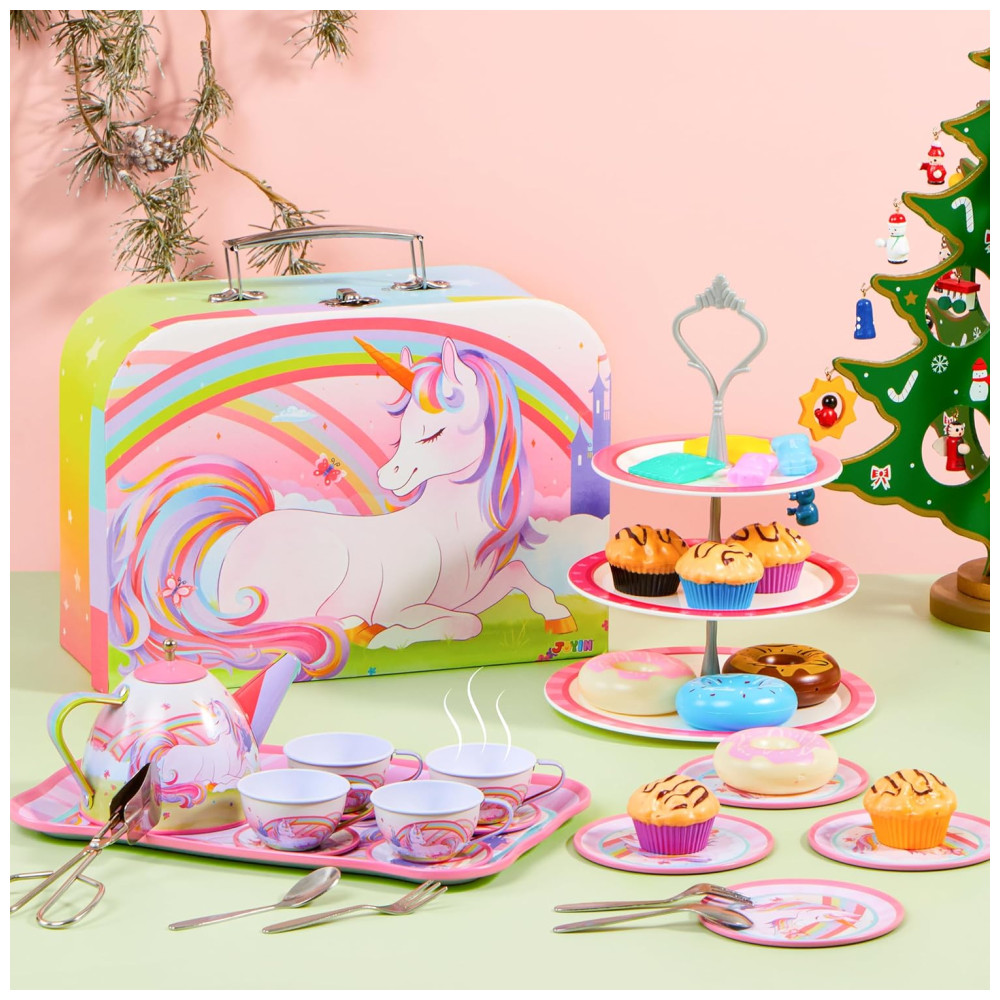 Jogo de Chá Infantil em Lata 35 Peças com Tema de Unicórnio e Maleta de Transporte para Crianças Acima de 3 Anos JOYIN Rosa