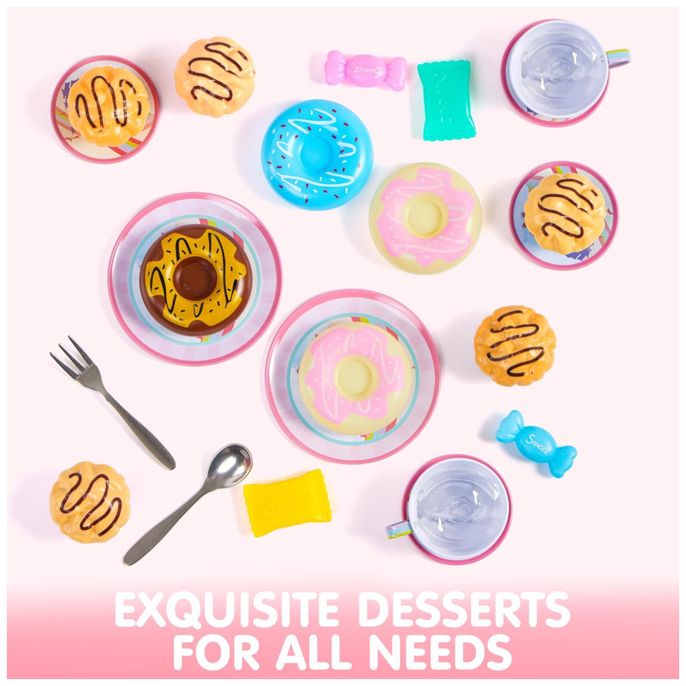 Este pacote de super valor inclui um conjunto de chá de unicórnio composto por 1 bule, 4 xícaras, 4 pratos de tamanho médio, 4 pratos de tamanho pequeno, 1 prato grande e uma caixa de papelão de unicórnio, 2 colheres, 2 garfos, um suporte para bolo de 3 camadas, 1 servidor de pastelaria, 5 cupcakes, 4 pães doces e 4 doces.