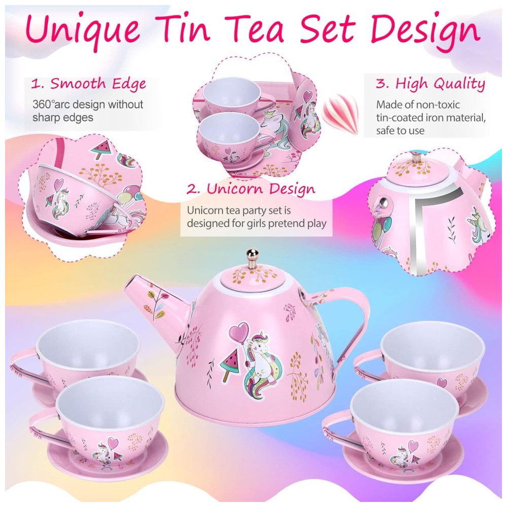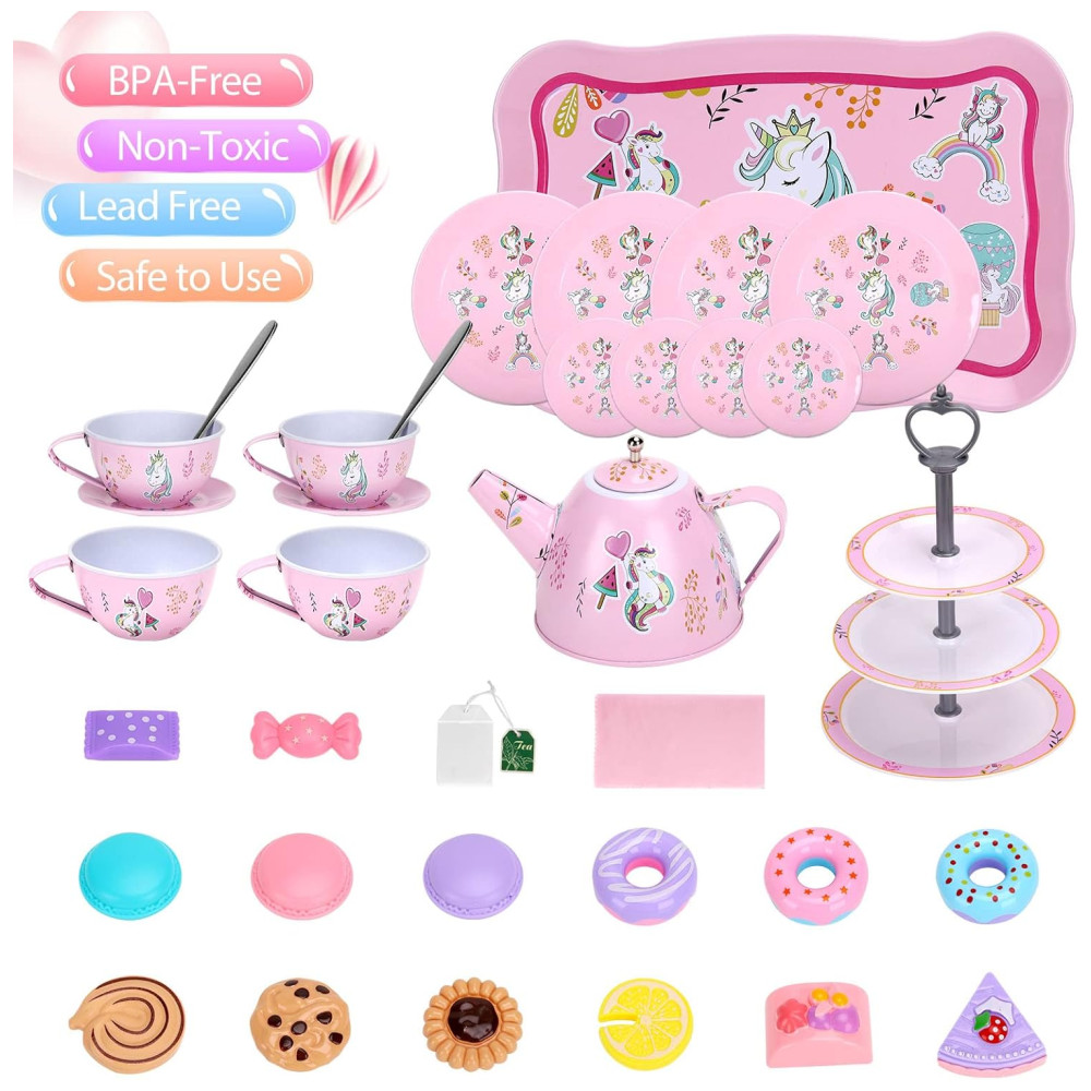 Jogo de Chá Infantil em Lata 36 Peças com Tema de Unicórnio e Maleta de Transporte para Crianças Acima de 3 Anos Auney Rosa