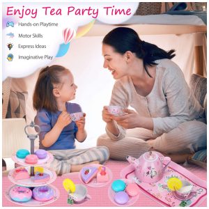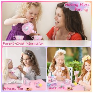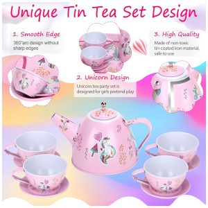 O bule com tampa removível pode segurar e despejar água, chá ou suco para trazer uma experiência de jogo mais realista. Este conjunto de chá de lata é um ótimo presente de lembrança para sua princesinha, oferecendo imaginação e diversão sem fim.
