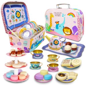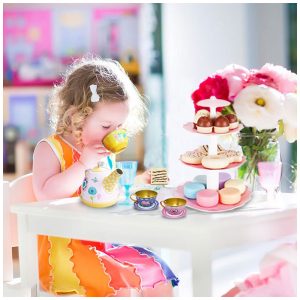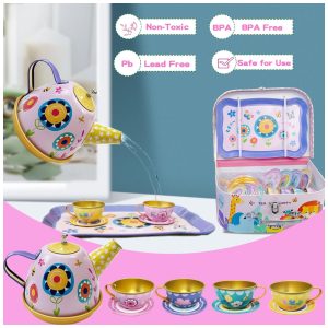 O brinquedo é seguro e durável, construído em lata durável e com bordas lisas, sem BPA e de fácil limpeza. Foi testado para atender aos padrões ASTM e CPSIA dos EUA. Este conjunto de festa de chá infantil é adequado para as meninas fingirem que estão interpretando e se divertirem com seus amigos.