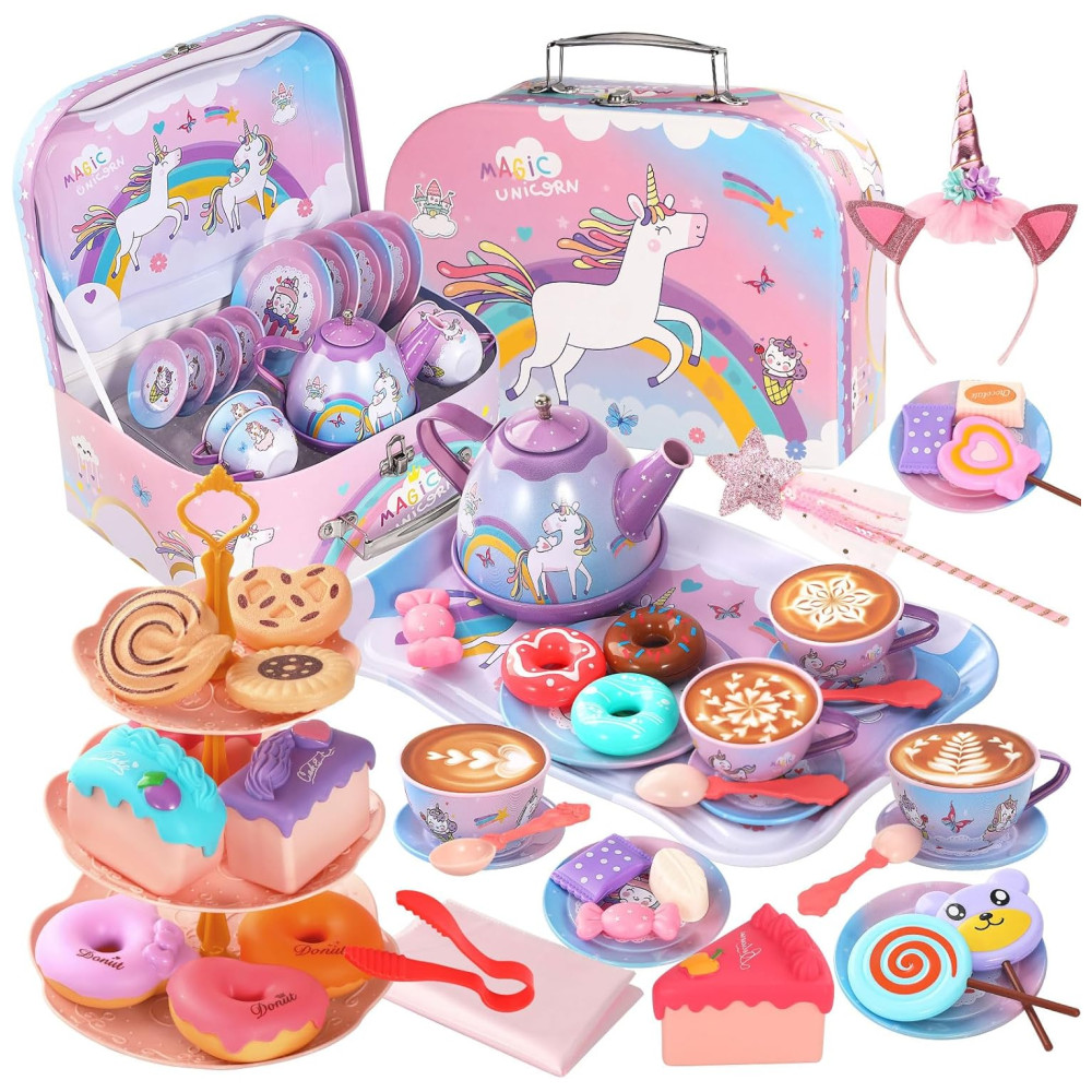 Jogo de Chá Infantil em Lata 55 Peças com Maleta de Transporte Tema de Unicórnio e Flores para Crianças Acima de 3 Anos Quiet Flower Rosa