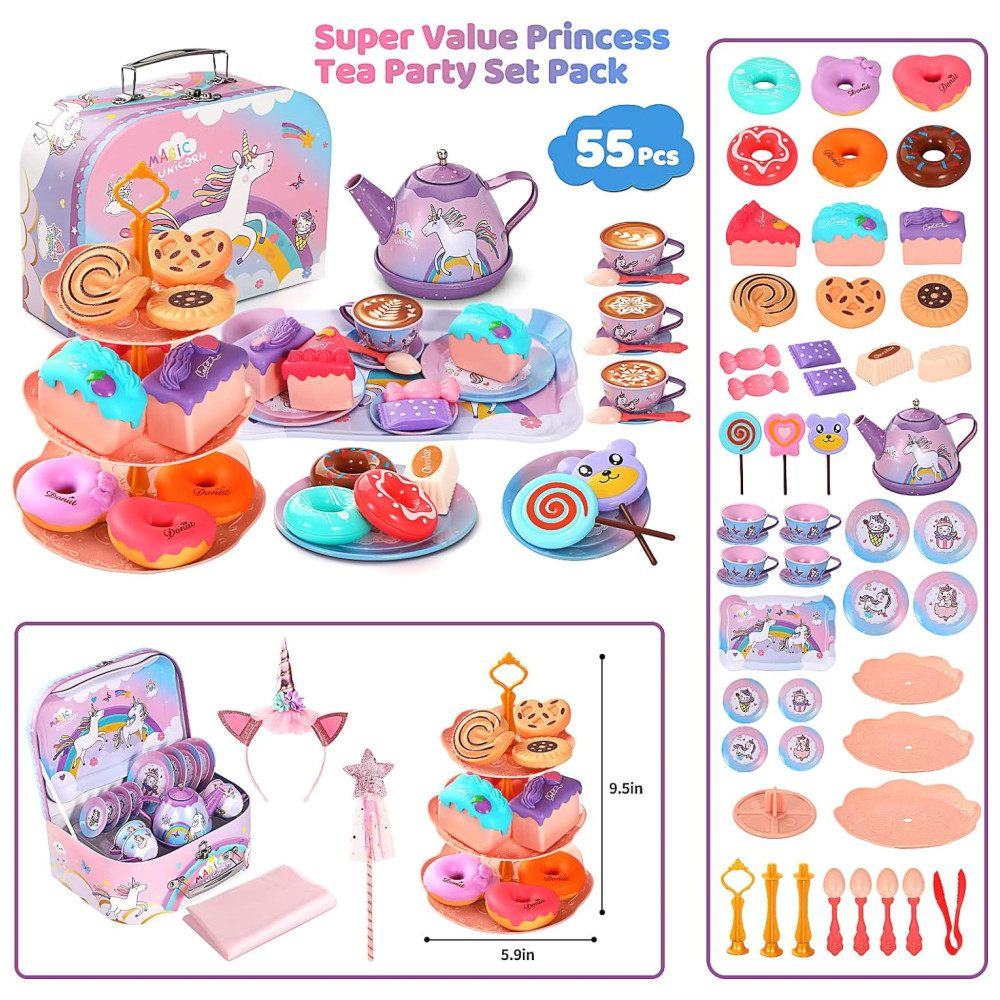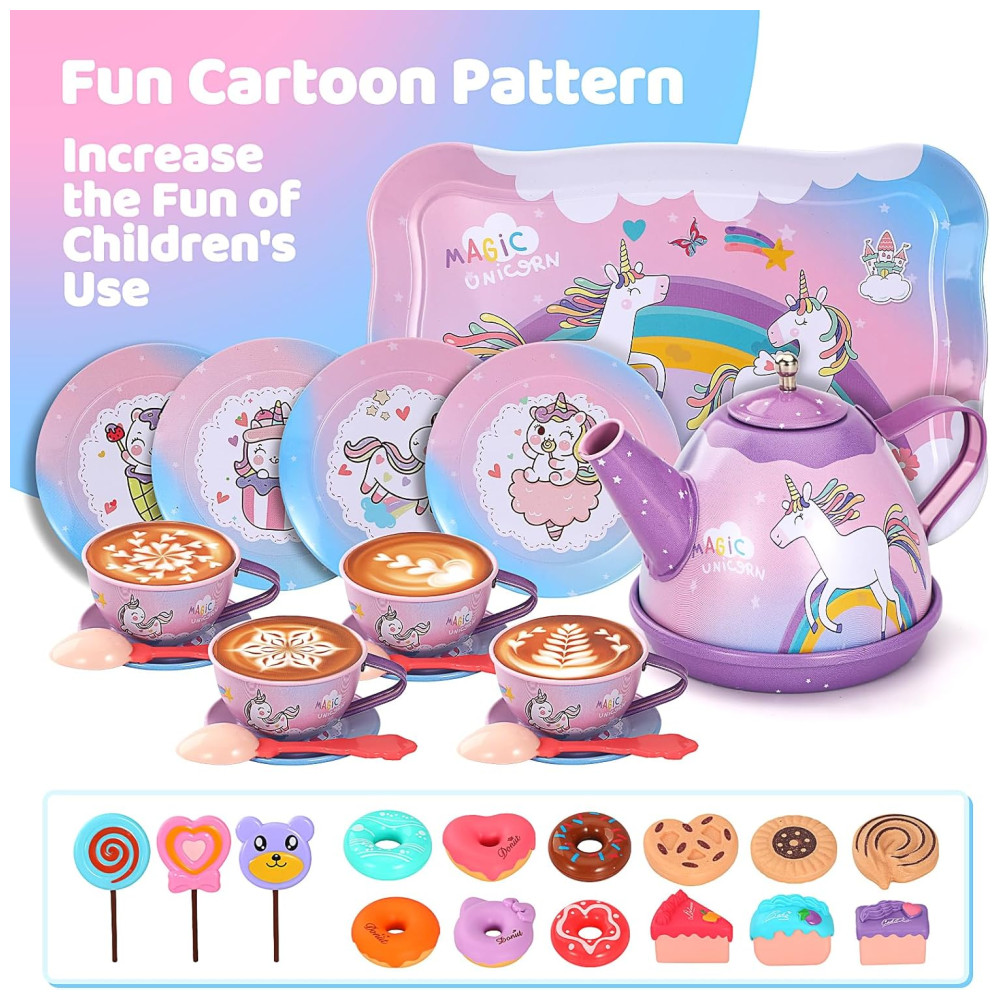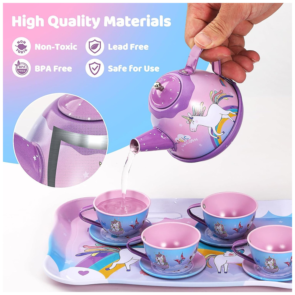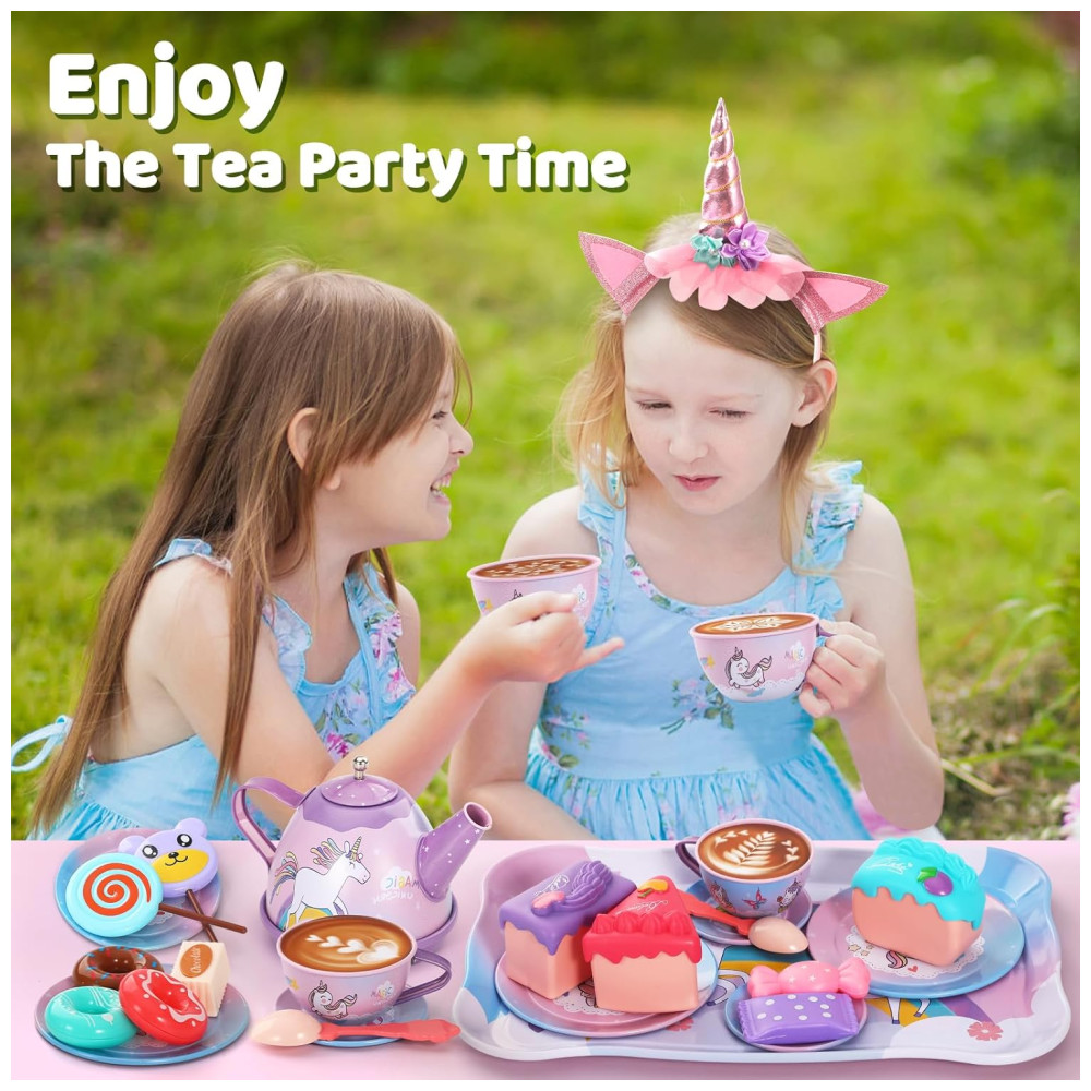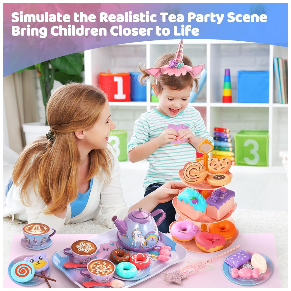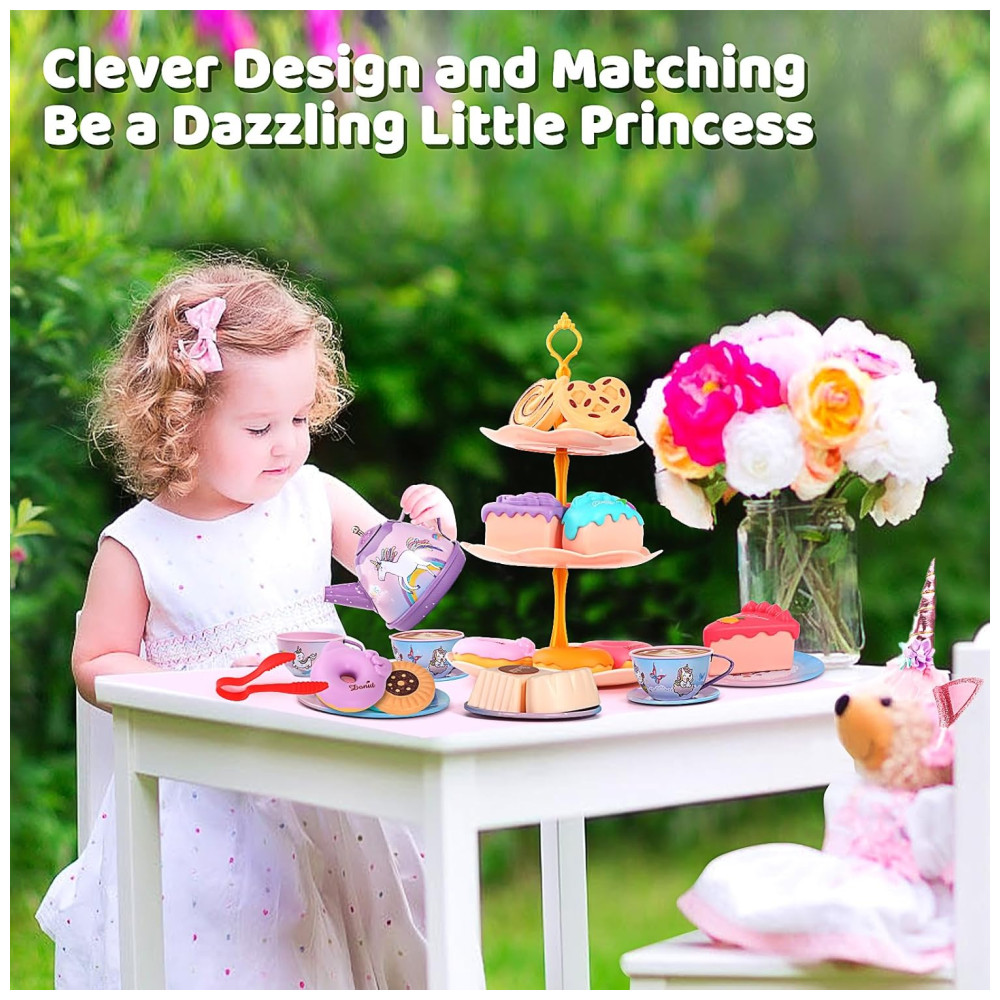 O conjunto de festa de chá infantil é adequado para 4 pessoas brincarem, crianças e pais participam juntos, estimulando a criatividade das crianças, desenvolvendo a cognição, promovendo o trabalho em equipe e melhorando as habilidades de linguagem e comunicação. O conjunto inclui bules, xícaras ou xícaras de café, pratos, colheres, suportes para bolo em camadas, sobremesas, toalhas de mesa e até mesmo bastões de fada da princesa e tiaras de unicórnio, tornando o uma escolha única para uma festa de chá de princesa inesquecível.
