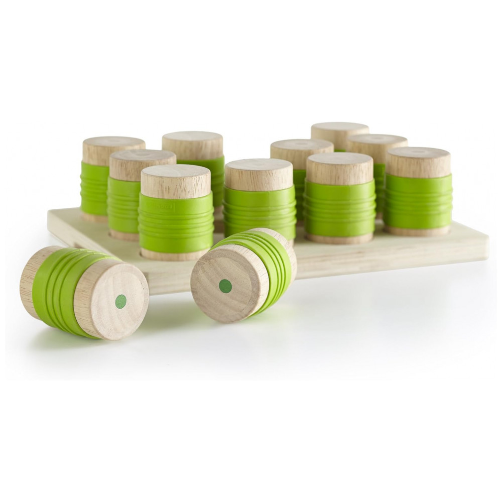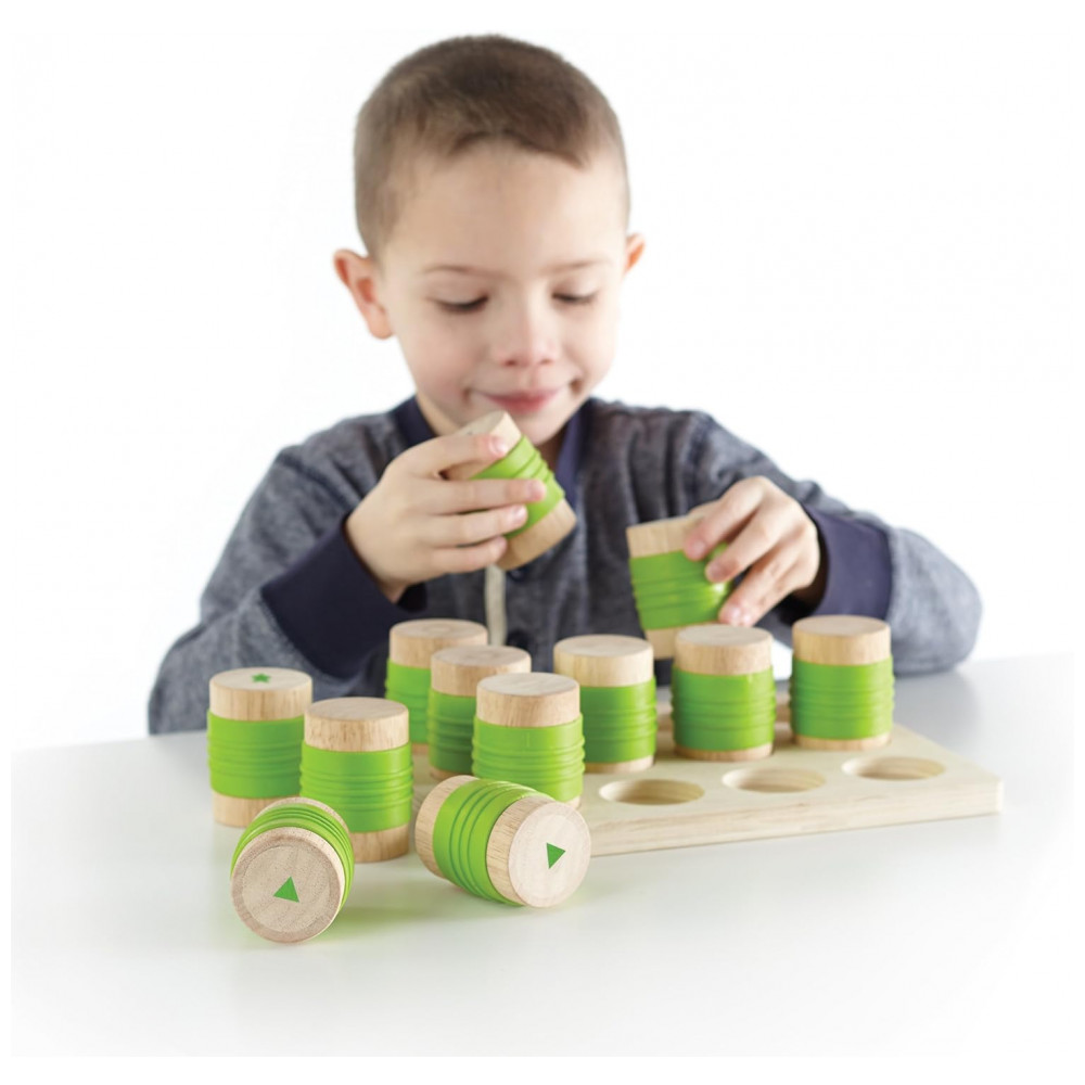 Na base dos cilindros há marcações em cores que funcionam como sistema de autocorreção, permitindo que a criança ou o educador confira rapidamente quais peças formam pares de peso correspondente. Esse brinquedo pedagógico apoia atividades estruturadas de triagem, categorização e exploração sensorial, contribuindo para o desenvolvimento cognitivo em contextos de aprendizagem guiada.
