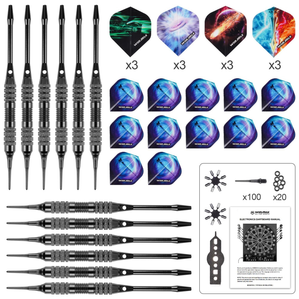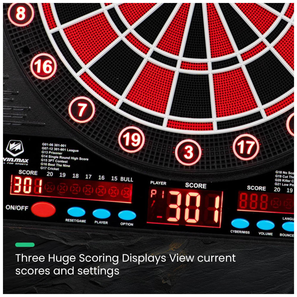 O Conjunto de Gabinete de Dardo Eletrônico WINMAX oferece uma experiência excepcional de diversão e entretenimento diretamente em sua casa. Equipado com um tabuleiro de dardos de ponta macia e um sofisticado placar eletrônico de LED, suporta até 8 jogadores simultaneamente. Os segmentos do alvo são de lâmina de alta qualidade, com furos padrão de 3 fileiras, linhas de separação ultrafinas e anéis de captura estendidos para facilitar o acompanhamento preciso dos lançamentos.
