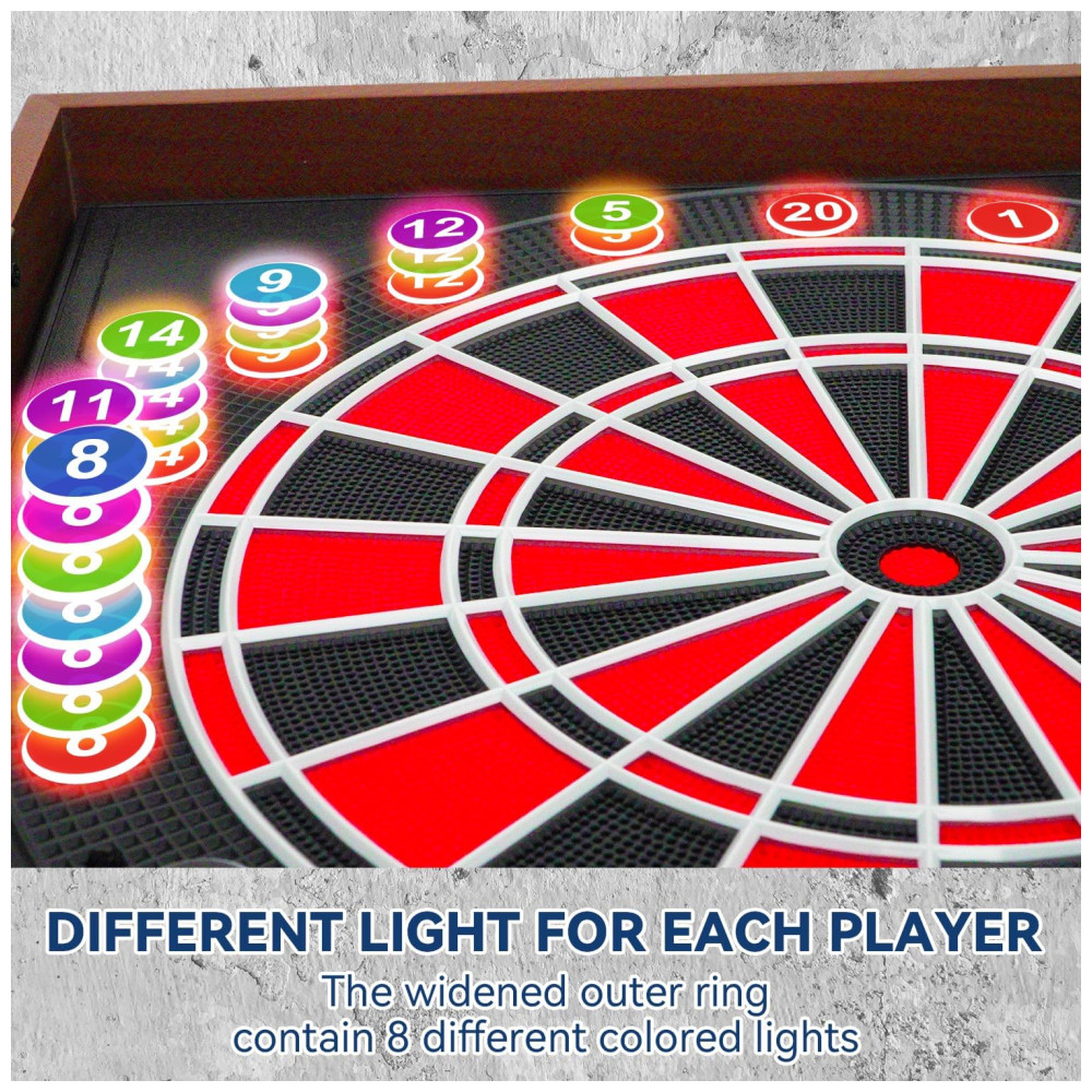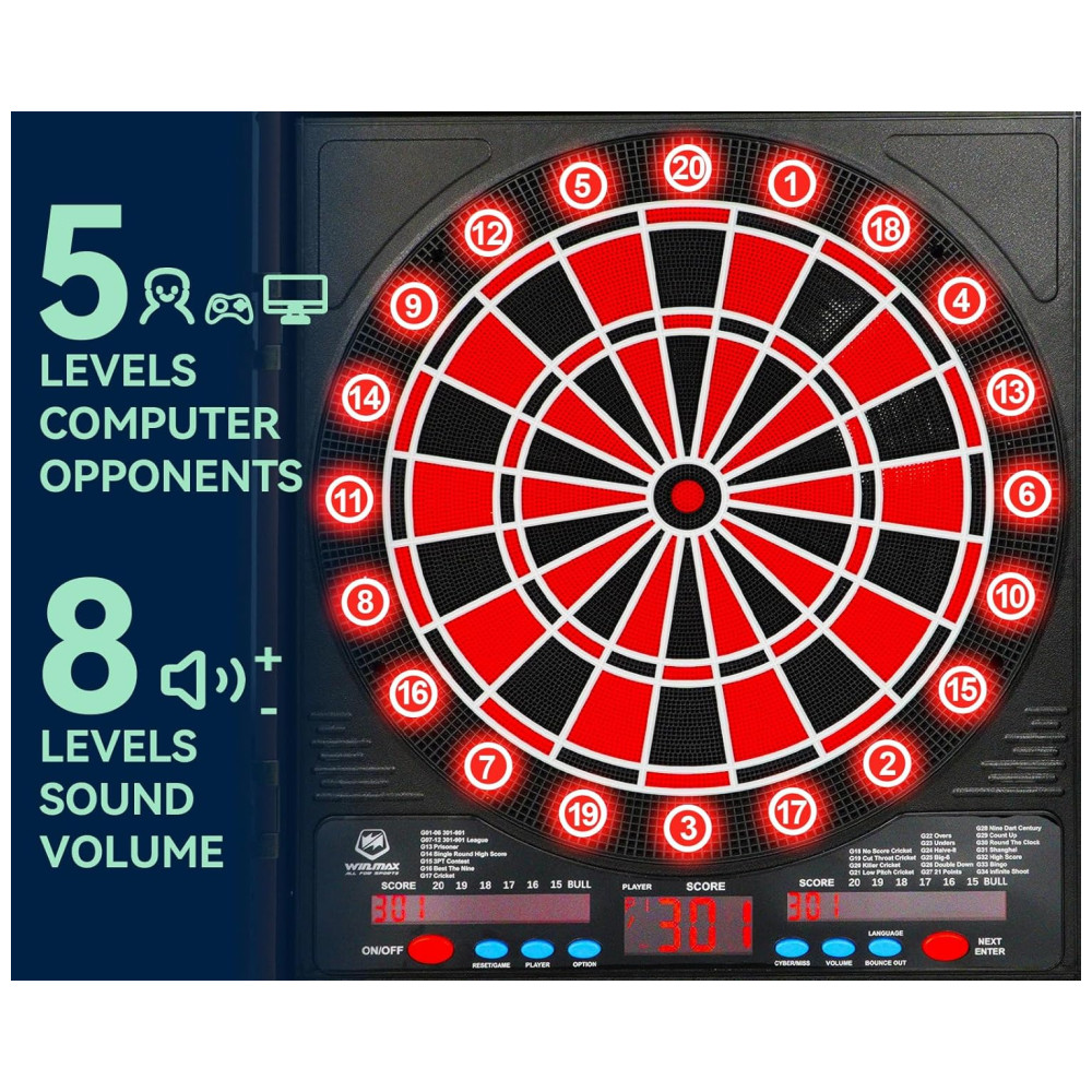 Com uma impressionante variedade de 34 jogos e 355 variações, até 8 jogadores podem participar simultaneamente. Além disso, há a opção de competir contra oponentes controlados pelo computador, oferecendo 5 níveis de dificuldade diferentes para desafiar suas habilidades. O dardo eletrônico pode ser alimentado pelo adaptador de energia incluído, permitindo que você o utilize em qualquer espaço sem ocupar mais espaço do que o necessário.