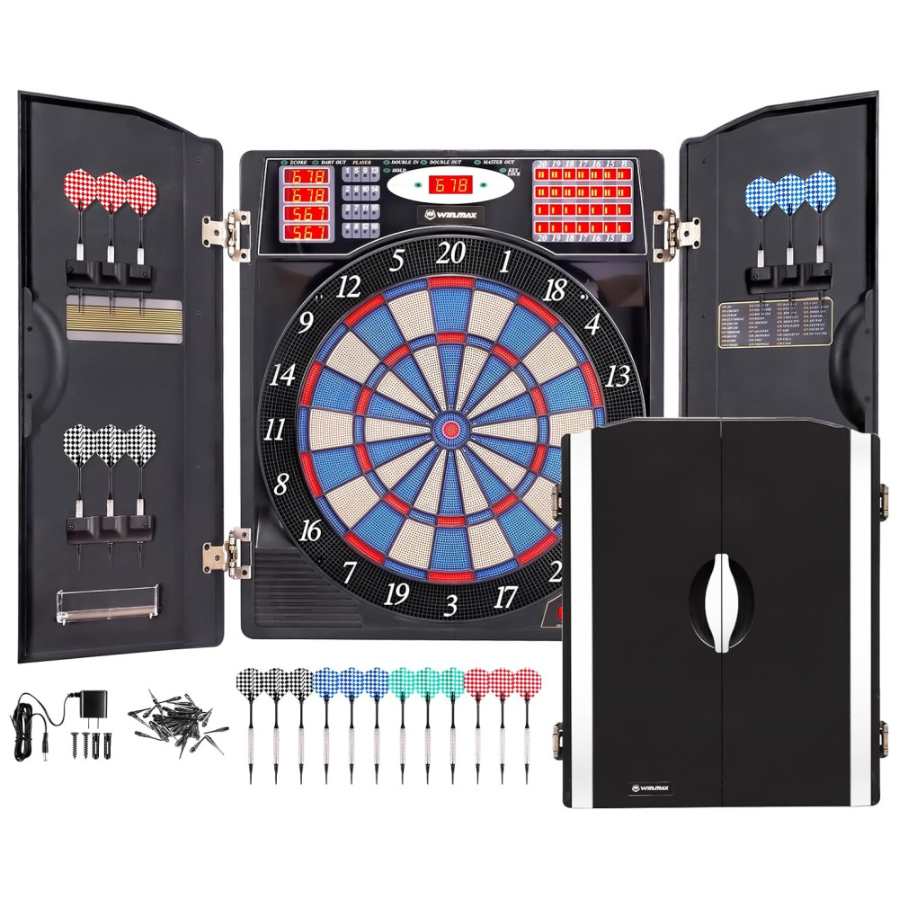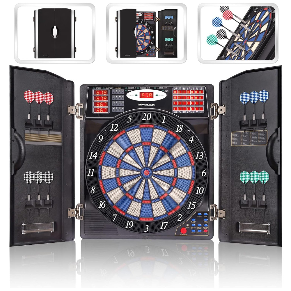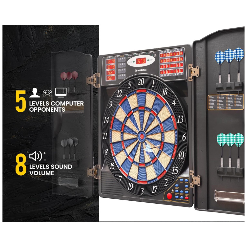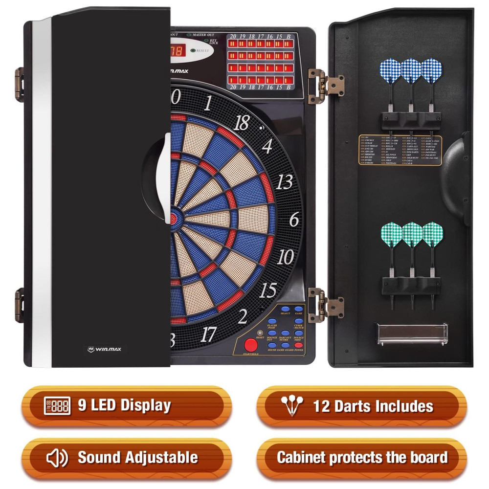 O elegante alvo de dardos eletrônico WINMAX possui um gabinete para espaço de armazenamento elegante e para ajudar a proteger as paredes contra danos e poeira. Possui portas de gabinete elegantes com 12 suportes de dardos de ponta macia para armazenamento integrados mantêm sua configuração organizada e com boa aparência.