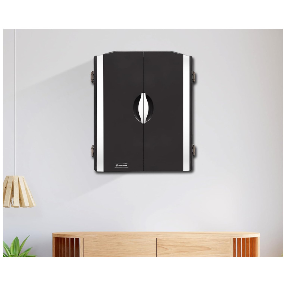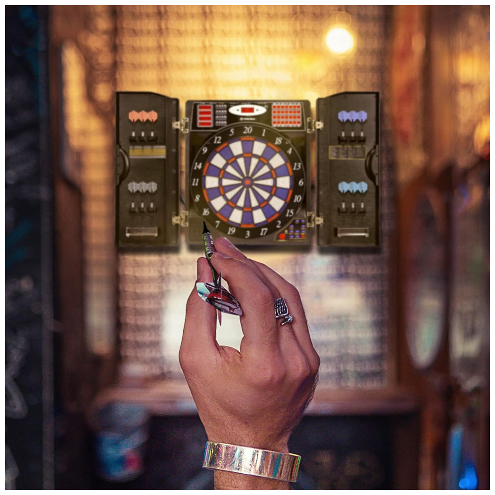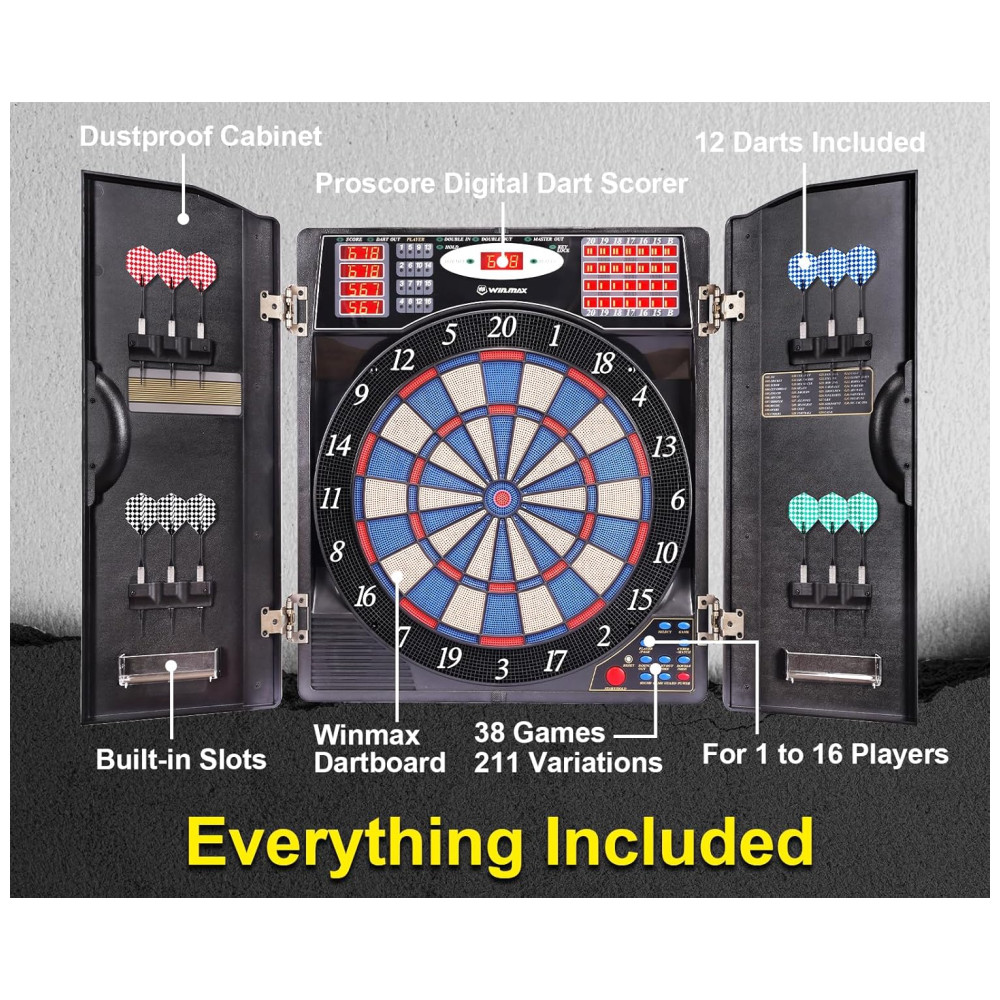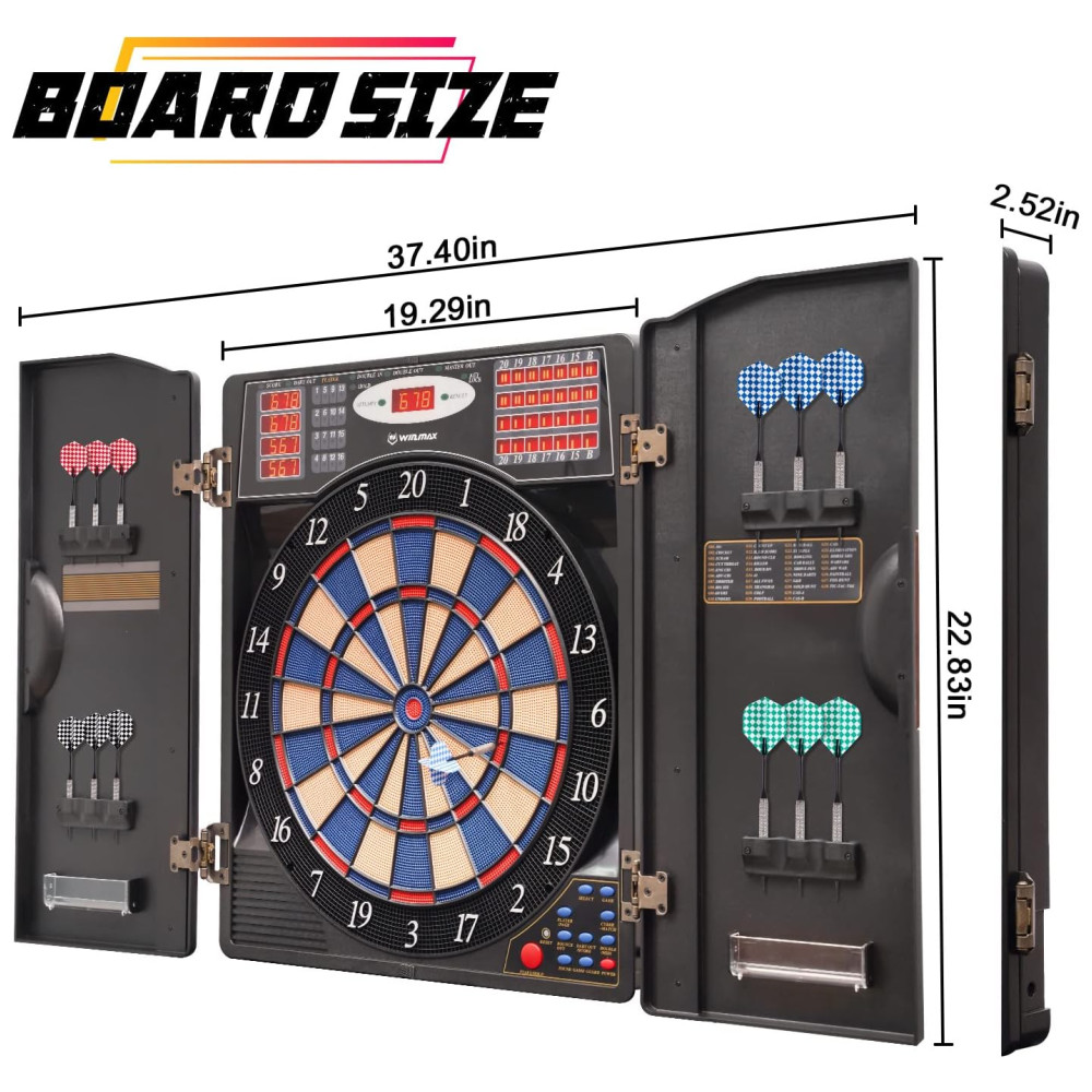 O elegante alvo de dardos eletrônico WINMAX possui um gabinete para espaço de armazenamento elegante e para ajudar a proteger as paredes contra danos e poeira. Possui portas de gabinete elegantes com 12 suportes de dardos de ponta macia para armazenamento integrados mantêm sua configuração organizada e com boa aparência.