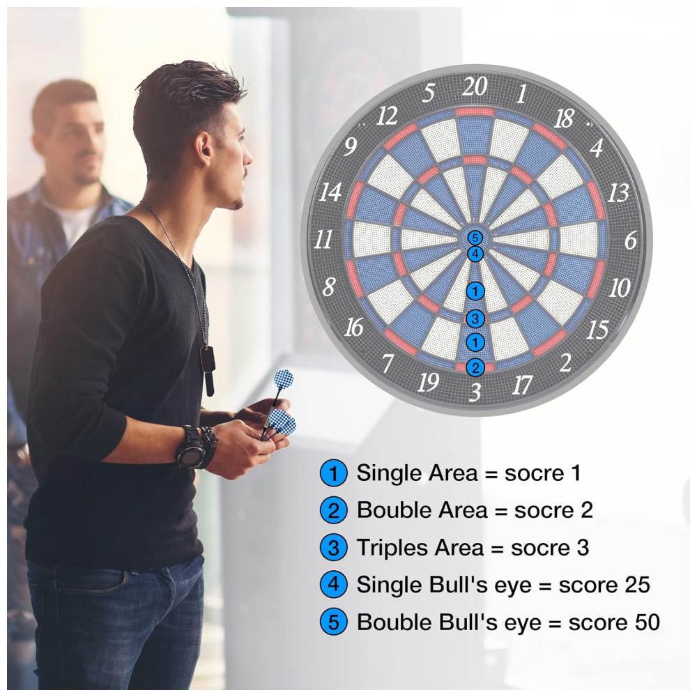 O alvo de dardos eletrônico WINMAX é um conjunto completo que inclui 12 dardos de ponta macia e 40 dardos sobressalentes. O alvo possui uma seção de dardo durável e um orifício padrão de 3 linhas que combina perfeitamente com a flecha, proporcionando um arremesso eficaz. Ele oferece inúmeras rodadas de jogos para manter o jogo funcionando e possui uma divisória ultrafina e empunhadura estendida para facilitar o rastreamento de todos os seus arremessos. Os efeitos de voz e som melhoram efetivamente a experiência de jogo.