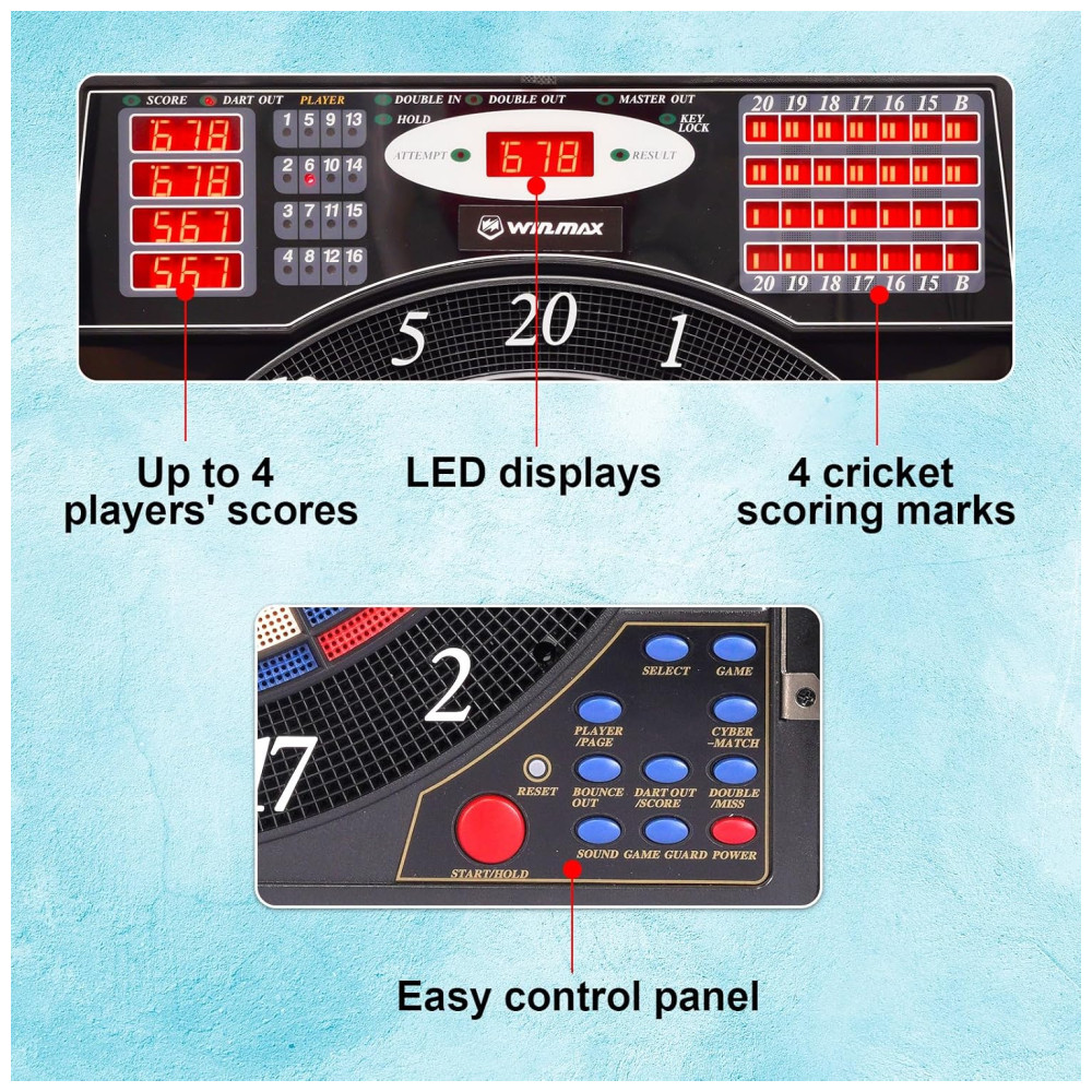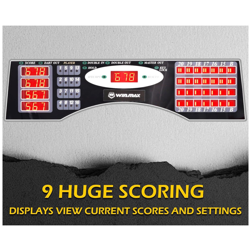 O alvo de dardos eletrônico WINMAX possui um design amigável, com um alvo de 34,29 cm, painel de controle de fácil leitura e display de pontuação LED brilhante que oferece uma visão cristalina da pontuação. Possui também anúncios de voz automatizados, 1 x alto falantes, volume de som ajustável de 07 níveis a 8 níveis e modo mudo.