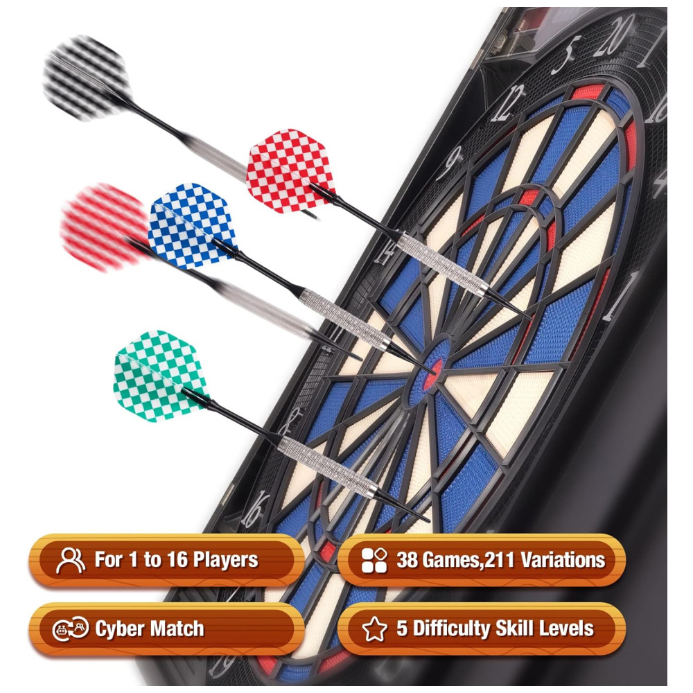 O alvo de dardos eletrônico WINMAX vem com 38 tipos de jogos populares e 211 variações, incluindo Scram, Cricket, Count Up e muitos mais. Até 16 jogadores podem participar do jogo, maximizando a diversão. Além disso, você também tem a opção de jogar contra oponentes de computador com 5 níveis de dificuldade diferentes, adequado para crianças, adultos e jogadores, de iniciantes a profissionais.