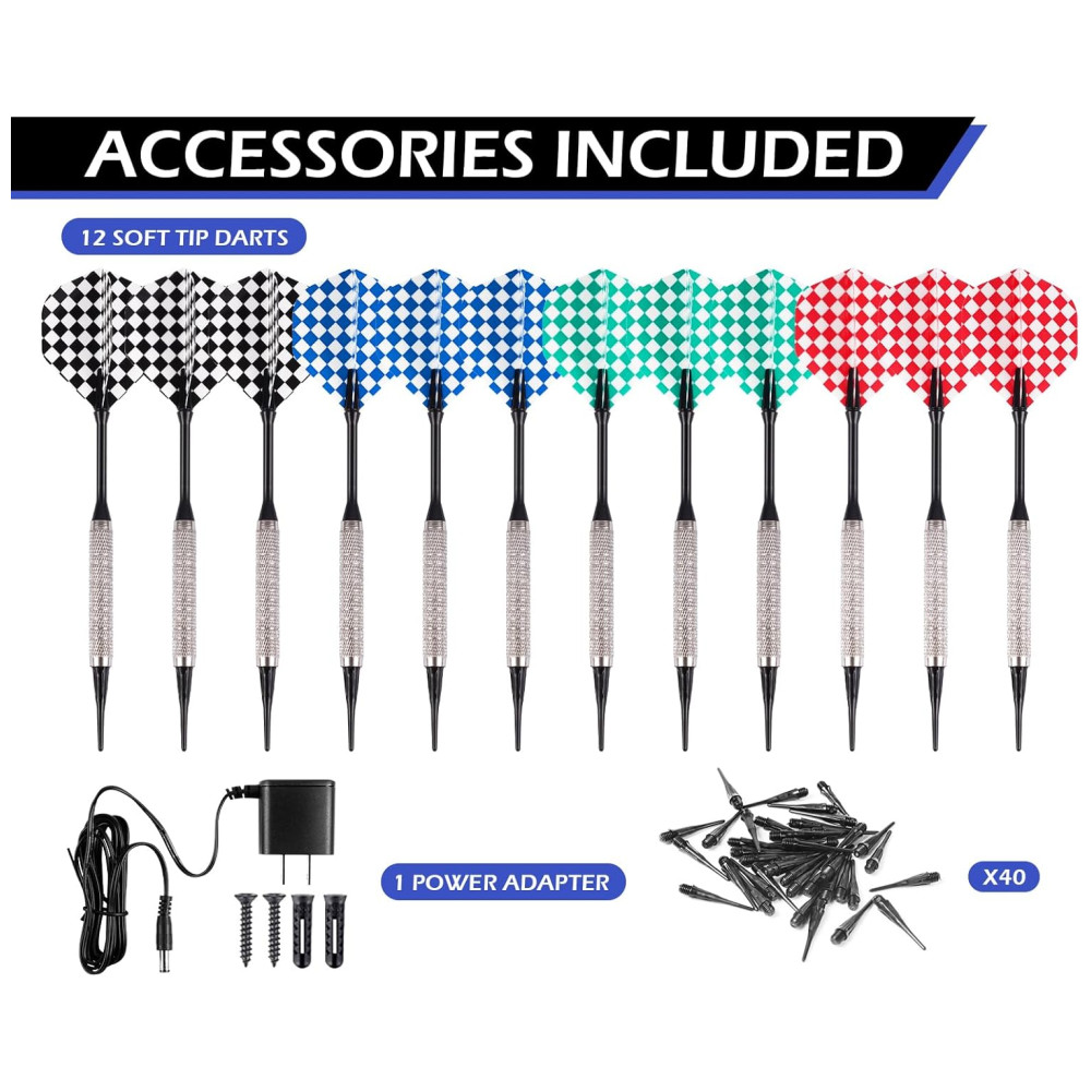 O conjunto de acessórios incluídos vem com 12 dardos de ponta macia premium, 40 pontas macias extras de reposição para festas e competições de adultos, adaptador de energia, manual de instruções em vários idiomas, hardware de montagem para fácil configuração. O alvo de dardos eletrônico WINMAX é um ótimo complemento para qualquer sala de jogos, porão, sala de recreação ou bares, pois pode ser jogado em qualquer lugar sem ocupar mais espaço