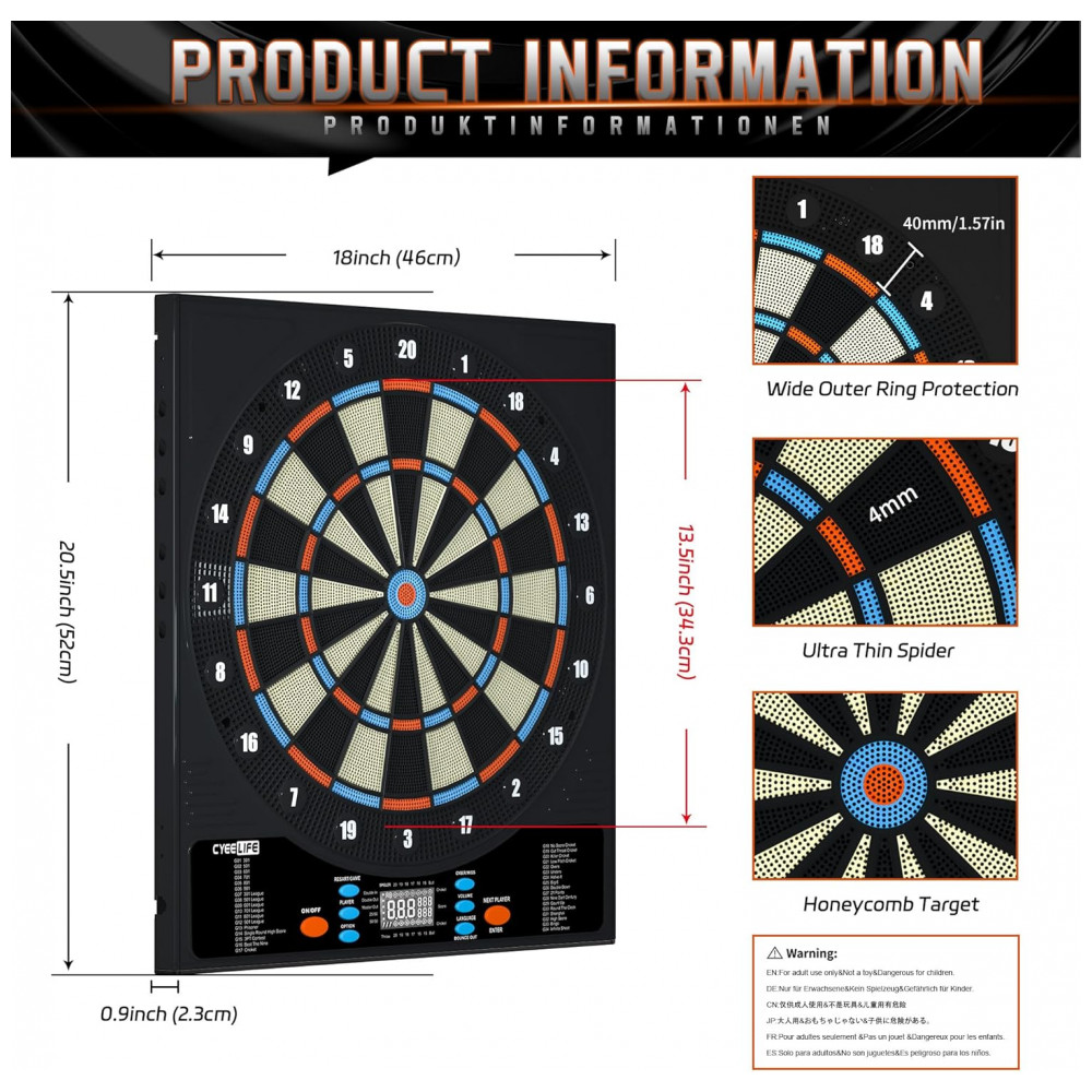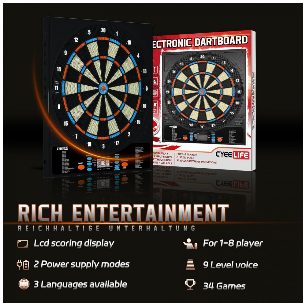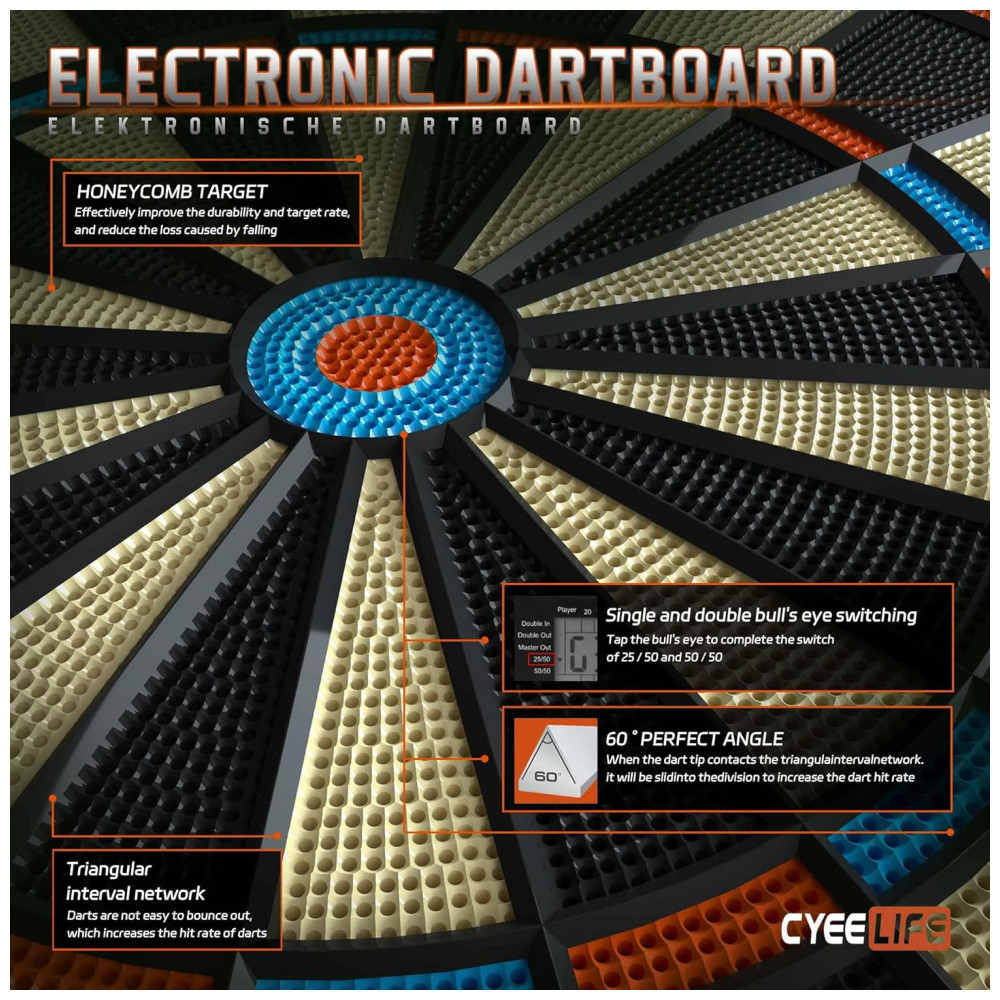 Desfrute de uma experiência de jogo moderna e emocionante com o tabuleiro de dardos eletrônico CyeeLife, ideal para partidas casuais ou competitivas.