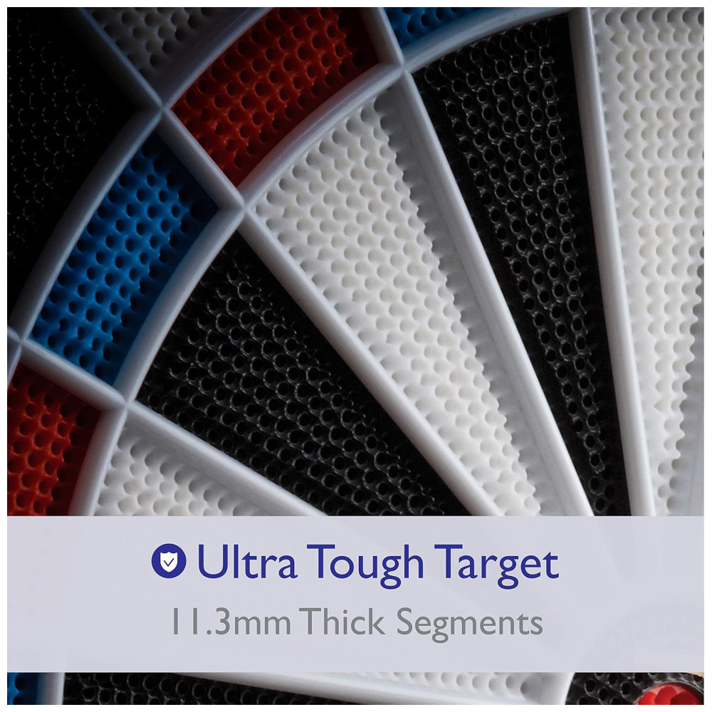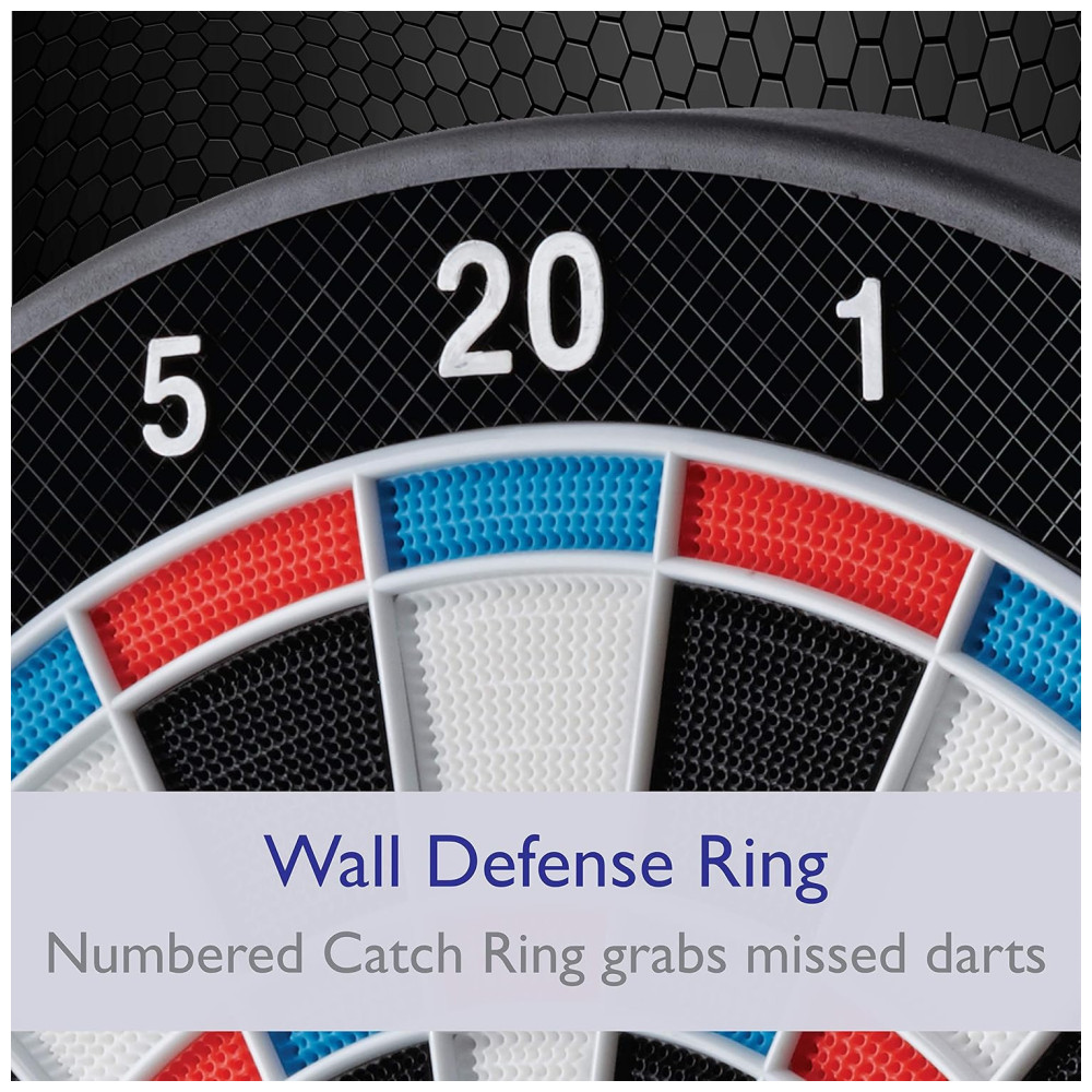 A estrutura ultrafina reduz significativamente os rebotes, permitindo agrupamentos mais próximos de dardos e maior pontuação. Além disso, inclui um anel de proteção ao redor do alvo para proteger a parede contra arremessos errados.