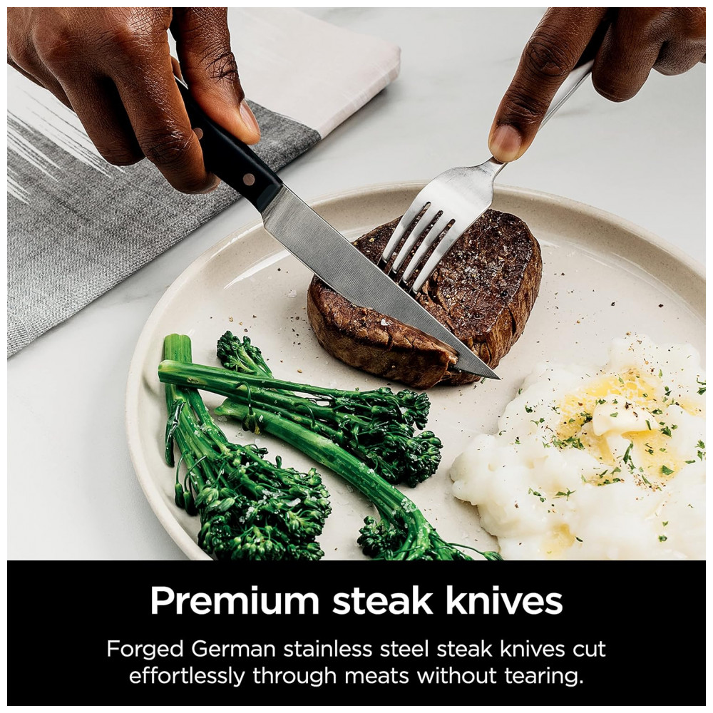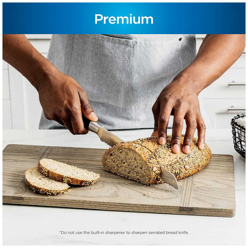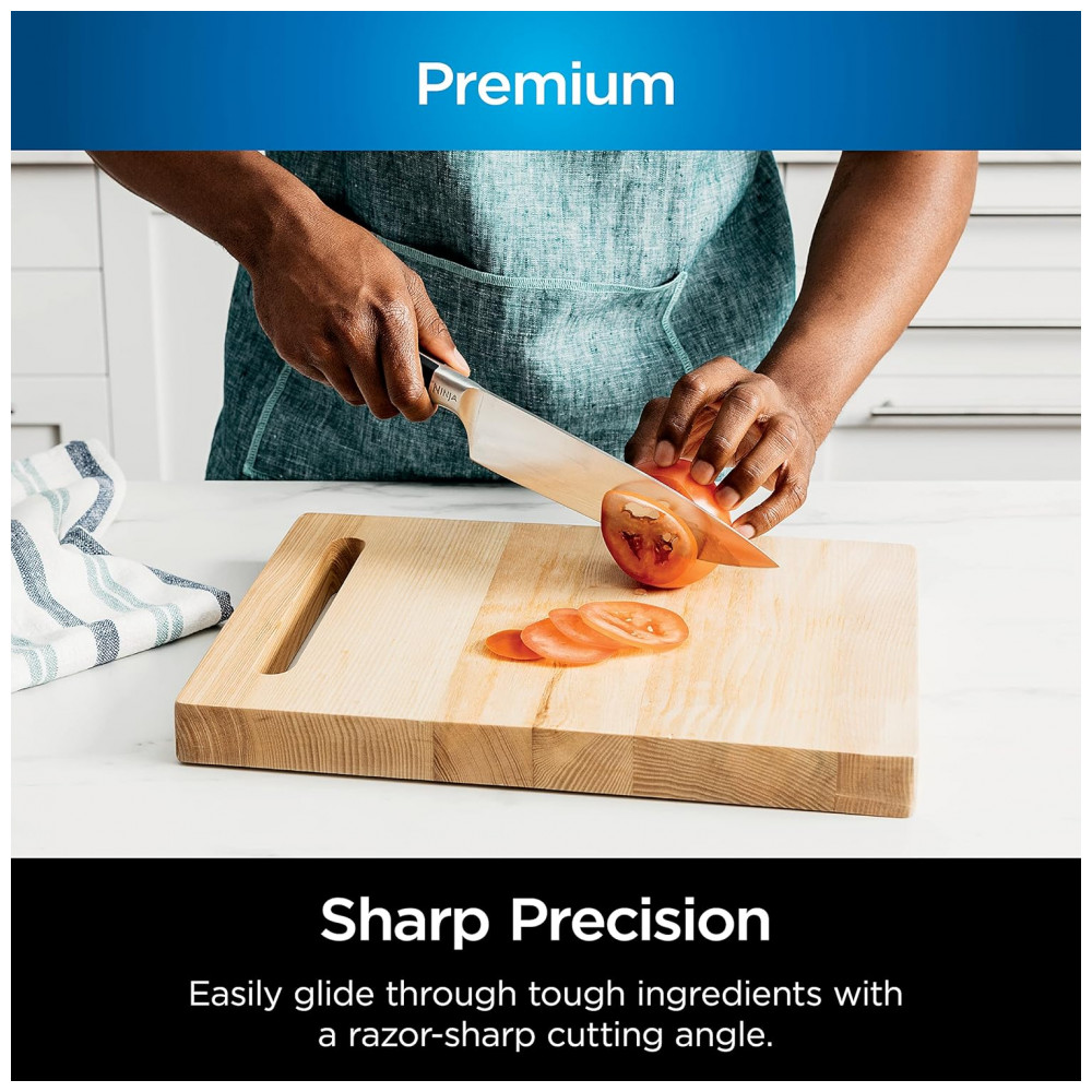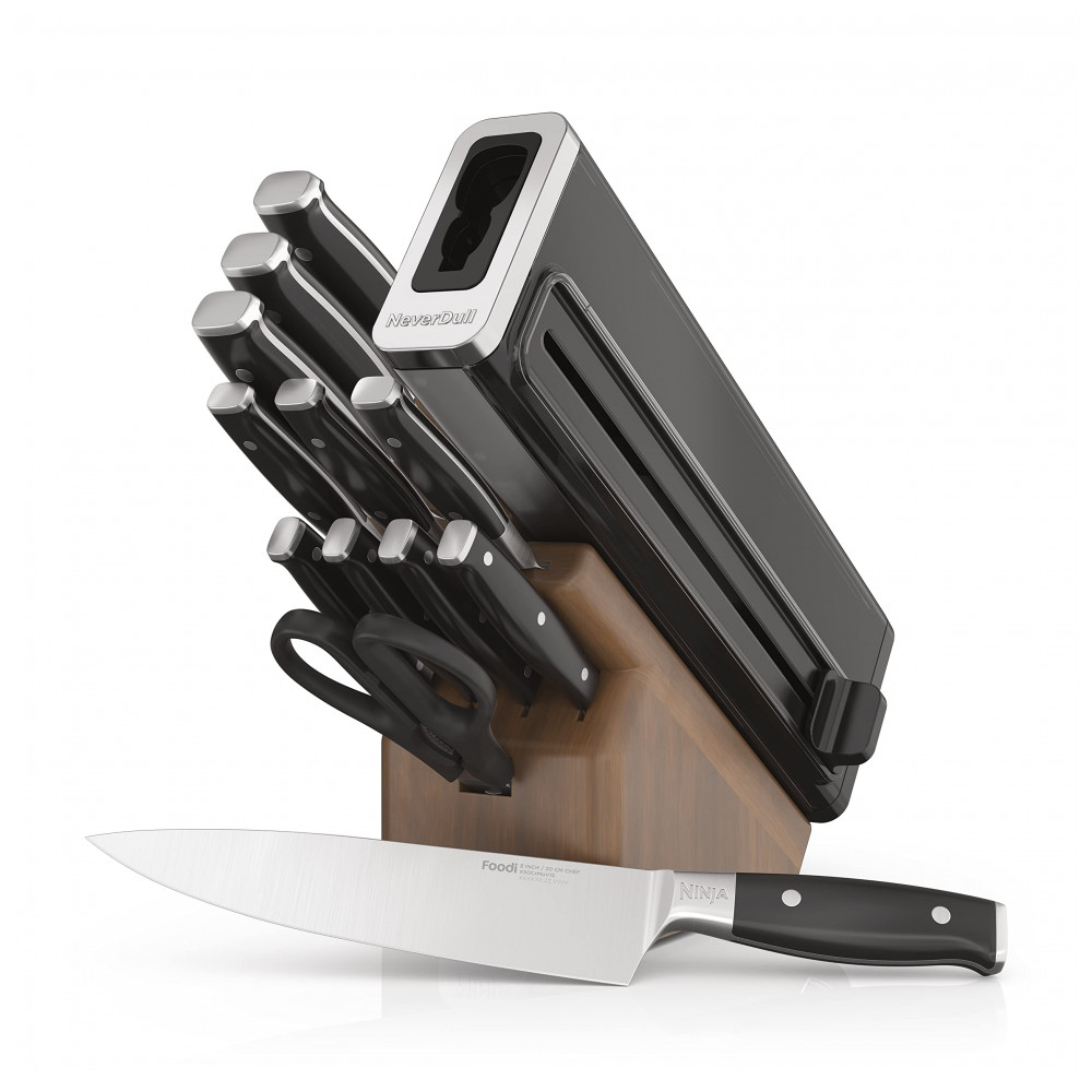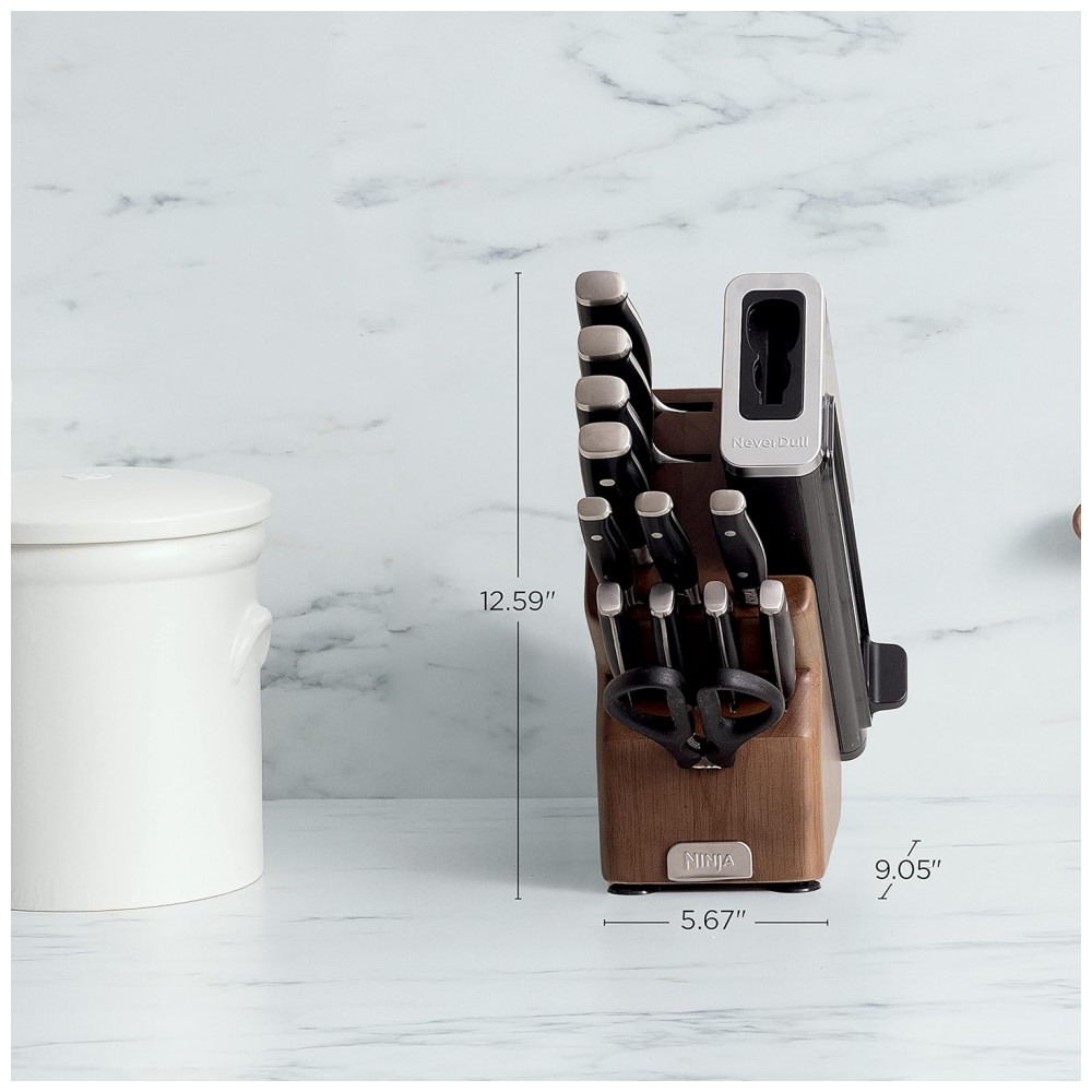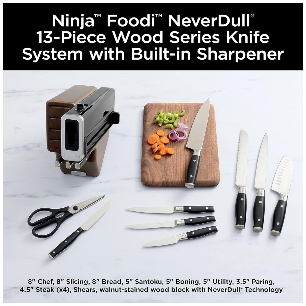 O jogo de facas Ninja NeverDull Wood Series 13 peças foi desenvolvido para uso intenso em cozinha doméstica, reunindo lâminas em aço inoxidável de origem alemã, bloco de madeira e sistema de afiação integrado. As lâminas forjadas com construção full tang oferecem alto poder de corte e boa precisão em tarefas como fatiar, picar e cortar diferentes tipos de alimentos.