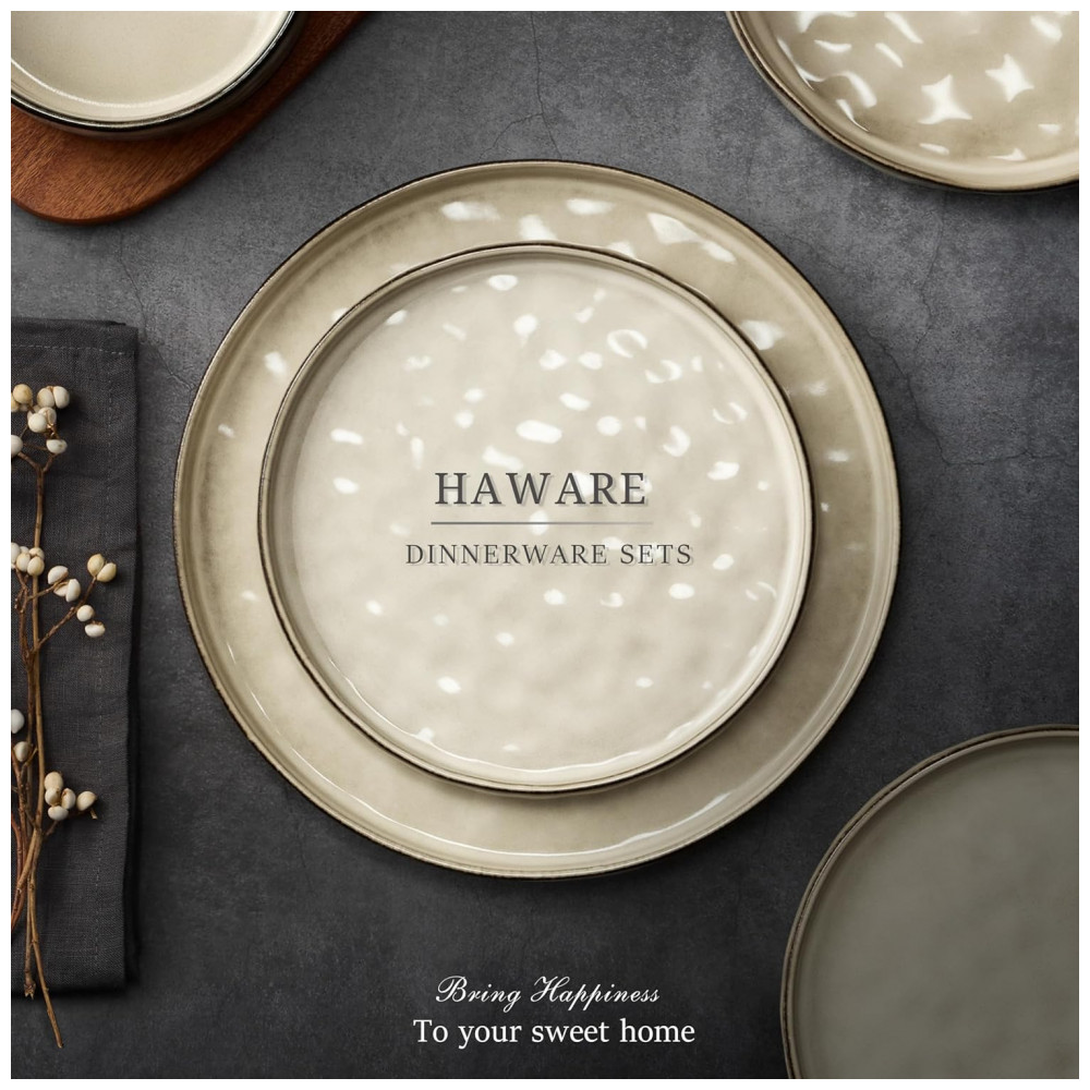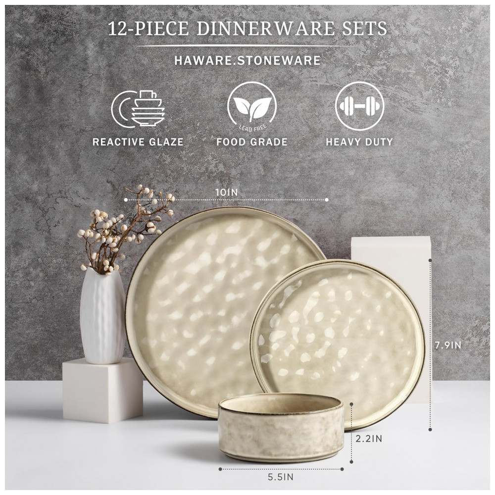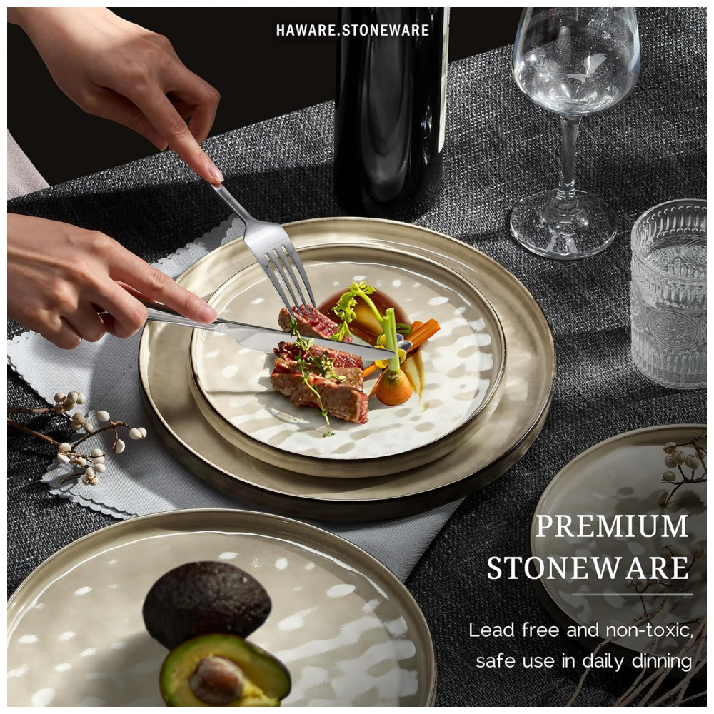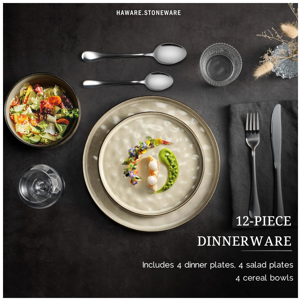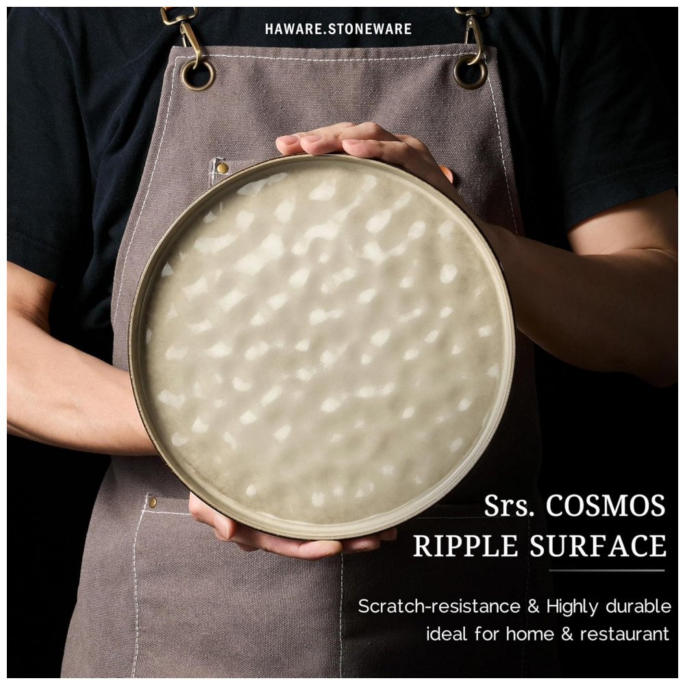O conjunto de louças HaWare COSMOS é composto por 12 peças, incluindo 4 pratos grandes de 26 cm, 4 pratos de salada de 20 cm e 4 tigelas redondas de 14 cm com capacidade de 770 ml, ideal para servir 4 pessoas. Feito em stoneware de alta qualidade, livre de chumbo e cádmio, apresenta superfície vítrea texturizada com efeito ondulado que imita planetas, conferindo elegância ao seu uso diário ou em ocasiões especiais.