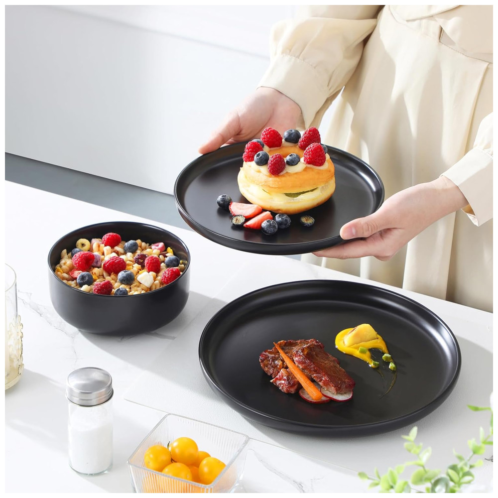 Receba um conjunto completo e elegante com 12 peças: 4 pratos de jantar (aprox. 26 cm), 4 pratos de salada (aprox. 21 cm) e 4 tigelas de cereal (aprox. 770 ml). Feito de argila de porcelana ORC e com temperatura de queima elevada, este conjunto é resistente a riscos e calor, garantindo durabilidade. Com tecnologia de esmalte GLIDECOAT, é fácil de limpar, resistente a manchas e odores, além de ser livre de chumbo. Aprovado para uso em lava-louças e micro-ondas, garantindo praticidade. O design plano e moderno permite empilhamento eficiente, economizando espaço na sua cozinha.