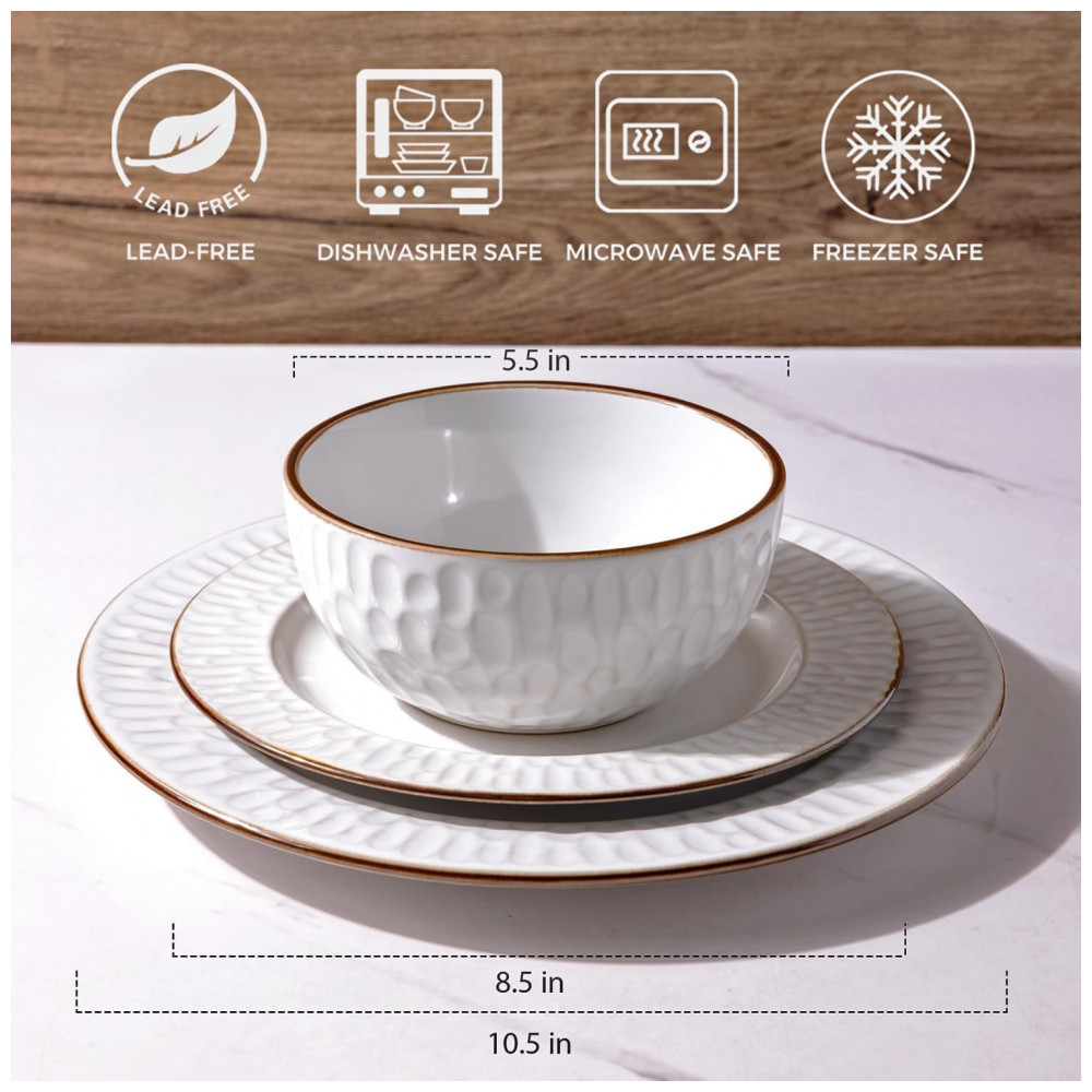 O nosso conjunto de louça em cerâmica de 12 peças apresenta um design moderno e elegante em alto-relevo, tornando seu prato e tigela os protagonistas da mesa. O esmalte é branco puro como a neve com leve relevo e bordas escurecidas, conferindo um visual ultra sofisticado e belo. Este conjunto de louça branca é resistente o suficiente para uso diário da família, mas sofisticado o bastante para aquela importante festa de jantar ou evento especial. Perfeito para presentes de casamento e chá de casa nova. LIVRE DE CHUMBO E CÁDMIO. Nossos conjuntos de pratos e tigelas são feitos de materiais naturais e assados a 2300 de alta temperatura por cerca de 17 horas, garantindo que sejam completamente seguros. Cada um é adornado com um esmalte totalmente natural que garante que sejam livres de chumbo e cádmio e não causem danos à sua família. Este conjunto de louça é SEGURO PARA MICRO-ONDAS, LAVA-LOUÇAS e FREEZER. Empilháveis e RESISTENTES A ARRANHÕES. O design único em formato redondo torna-os fáceis de empilhar e se encaixam bem sem ocupar muito espaço. Feito de stoneware durável, este conjunto de louça resistente tem um lado interno do prato e da tigela com um esmalte brilhante resistente a arranhões, que evita riscos ao empilhar ou no uso diário. O QUE VOCÊ IRÁ RECEBER. Este conjunto de louça em cerâmica de 12 peças inclui 4 pratos de jantar, 4 pratos de aperitivo/lanches/saladas e 4 tigelas de sopa/cereal de 5,75 polegadas, sendo um ótimo conjunto para 4 pessoas. Cada conjunto é cuidadosamente embalado e inspecionado para garantir que não se quebrem durante o transporte. Uma vez que o tenha, acredite, não conseguirá esperar para usá-lo em sua próxima festa de jantar. COMPROMISSO GBHOME. Apoiamos a GBHOME com profissionalismo e compromisso de atender aos nossos clientes. Valorizamos nossos clientes e oferecemos excelente atendimento pós-venda. Você pode contar com suporte de alta qualidade e assistência. Se tiver algum problema, não hesite em nos informar.