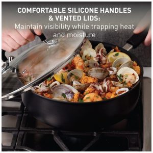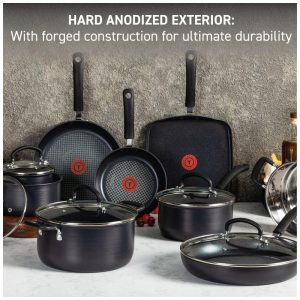 Este conjunto de panelas antiaderente Tfal Ultimate Hard Anodized é perfeito para todas as aventuras culinárias da vida. Com construção robusta em alumínio anodizado duro, apresenta o sistema de domínio de calor da Tfal, garantindo resultados de cozimento perfeitamente deliciosos. A tecnologia ThermoSpot patenteada indica quando a panela está pré-aquecida para alimentos uniformemente cozidos. Com revestimento antiaderente superior e duradouro, base resistente a deformações e calor uniforme, estas panelas oferecem resistência suprema à corrosão, arranhões e danos, proporcionando confiabilidade diária. Além disso, o revestimento interior não aderente reforçado com titânio evita situações frustrantes de alimentos grudados. Seguro para forno e lava-louças, este conjunto oferece versatilidade multipropósito com uma variedade de panelas – fritar, dourar, refogar, cozinhar a vapor, cozinhar lentamente e mais. Com alças de silicone e tampas de vidro temperado, este conjunto é resistente e durável, adequado para todas as suas necessidades culinárias.