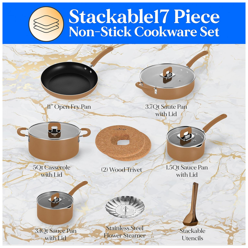 CONJUNTO DE 17 PEÇAS: O conjunto de panelas antiaderentes NutriChef de 17 peças inclui panela de molho de 1,42 litros 2,93 litros, caçarola de 4,73 litros, frigideira de 3,49 litros, tampas, frigideira de 28 centimetros, vaporizador de flores, 2 tripés de madeira, utensílio de náilon empilhável espátula, garfo de macarrão, colher, escumadeira, assento de ferramenta.